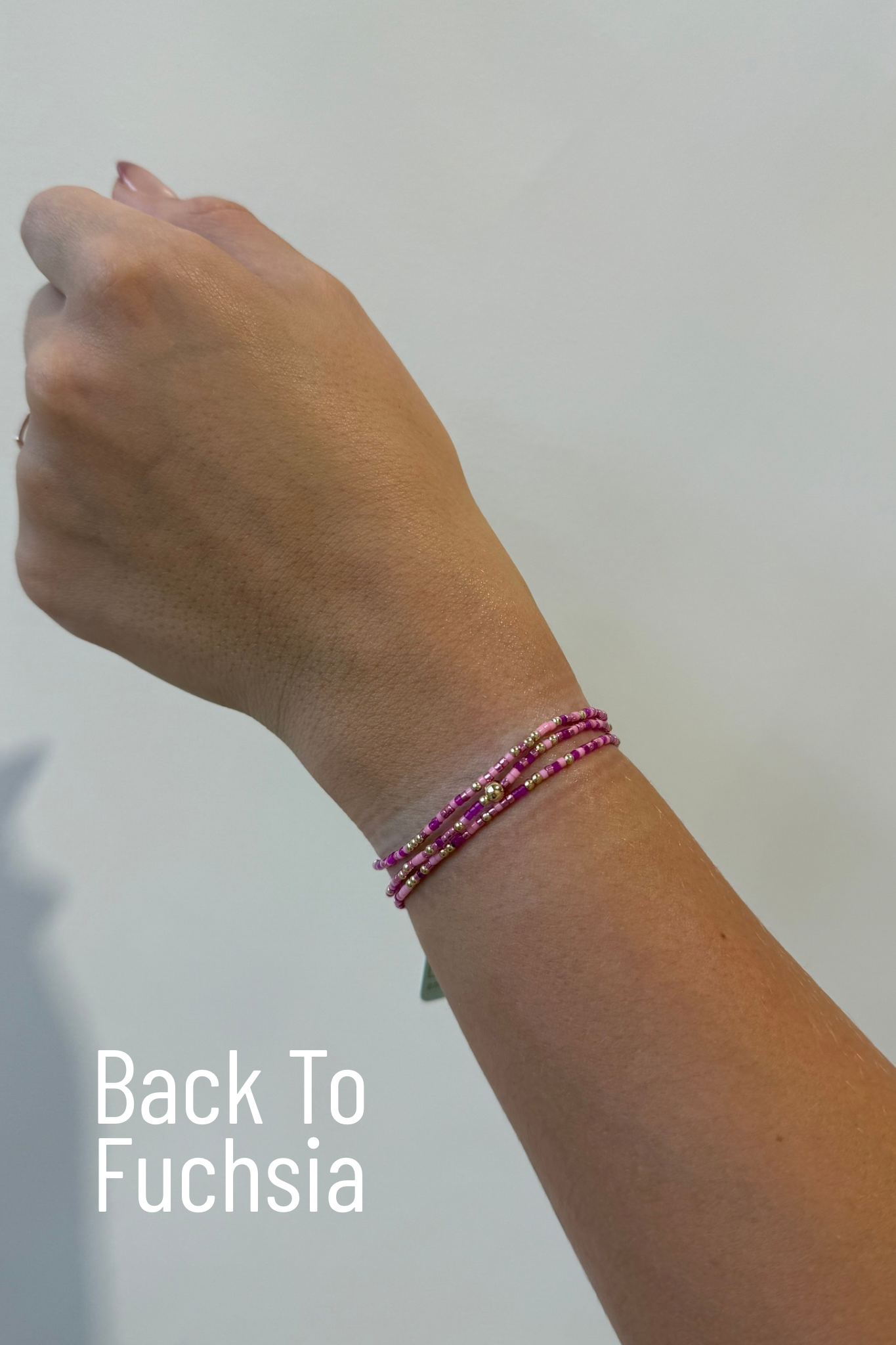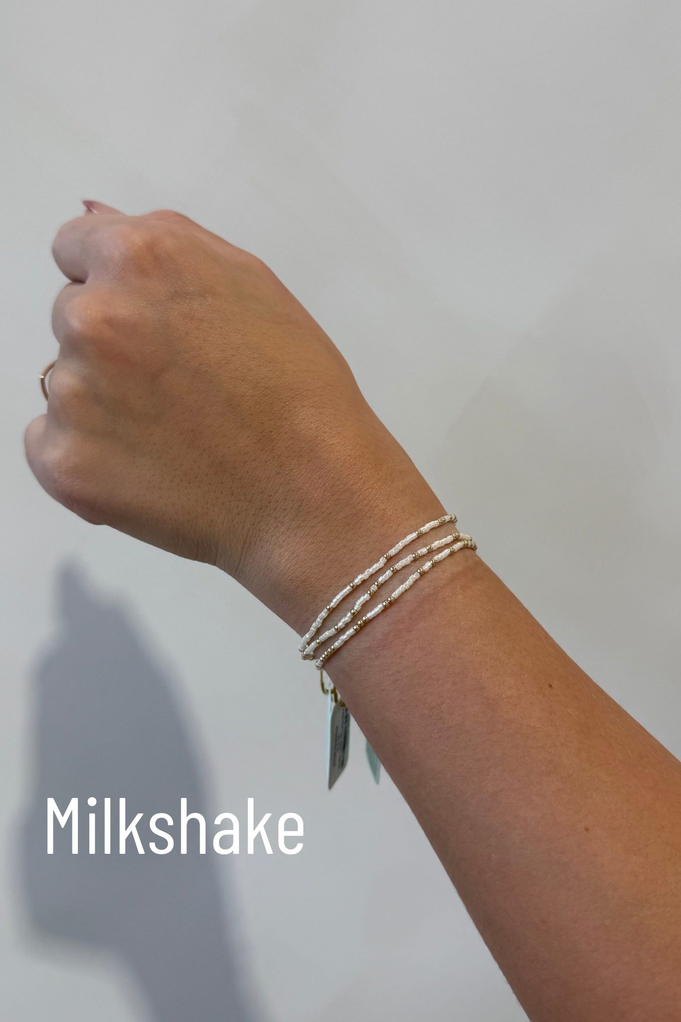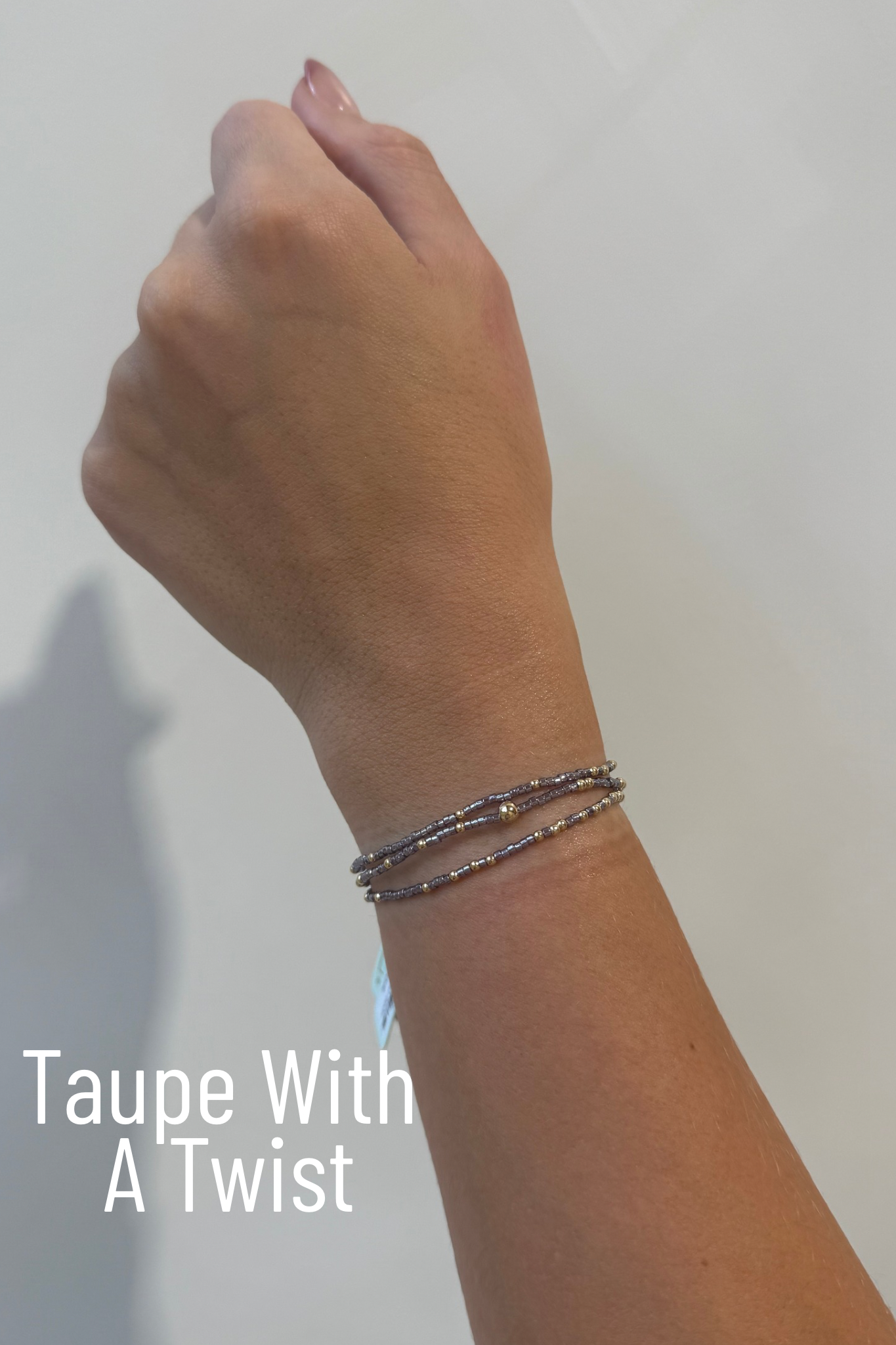 Hand beaded on high performance elastic for a slight stretch to easily roll on and off your wrist