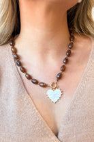 Brown Beaded Natural Stone w/ Pearlized Heart Charm Necklace