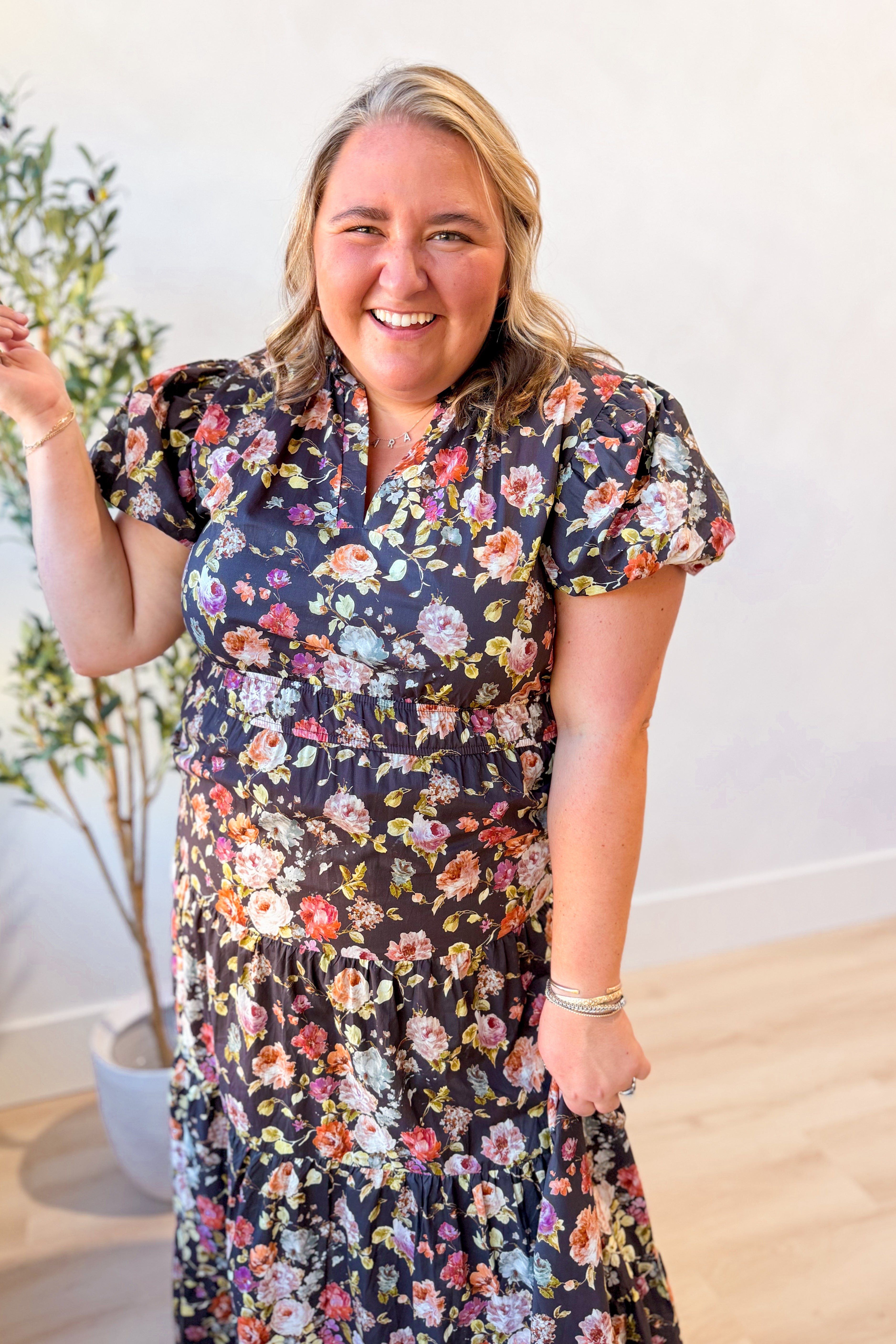 This playful midi dress features charming puff sleeves and a sweet floral print that brings a fresh, fun vibe. The short sleeves and split neck add a flirty touch, while the smocked waist ensures a flattering fit that moves with you. Perfect for any occasion where you want to feel effortlessly stylish and comfortable.