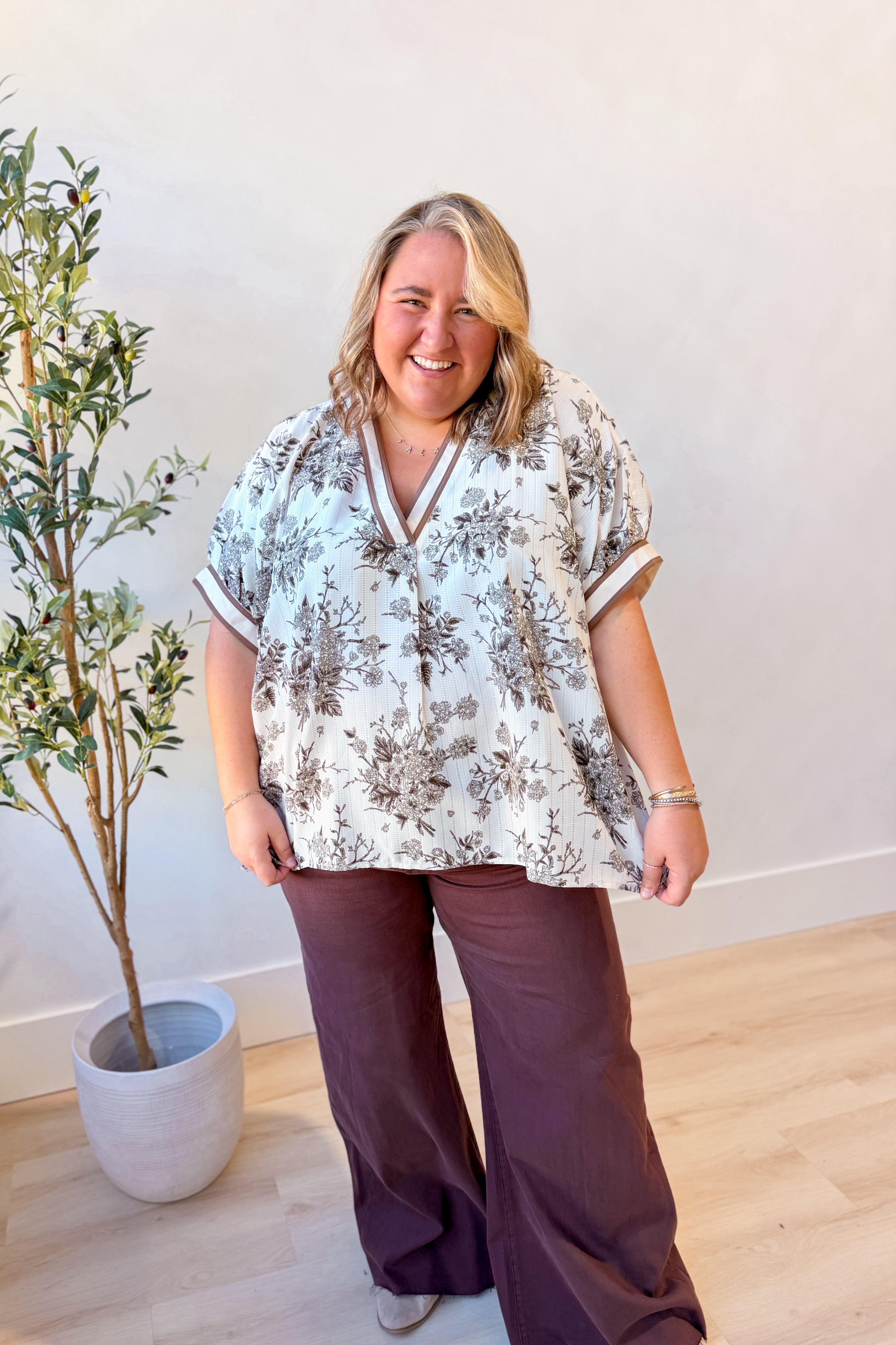 Embrace effortless charm with the Taylor Floral Split Neck Top by Entro. This flowy short-sleeve blouse features a playful floral pattern contrasted by a solid trim and a breezy split neck, perfect for adding a touch of whimsy to your everyday look.