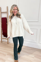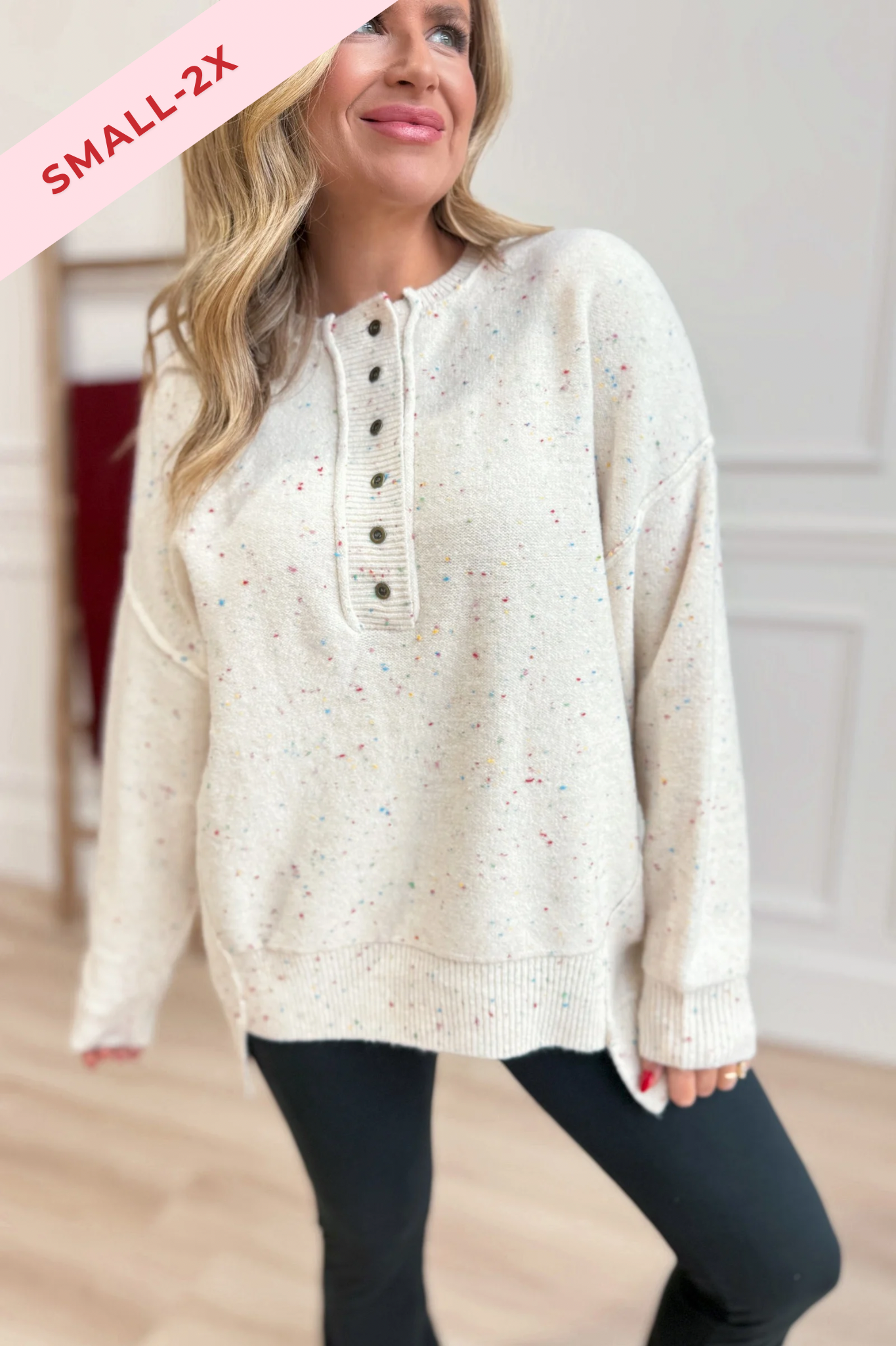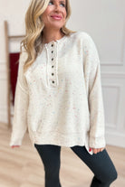 Cozy up in the Landry Speckled Oversized Sweater Top by Peach Love! This playful long-sleeve features a relaxed, oversized fit with a comfy crew neck and trendy drop shoulders. The button-down half front adds a fun twist, making it perfect for layering or wearing solo on cooler days. Embrace casual comfort with a touch of charm!