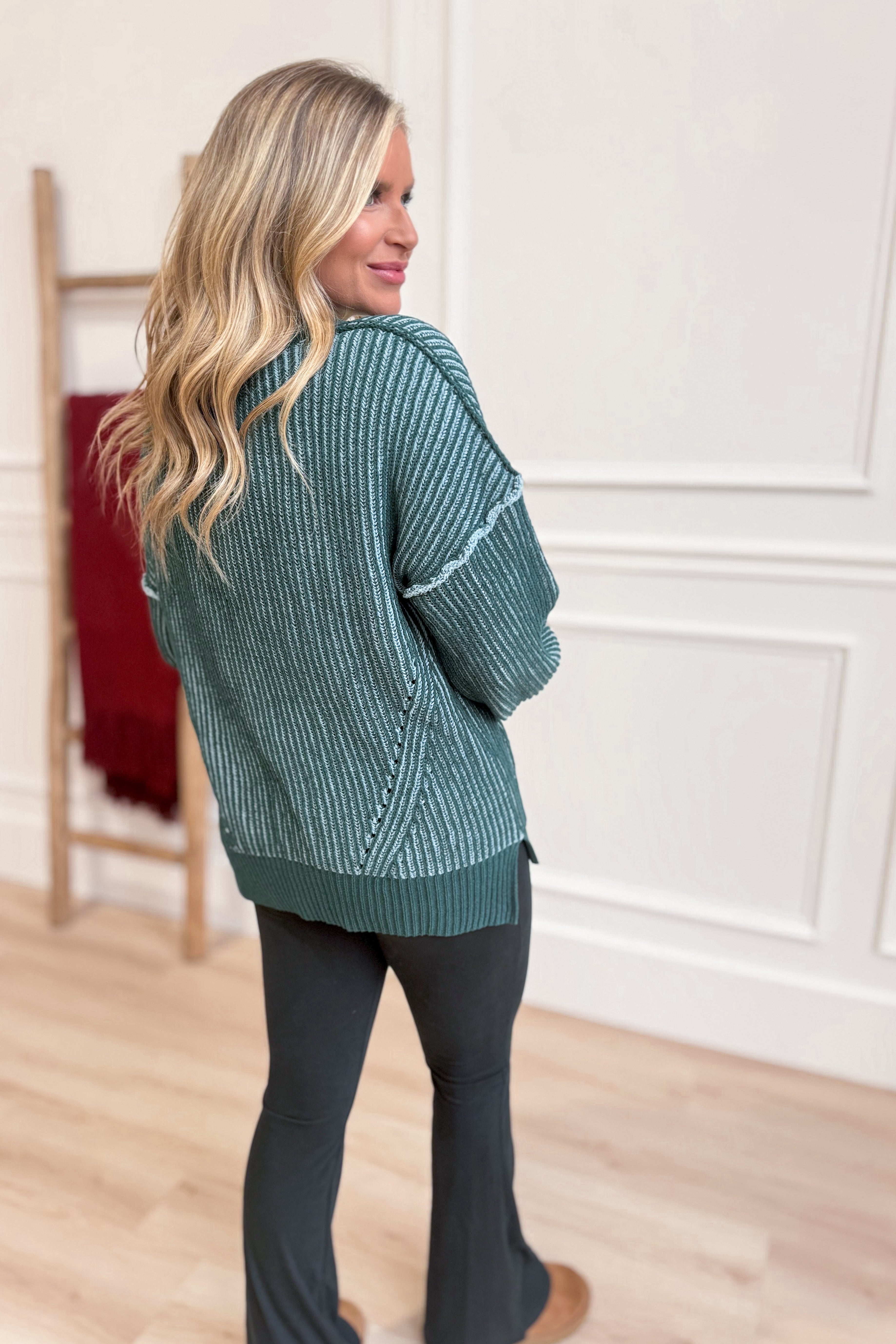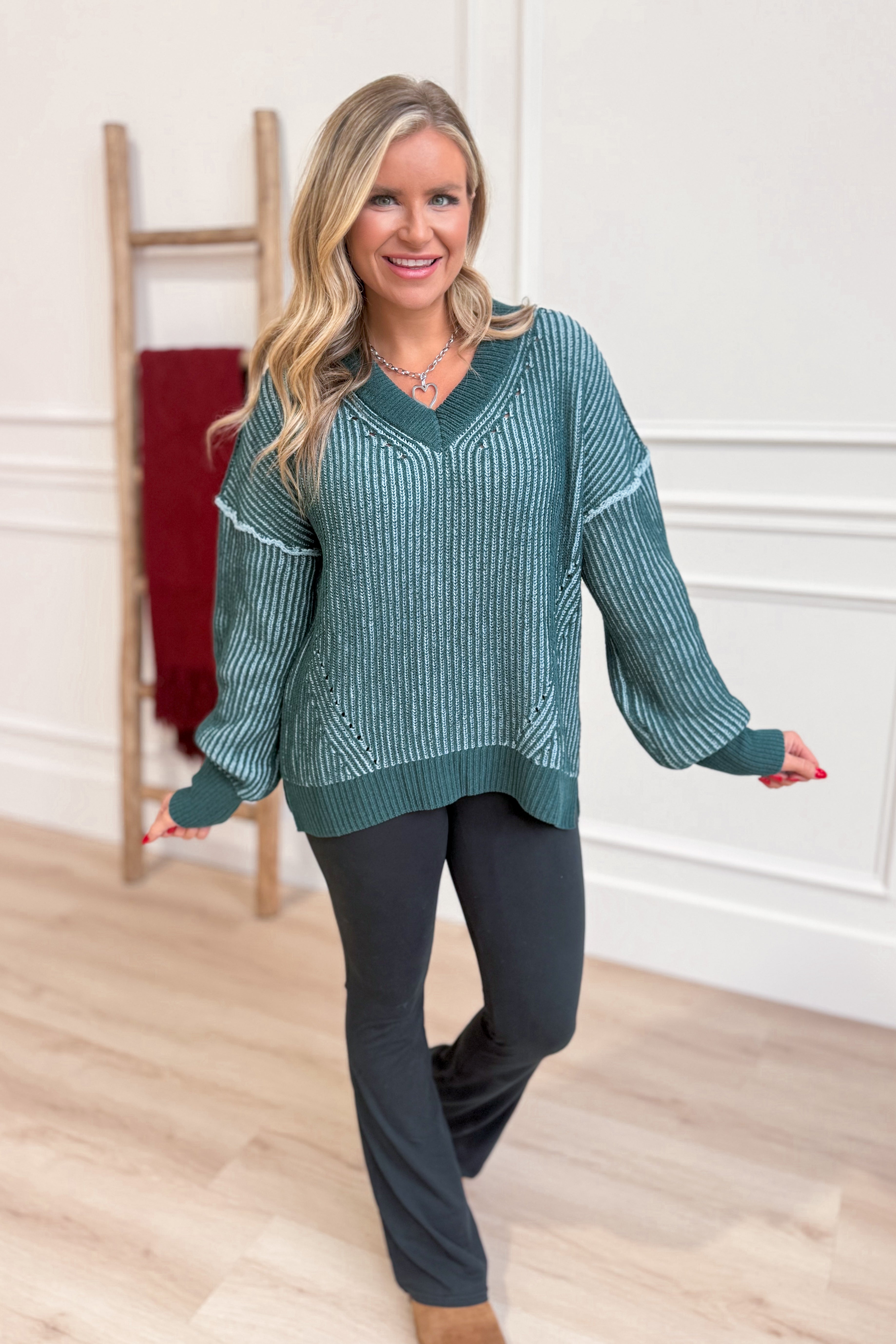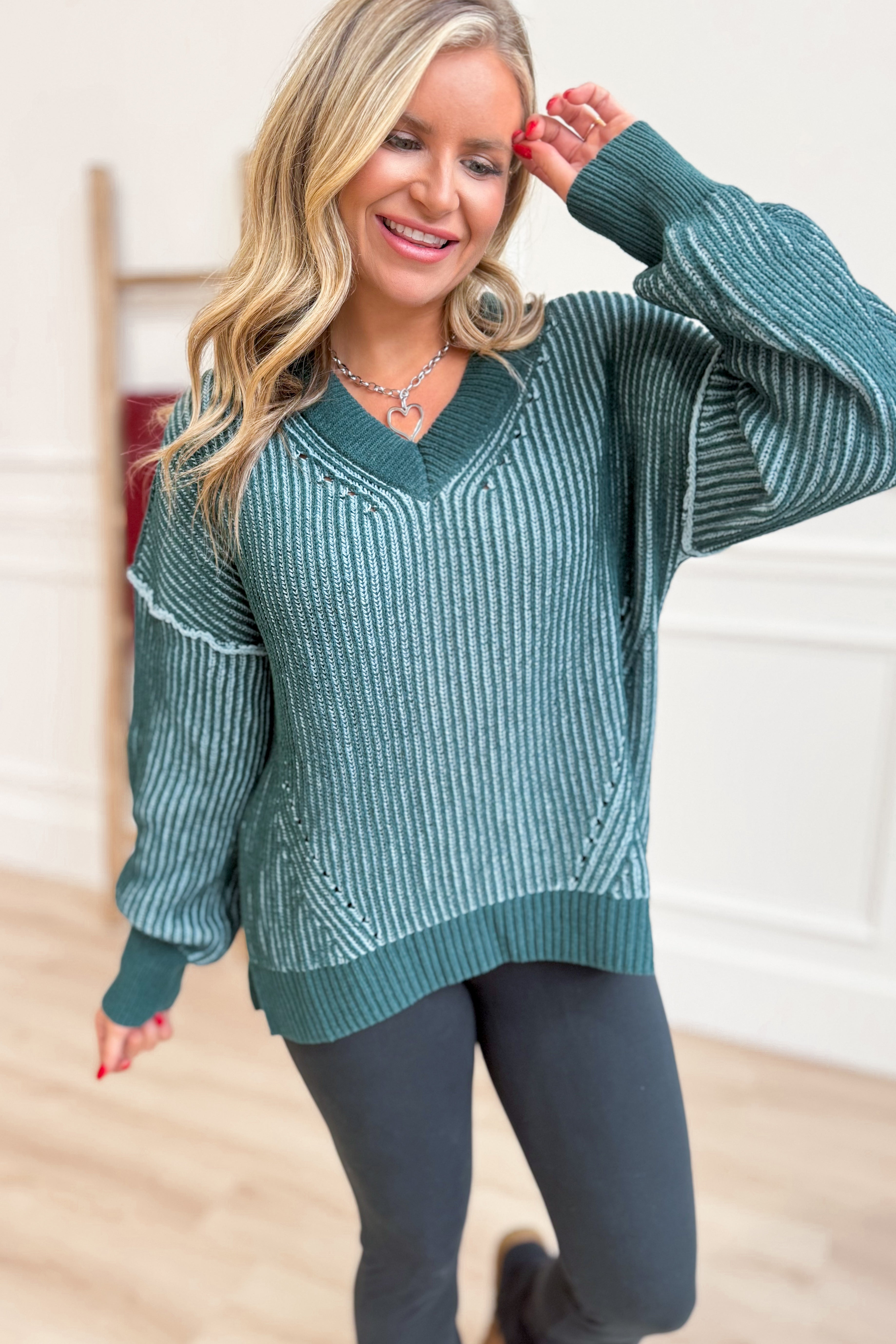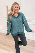 your new go-to for chill days. Featuring a soft heathered fabric, a flattering V-neck, and long sleeves with relaxed drop shoulders, this sweater blends comfort and style effortlessly. Its relaxed fit lets you move freely while keeping you snug and playful all season long.