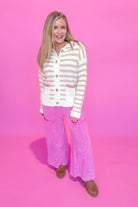 Stay stylish and cozy in the Betsy Striped Collar Button Down Sweater. This playful long-sleeve top features a classic collar, button-down front, and handy pockets for all your little essentials. The bold stripes add a fun twist, making it perfect for layering or wearing solo on any casual day.