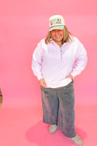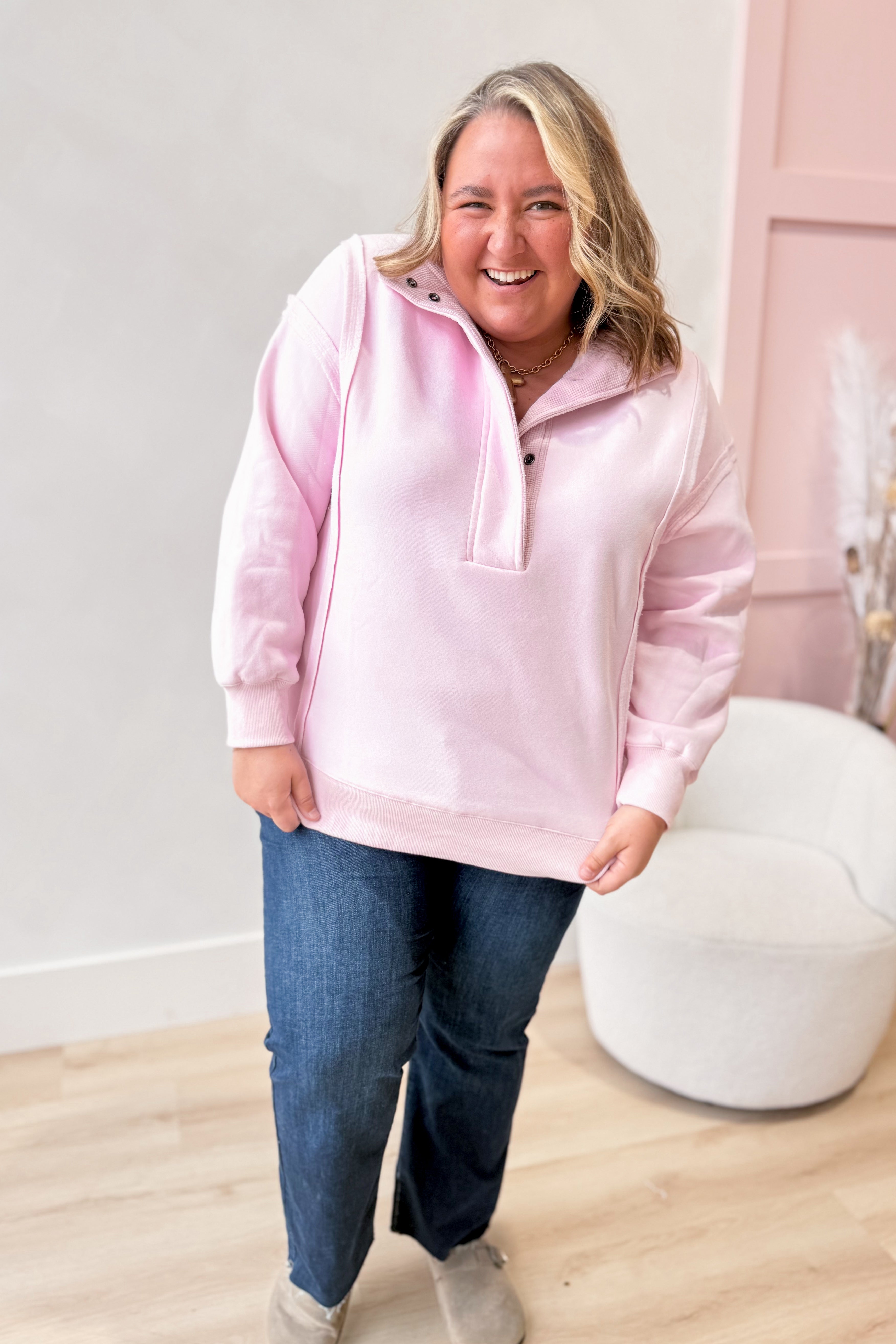 Cozy up in the Ella Fleeced French Terry Sweatshirt by Peach Love. This playful pullover features soft fleece fabric with a mineral wash for a lived-in look. The long sleeves and thermal quality keep you warm, while snap button closures add a fun twist to easy layering. Perfect for chilly days when comfort meets casual cool.