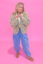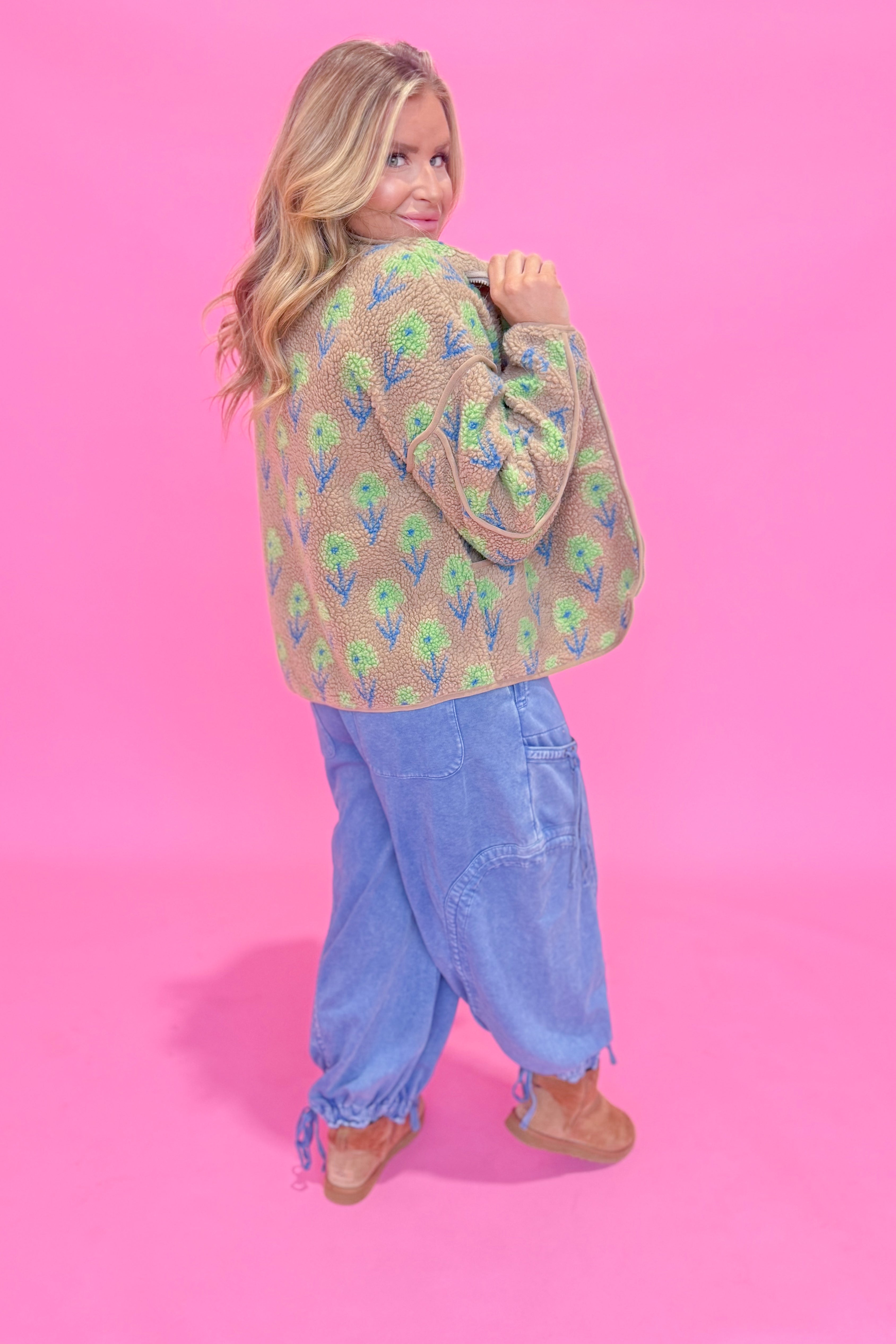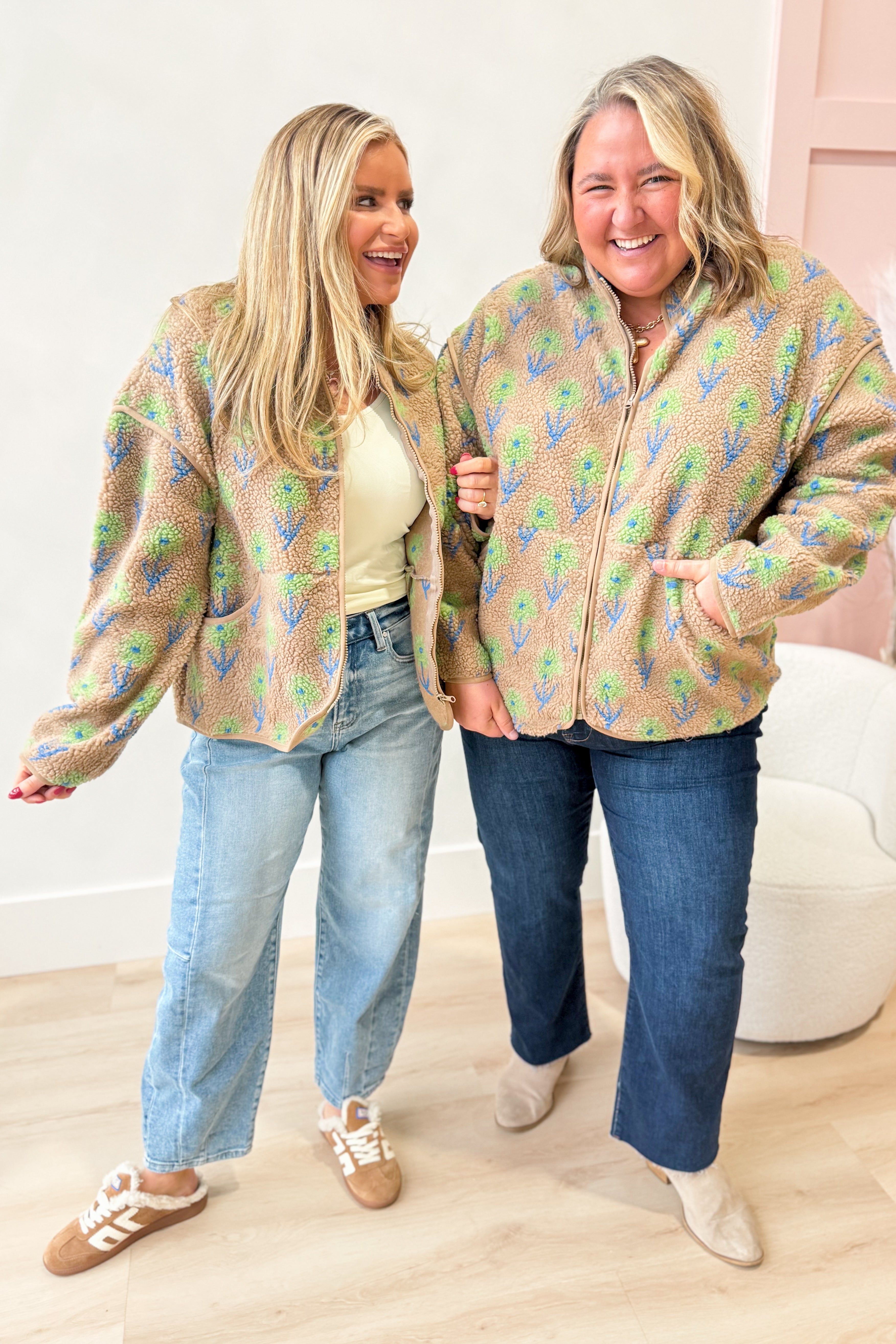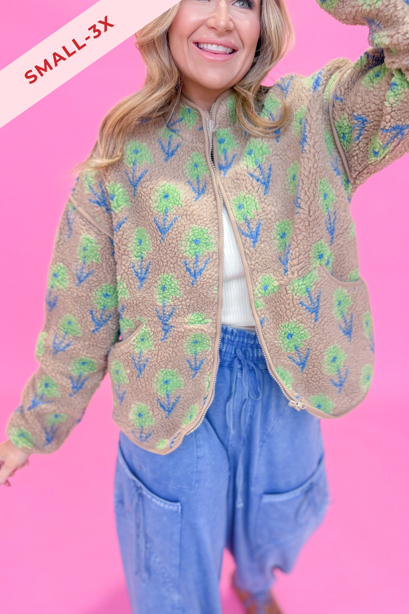 Cozy meets cute in the Jenna Teddy Bear Sherpa Zip Up. This playful jacket features super soft sherpa fabric with a fun floral pattern and solid trim for a polished look. The drop shoulder design adds a relaxed vibe, while the full zip lets you easily layer up or down. Perfect for chilly days when you want to stay warm and whimsical!