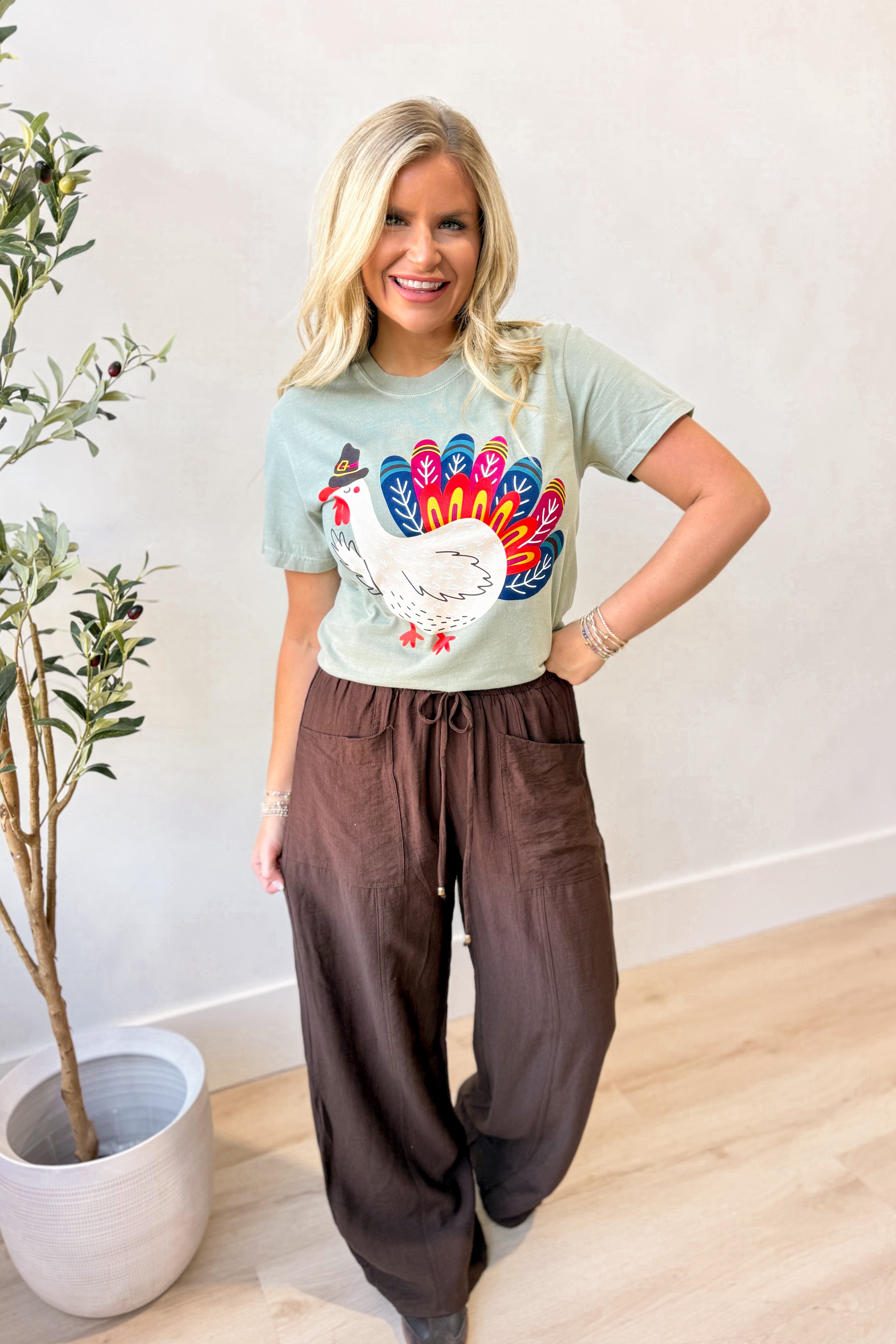 Celebrate Turkey Day in style with the Ms Gobbleworth Graphic T-Shirt! This charcoal short-sleeve tee features a comfy crewneck and a playful design perfect for Thanksgiving fun. True to size, but size up for a relaxed, cozy fit. Made by Small Town Society, it’s a festive favorite that brings humor and comfort together for your holiday gatherings.