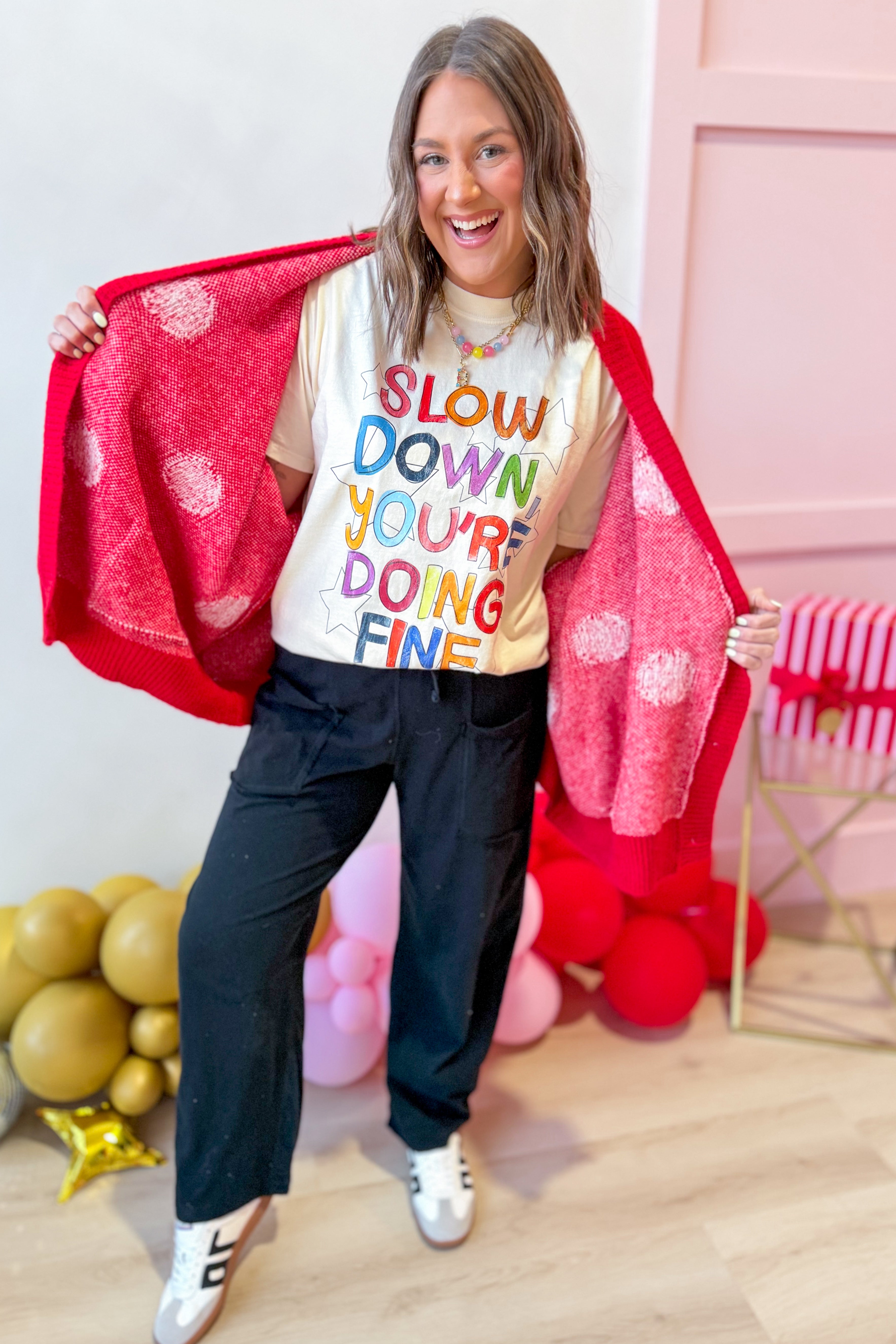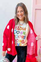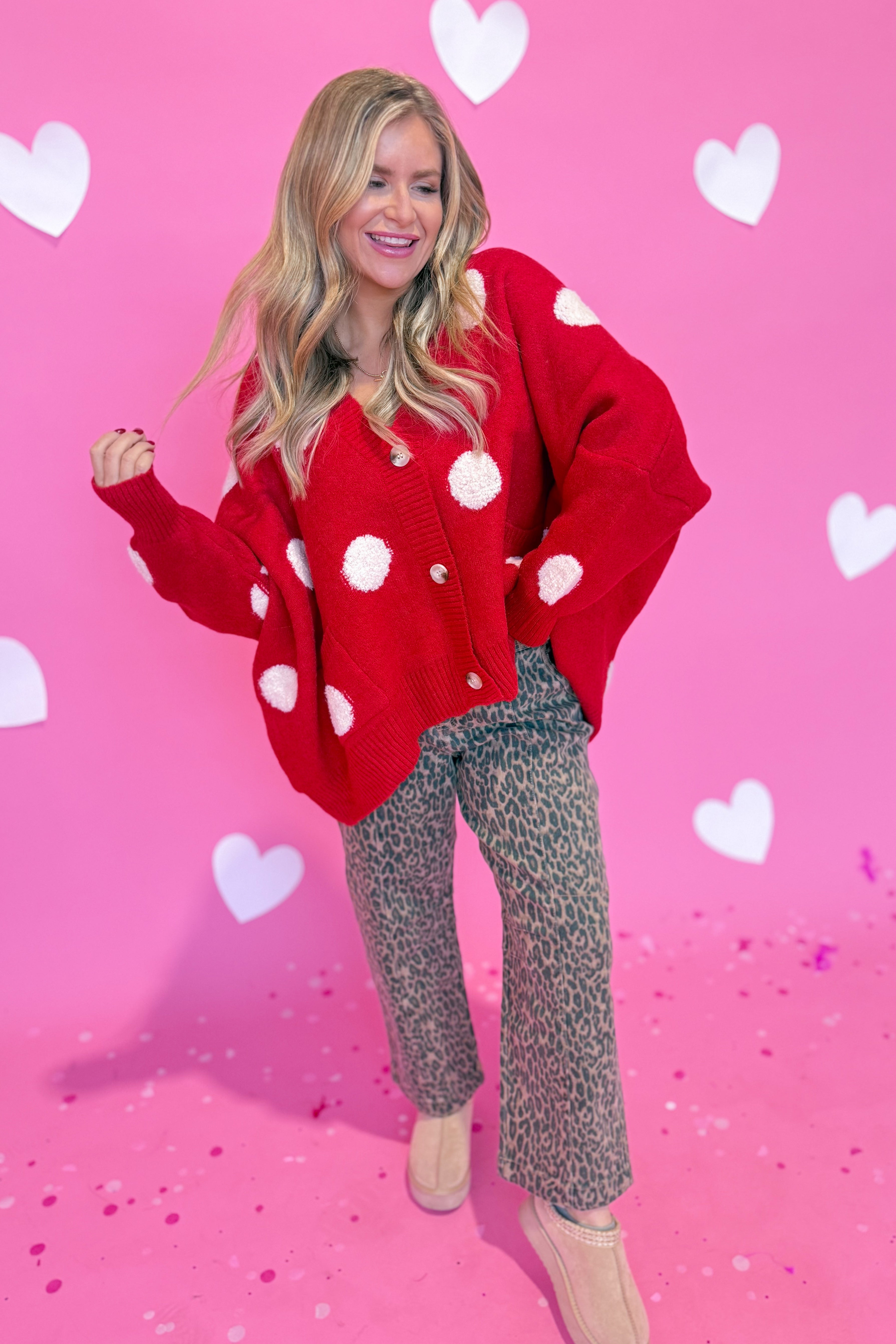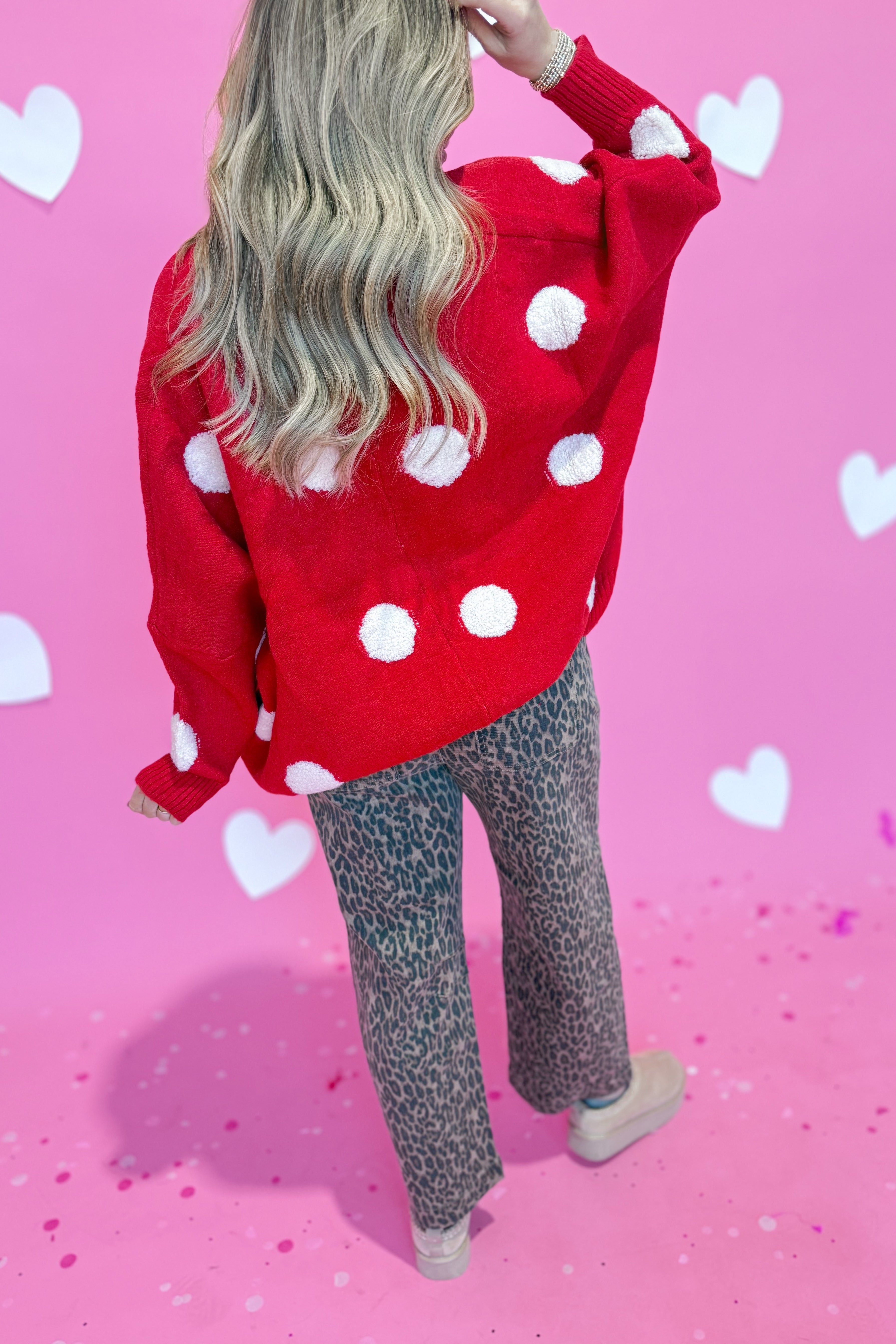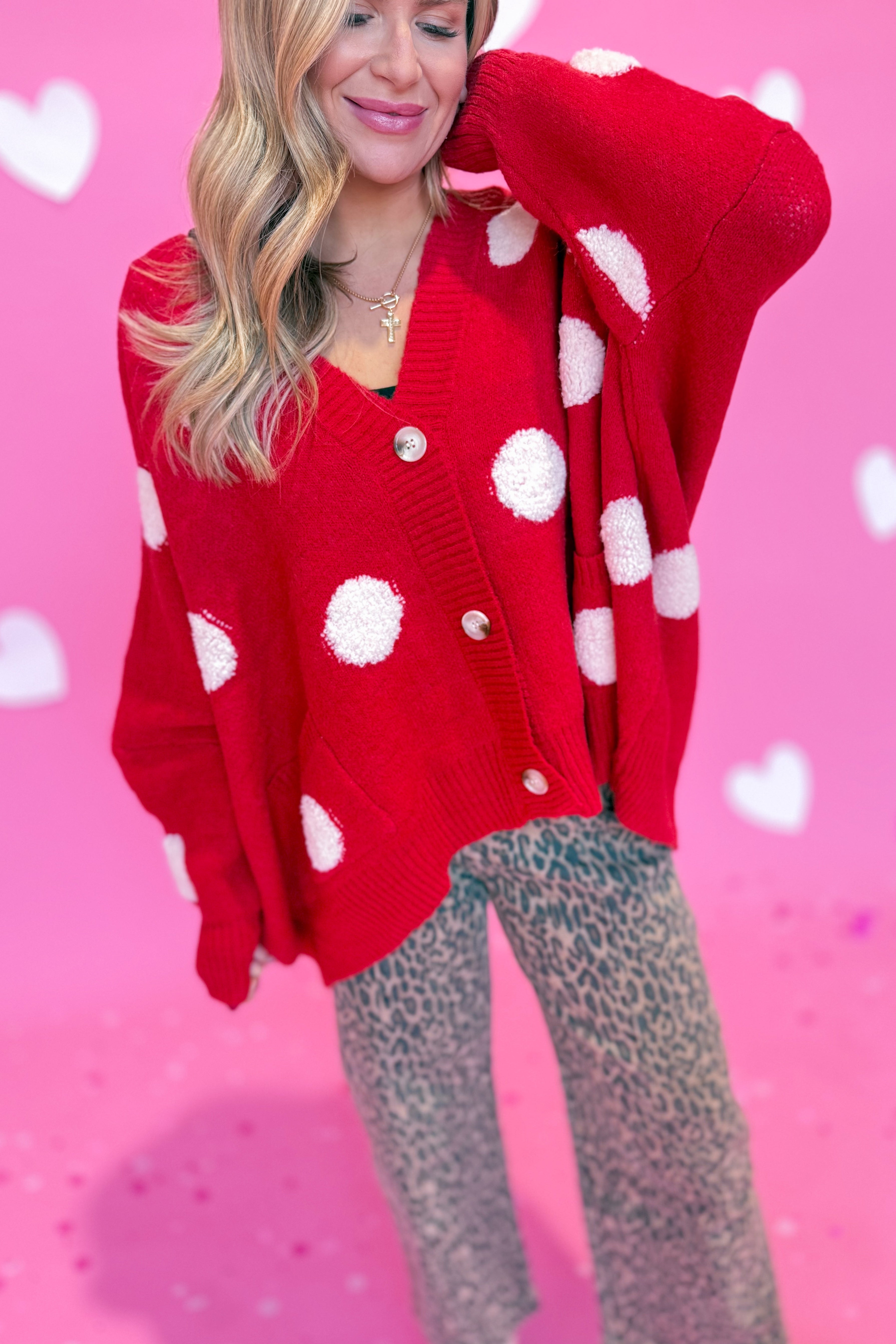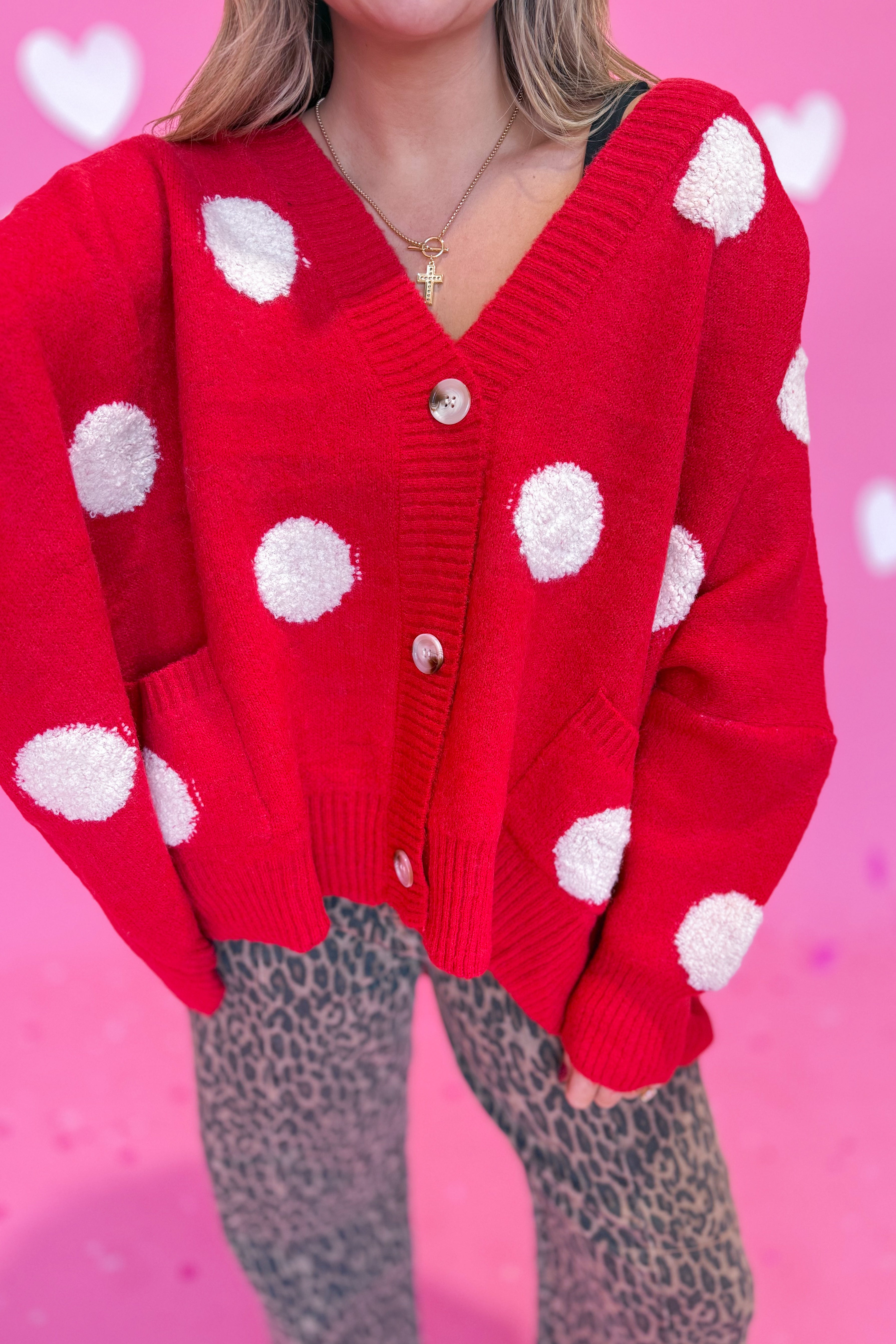Cozy up in the Adeline Polka Dot Cardigan, where classic charm meets modern comfort. This oversized sweater knit features a playful polka dot pattern that adds personality to any outfit. With its relaxed drop shoulder silhouette and long sleeves, it's the perfect layering piece for effortless style. Whether you're lounging at home or heading out for a casual day, this cardigan wraps you in warmth and whimsy.