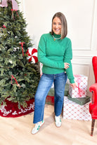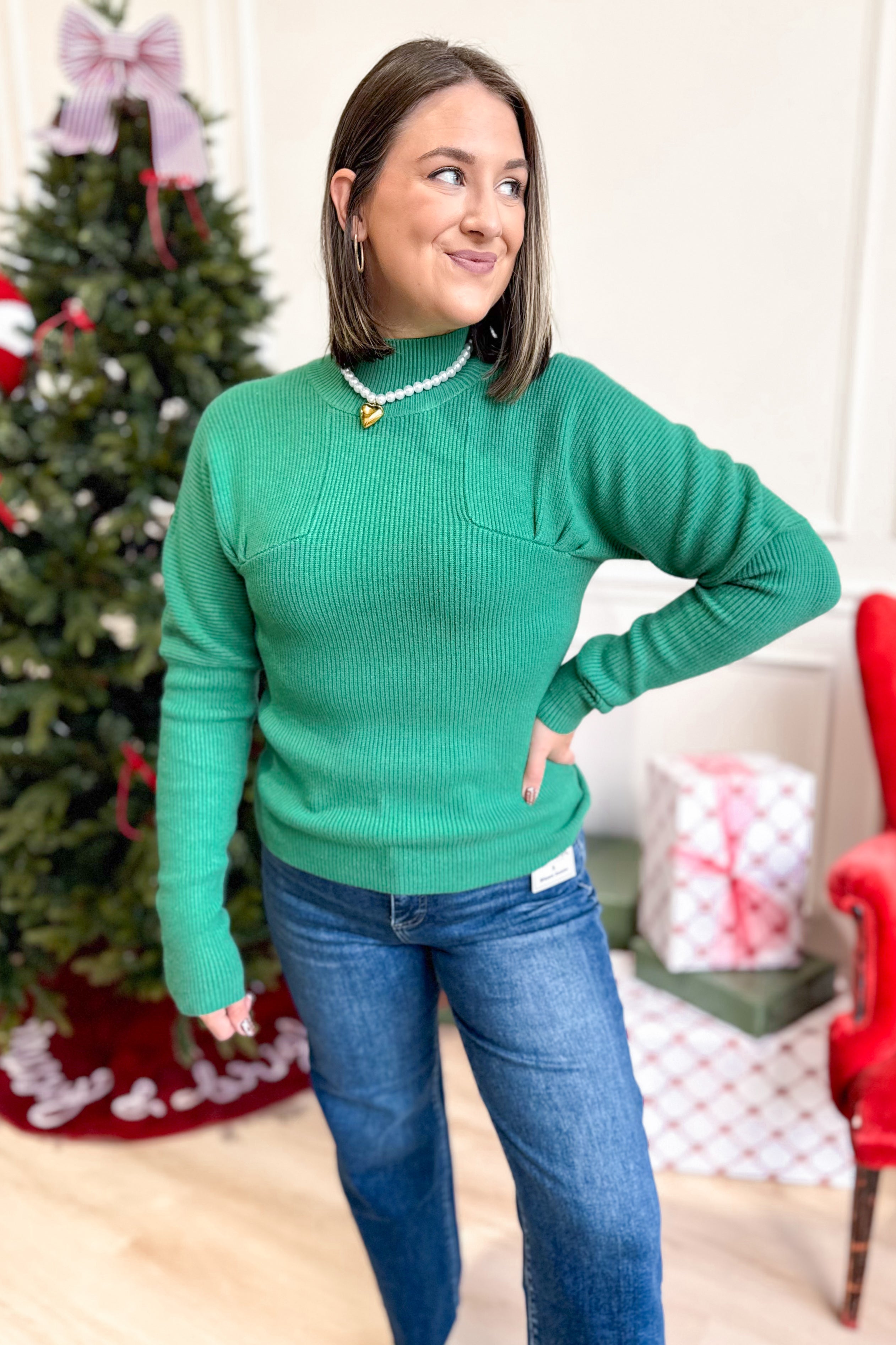 Stay cozy and stylish in the Callie Ribbed Mock Neck Long Sleeve Sweater by &Merci. The fitted bodice and ribbed knit provide a flattering and comfortable fit, while the shirring detail and drop shoulder with long cuffs add a touch of flair. Available in a playful Kelly Green color, this mock neck sweater is a must-have for any wardrobe.