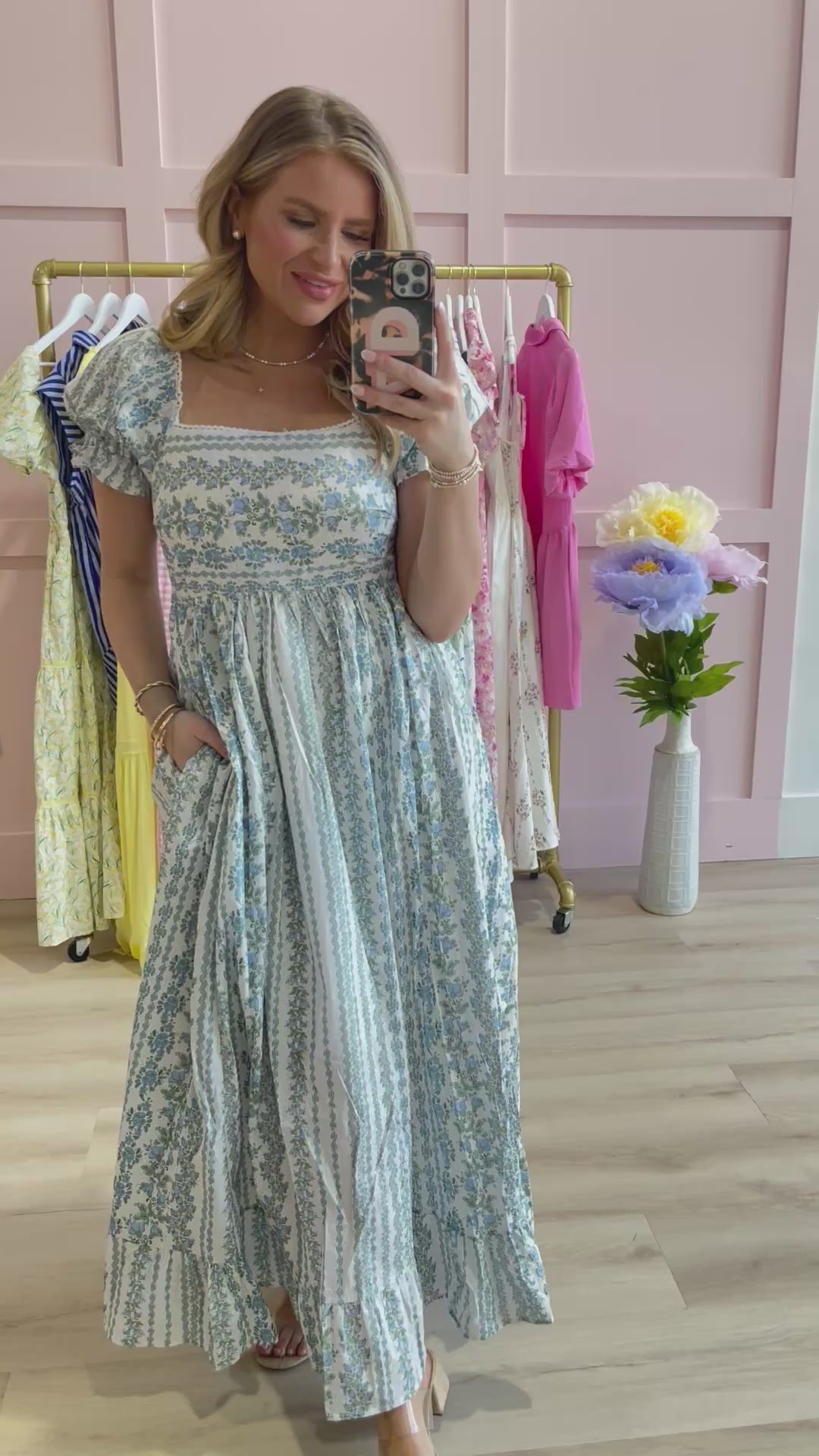 Embrace effortless elegance with this French Floral Cotton Maxi Dress from In Loom. Crafted from 100% cotton, this imported piece features a charming floral print in French Blue with a square neckline and short sleeves. The smocked bust provides a flattering fit, while tiered and ruffle trim details add romantic dimension throughout. At 52" in length, it's the perfect maxi silhouette for any occasion. True to size in S(4-6), M(6-8), and L(8-10). Hand wash cold to maintain its natural beauty.