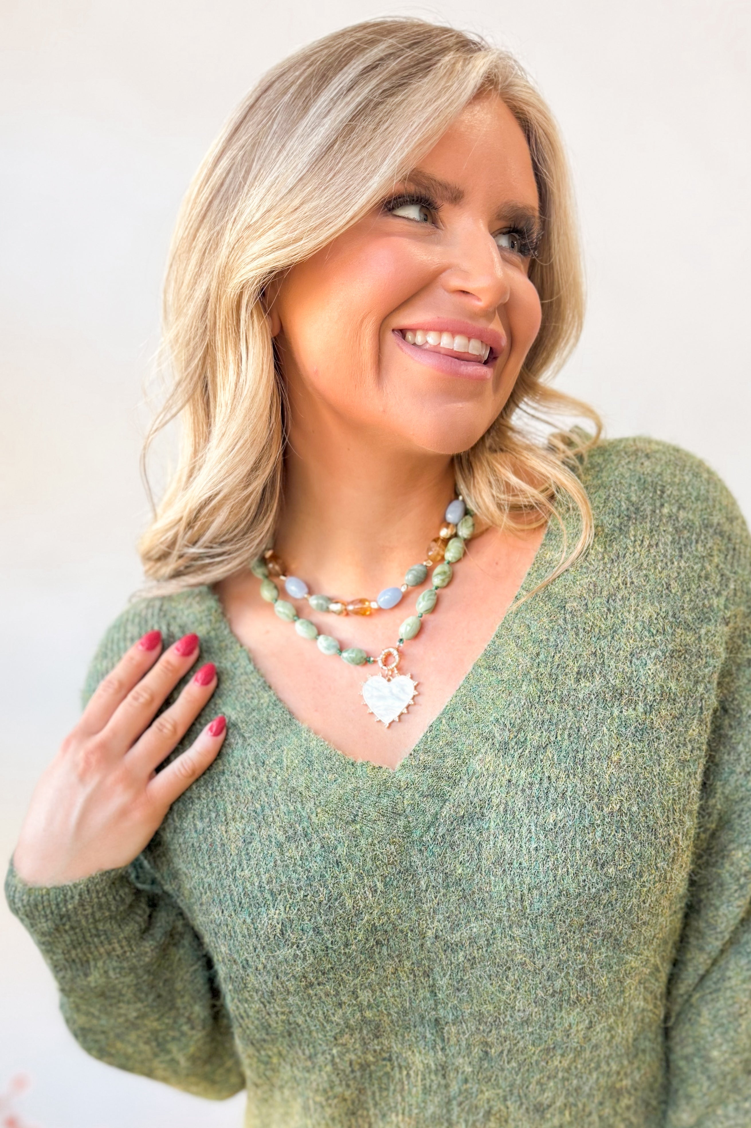 Green Beaded Natural Stone w/ Pearlized Heart Charm Necklace