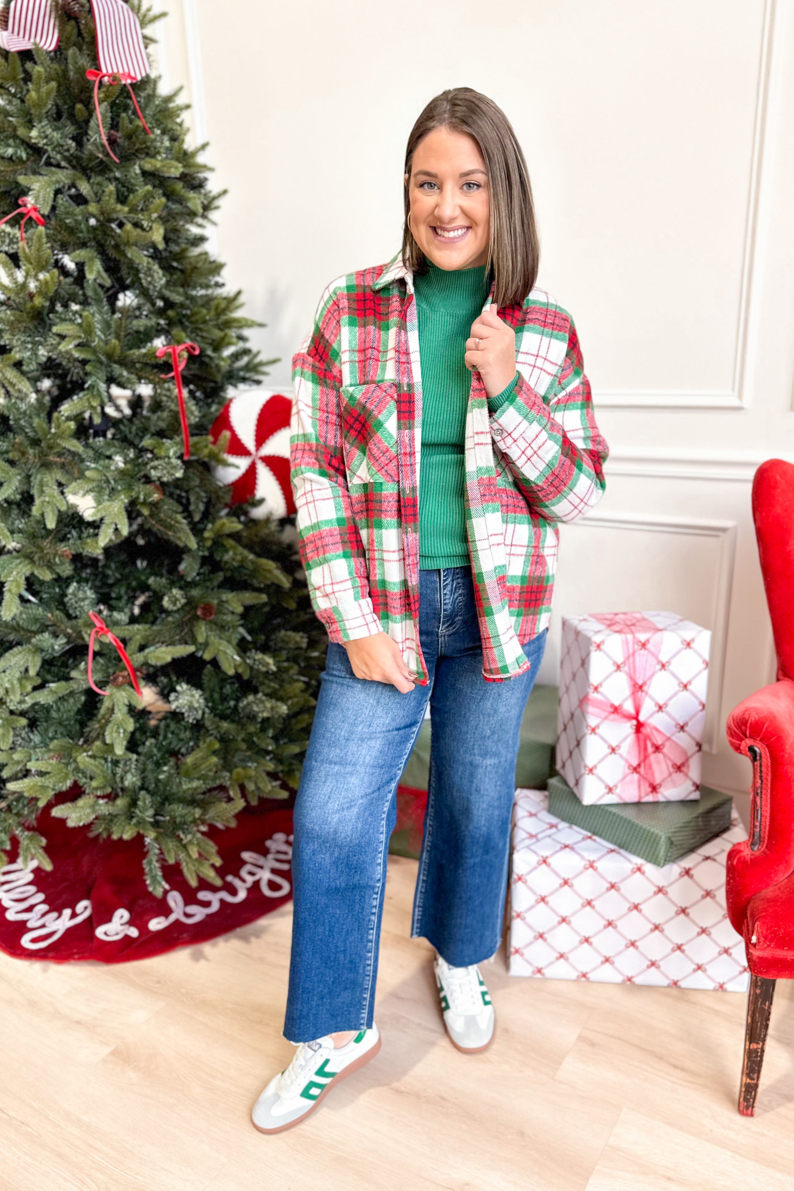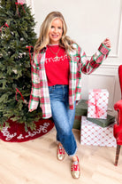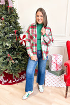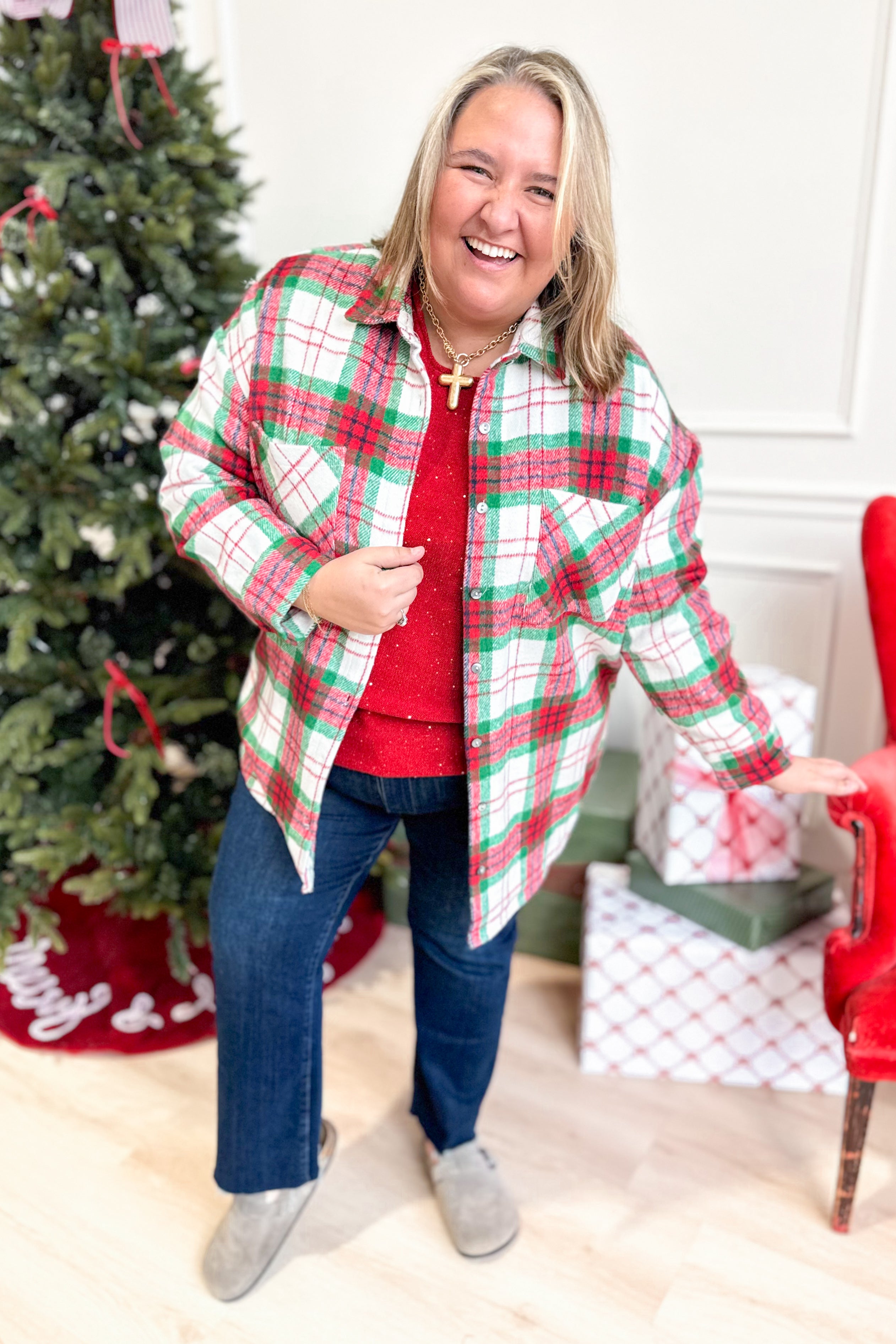 Introducing the Henri Shacket by She & Sky! Perfect for those who love a little humor in their fashion, this plaid shacket (aka shirt/jacket hybrid) features a fun mix of red and green. With long sleeves, a button down front, and convenient pockets, this shacket effortlessly combines style and practicality.
