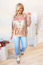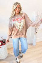 Embrace casual cool with the J HER Savvy Mineral Washed Nashville Graphic Long Sleeve. Featuring a soft mineral-washed finish and a playful Nashville graphic, this top adds effortless style to your everyday look. The scoop neckline and long sleeves keep it comfy and cozy, perfect for layering or wearing solo on breezy days.