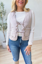 Add a fun twist to your layering game with the Susan Quilted Tie Front Vest. This sleeveless vest features a cozy quilted texture, a flirty V-neck, and an adjustable tie front for a perfect fit. Plus, its square pockets add a playful touch while keeping your essentials close. Perfect for adding warmth and style without the bulk!