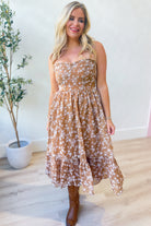 Step into autumn with charm in the Zoe Fall Floral Ruffle Trim Dress by Storia. This sleeveless midi dress features a flirty sweetheart neckline and delicate ruffle trim, perfectly framing its vibrant floral pattern. Light and breezy, it’s designed to move with you, making every step feel playful and graceful. Whether you’re out for brunch or an evening stroll, this dress adds a fresh, fun touch to your fall wardrobe.