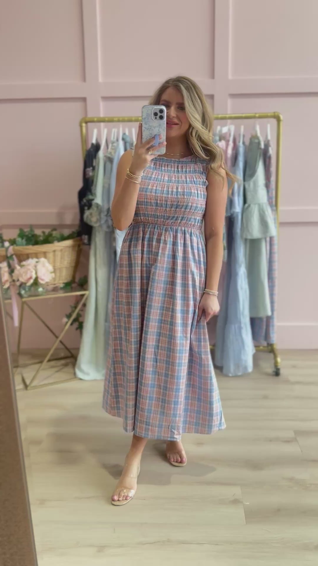 A plaid beauty featuring a flattering scoop neck, sleeveless cut, smocked bust, and a trendy drop waist with a 48” flowy length.