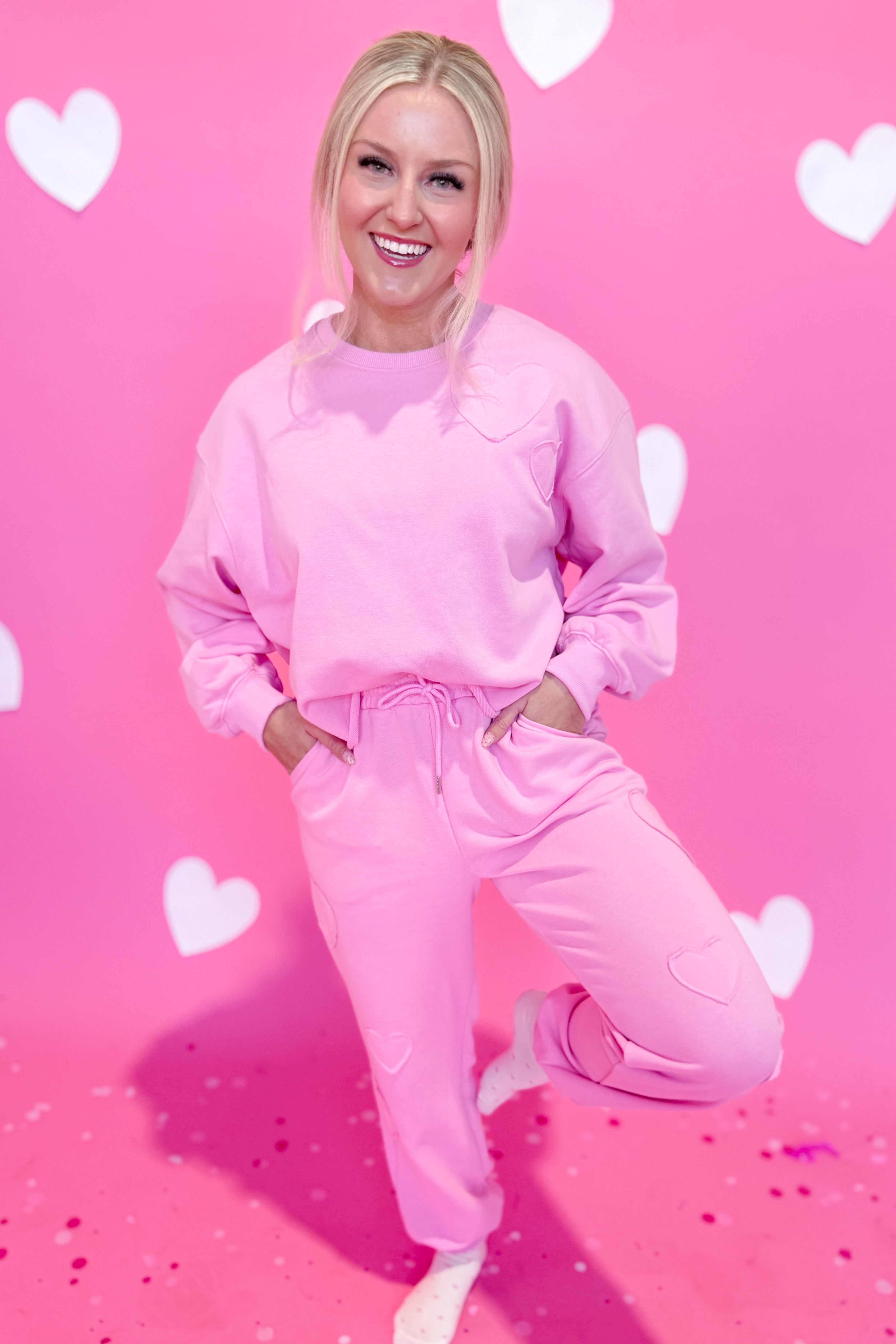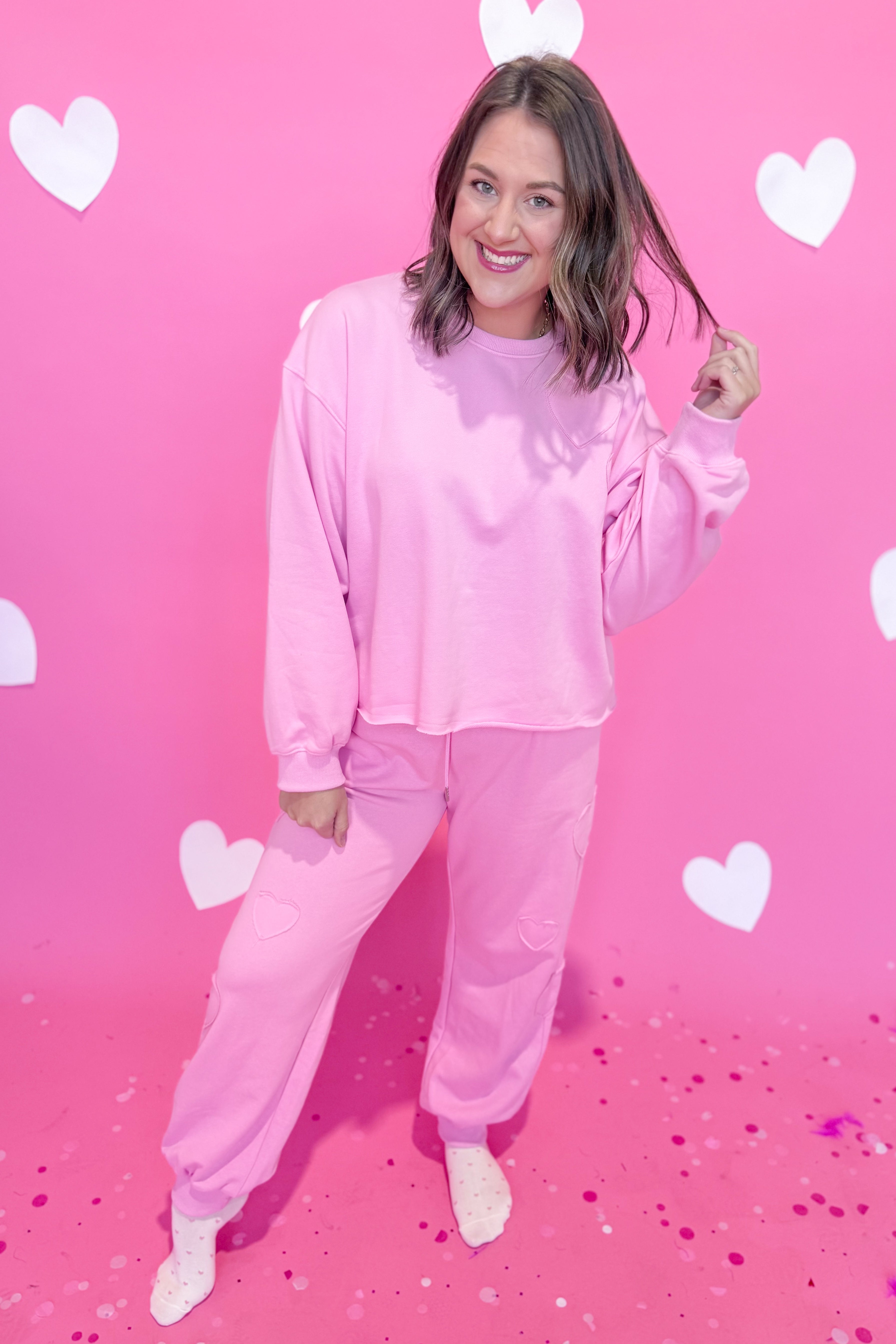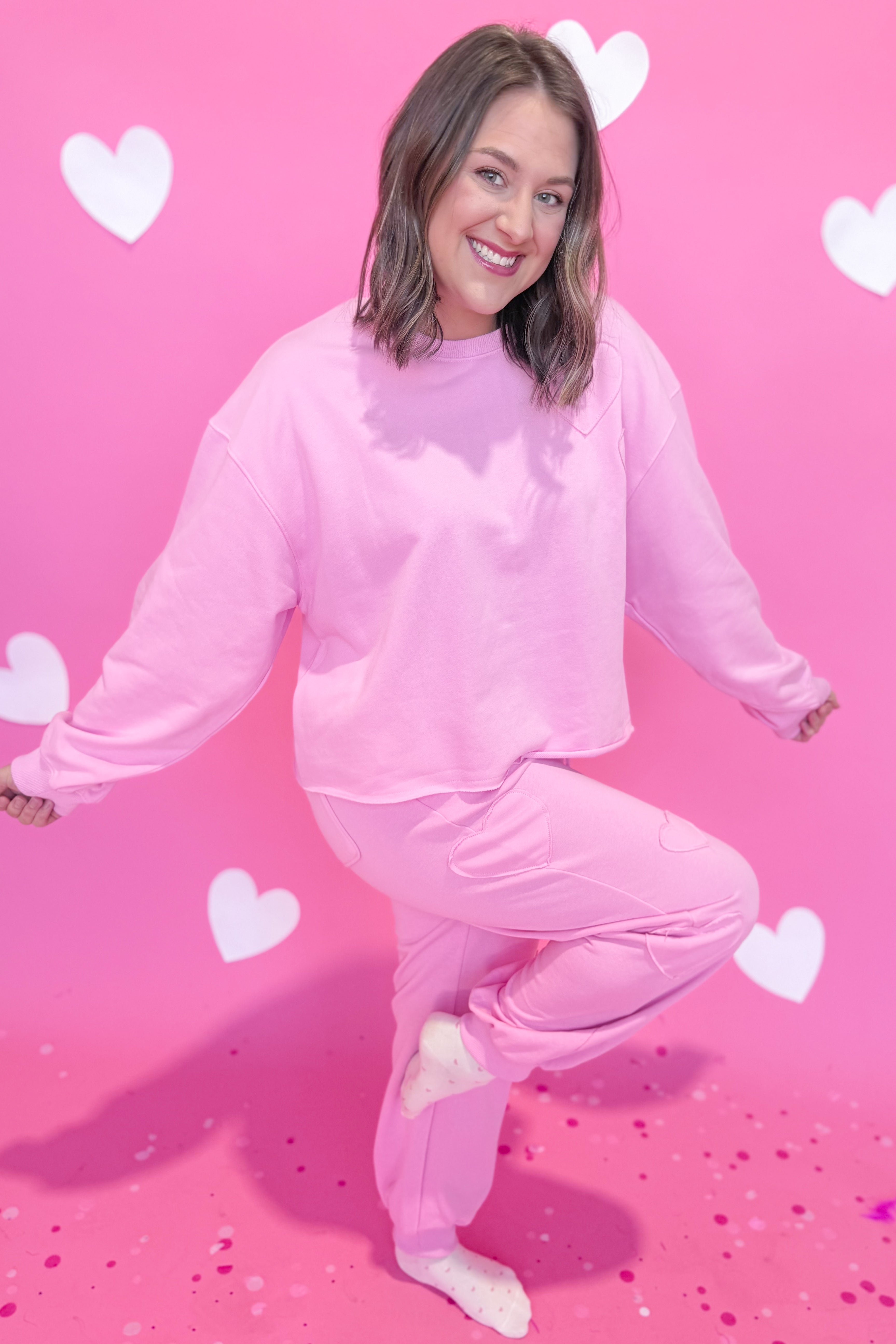 Cozy up in these adorable jogger pants that blend comfort with personality! Featuring a charming heart outline design on a solid color base, these pants rock a trendy raw edge finish for that effortlessly cool vibe. The relaxed round neckline and soft jogger silhouette make them perfect for lounging, running errands, or casual hangouts. Whether you're keeping it low-key or making a sweet statement, the Frannie joggers are your new go-to for laid-back style that feels as good as it looks.