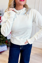 Embrace cozy charm with this cream ribbed top from Umgee. Its mock neck and ruffle trim add a flirty twist, while the relaxed fit keeps comfort front and center. Perfect for layering or wearing solo, this long sleeve piece fits true to size and offers a playful, effortless vibe for any casual day.