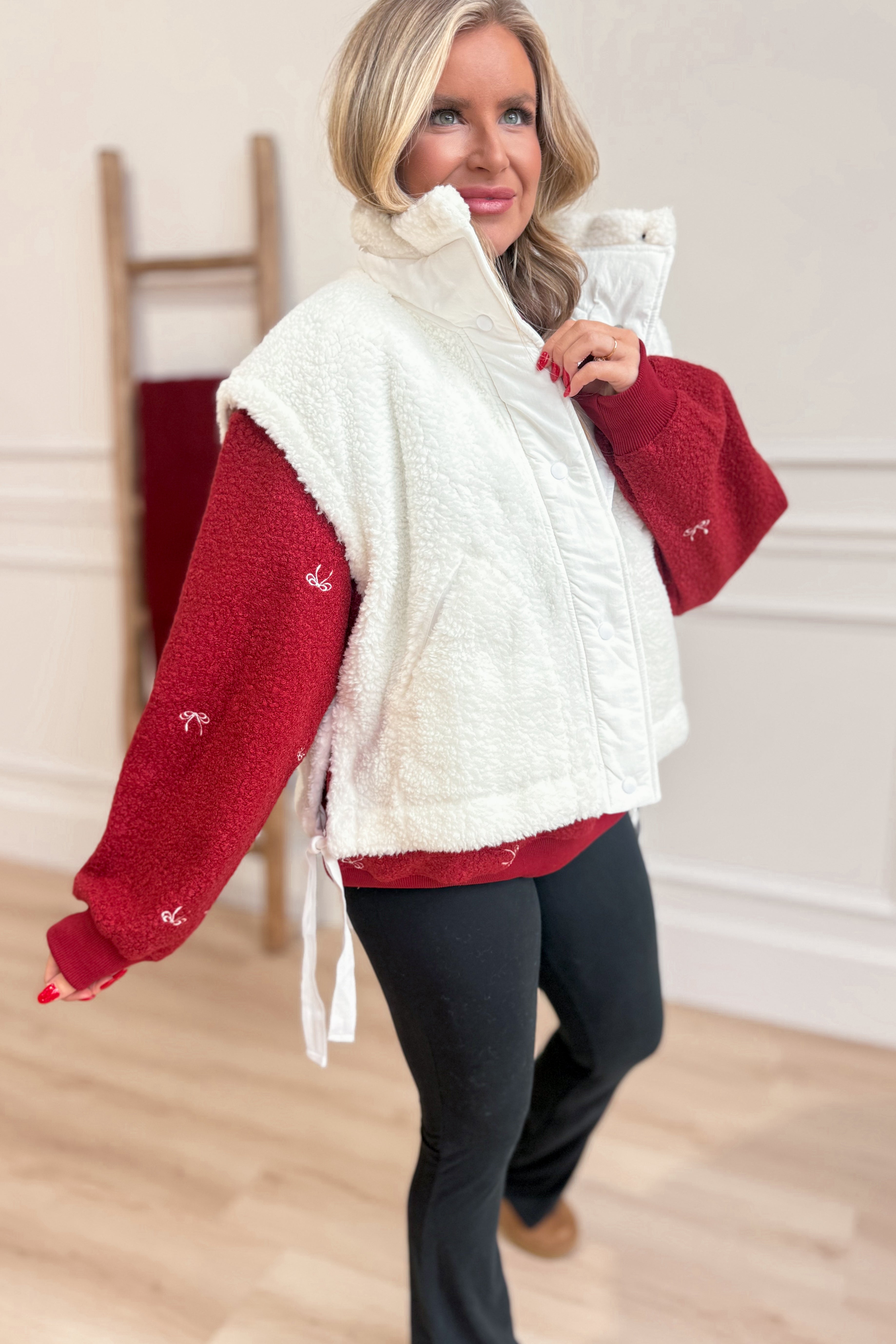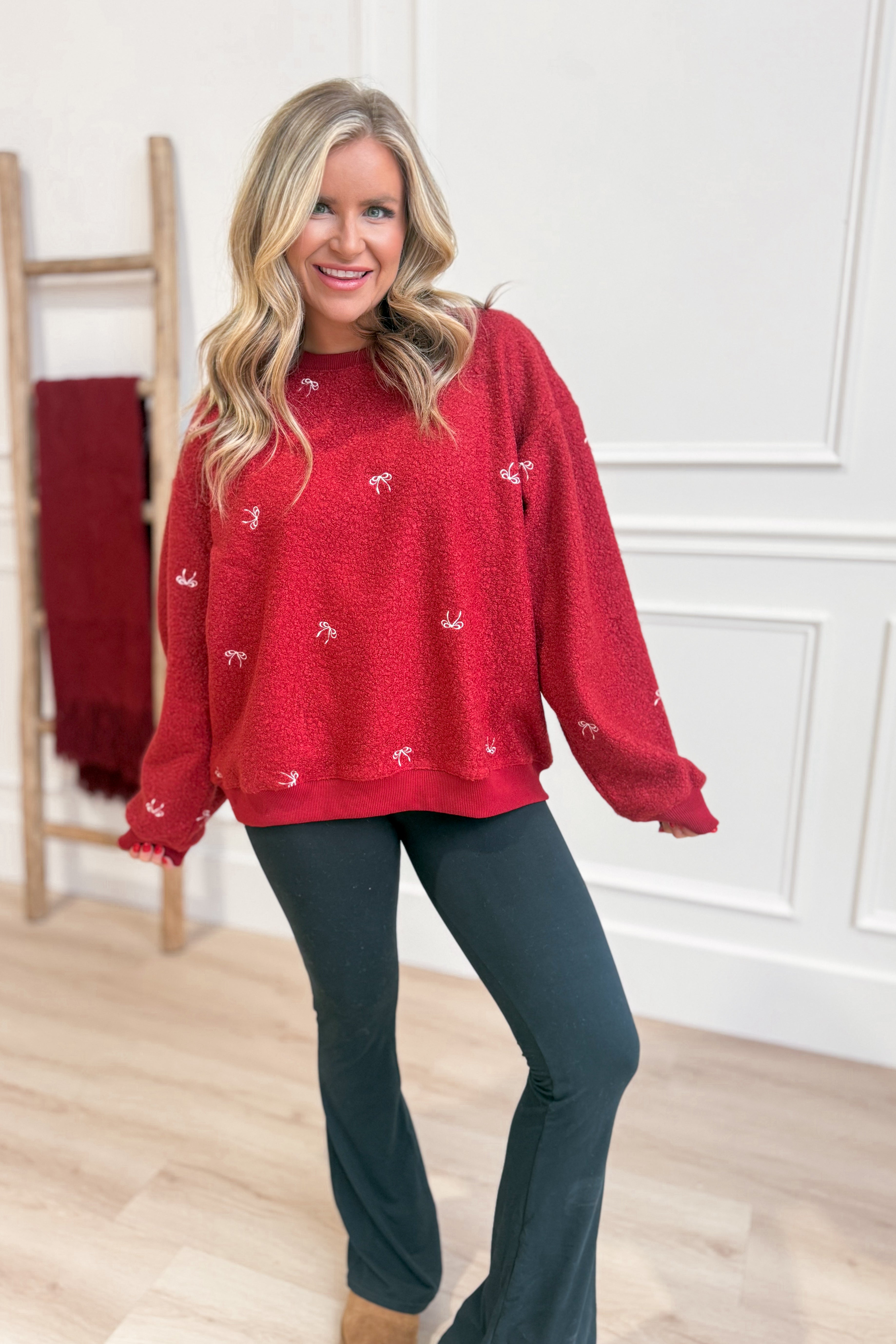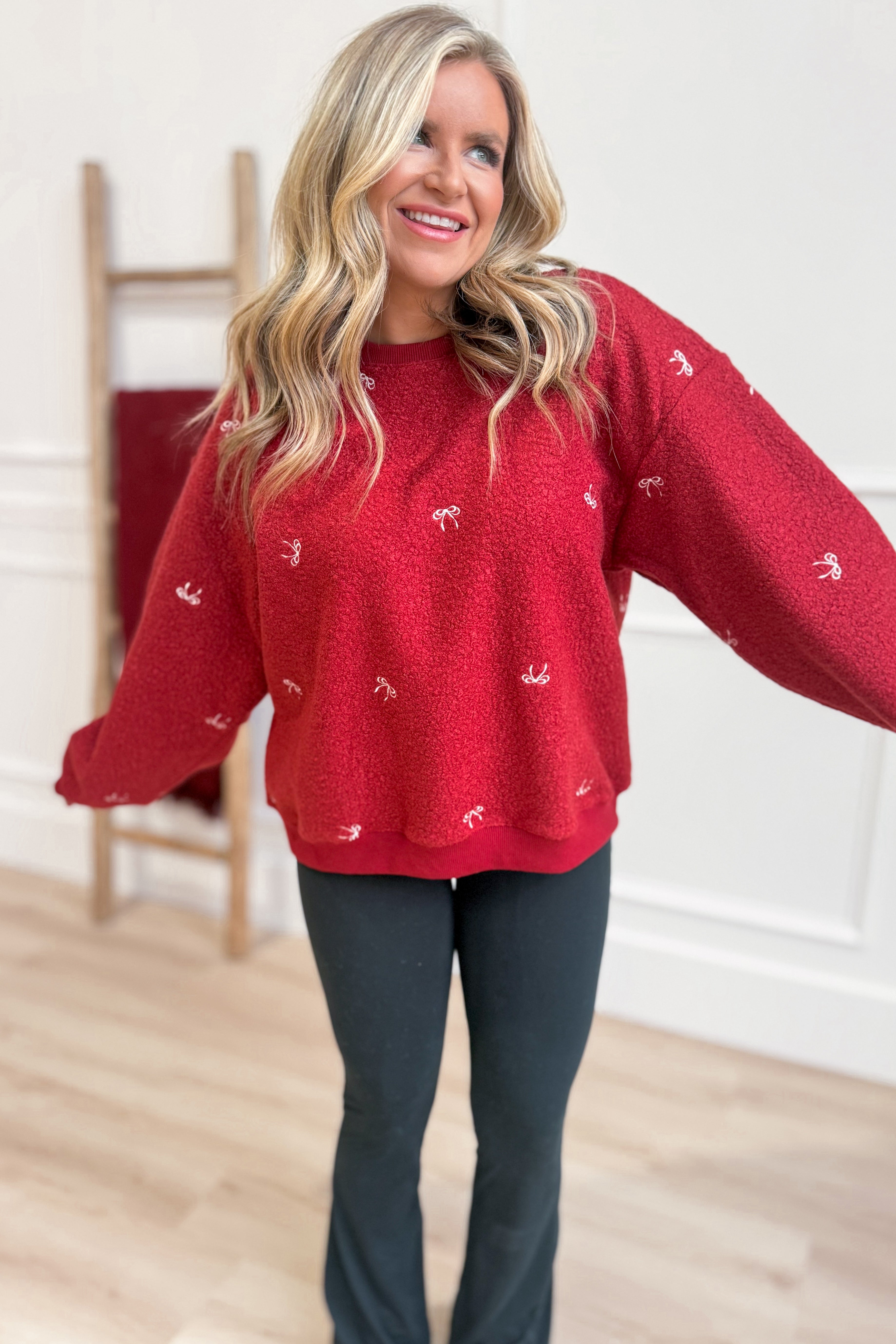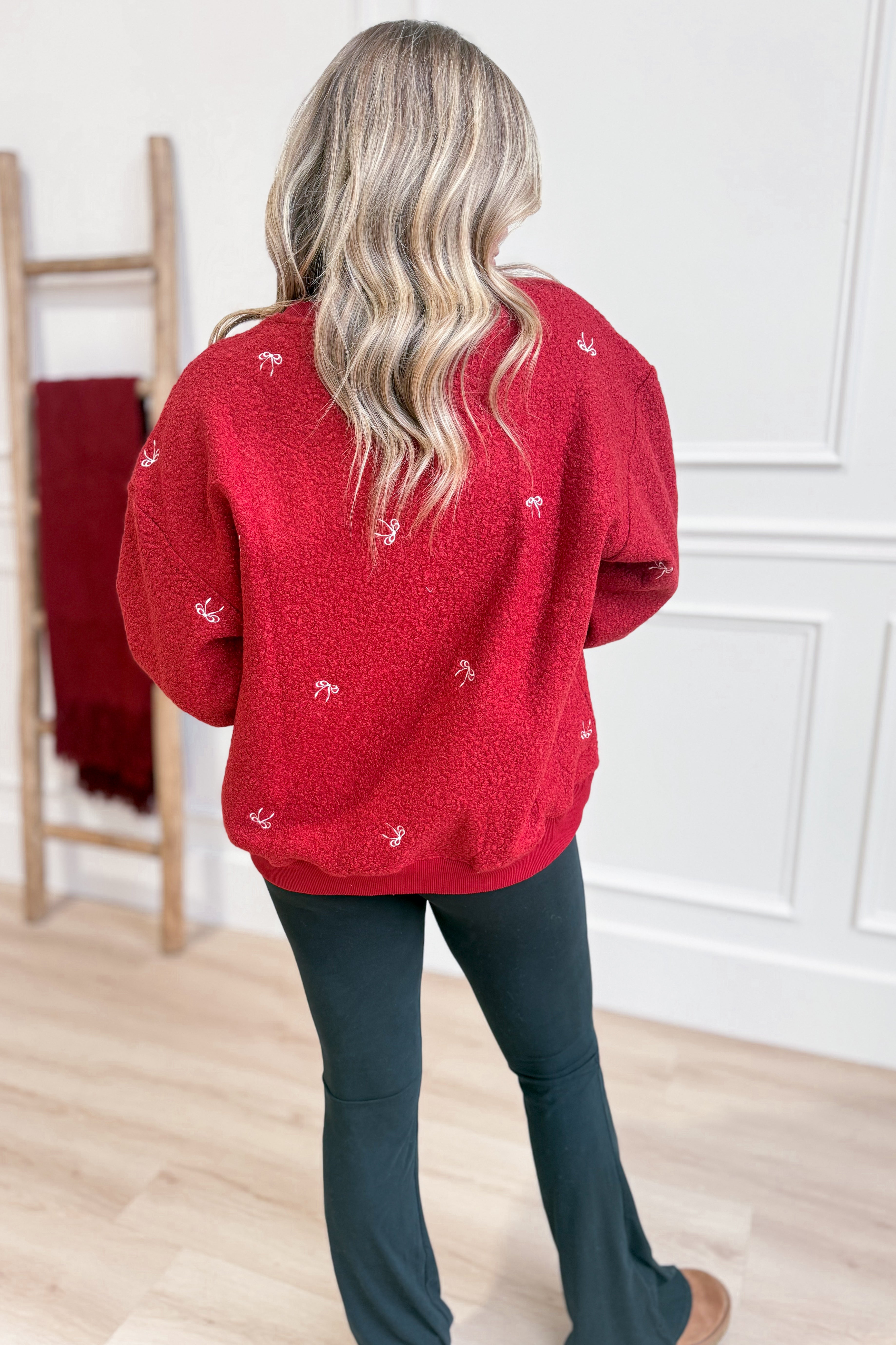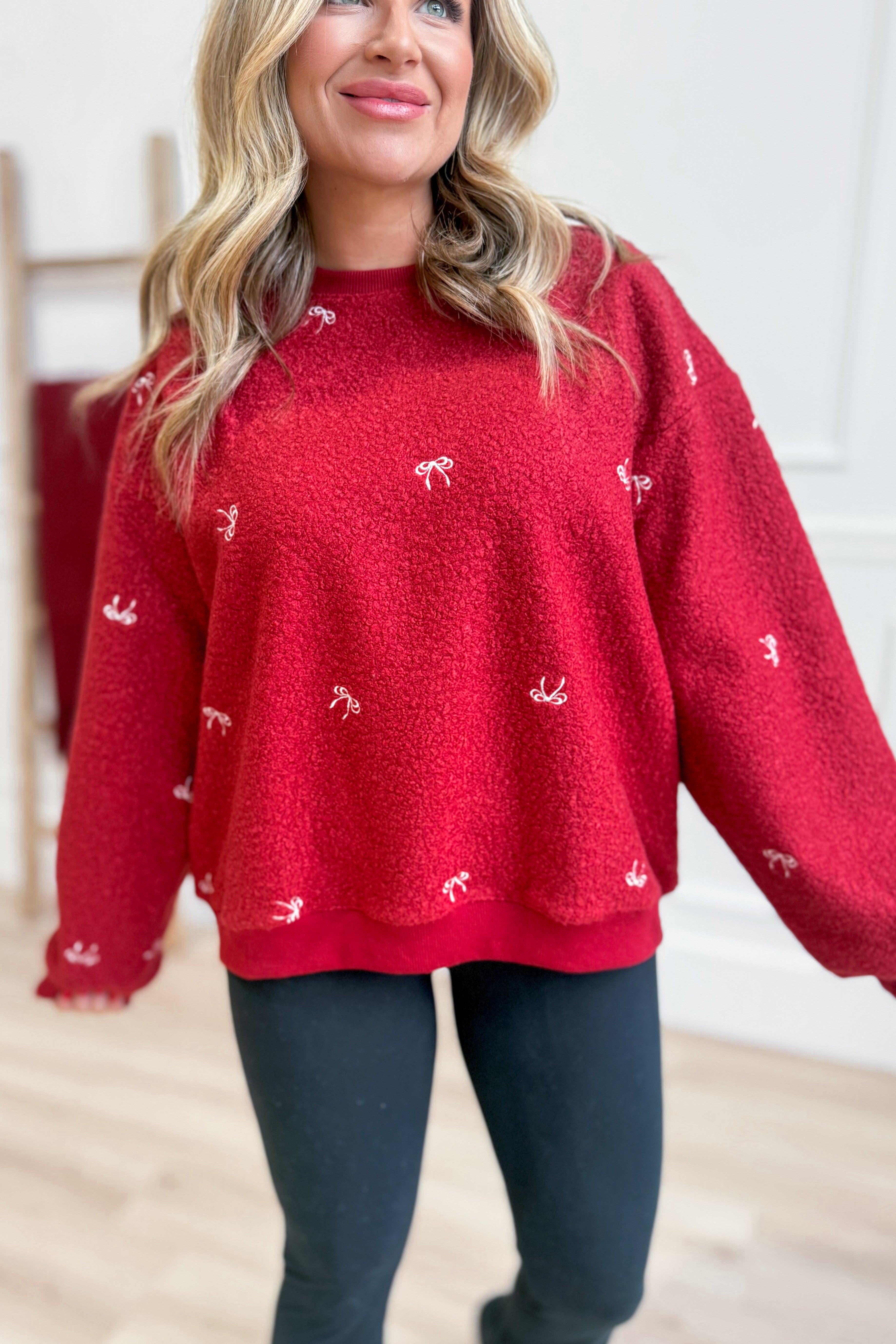 Cozy up in the Bella Embroidered Teddy Sherpa Pullover by Main Strip! This solid, long-sleeve pullover features a comfy drop shoulder and a cute embroidered bow that adds a touch of charm. The crew neck and plush teddy sherpa fabric make it perfect for chilly days when you want to stay warm and stylish with a playful twist.