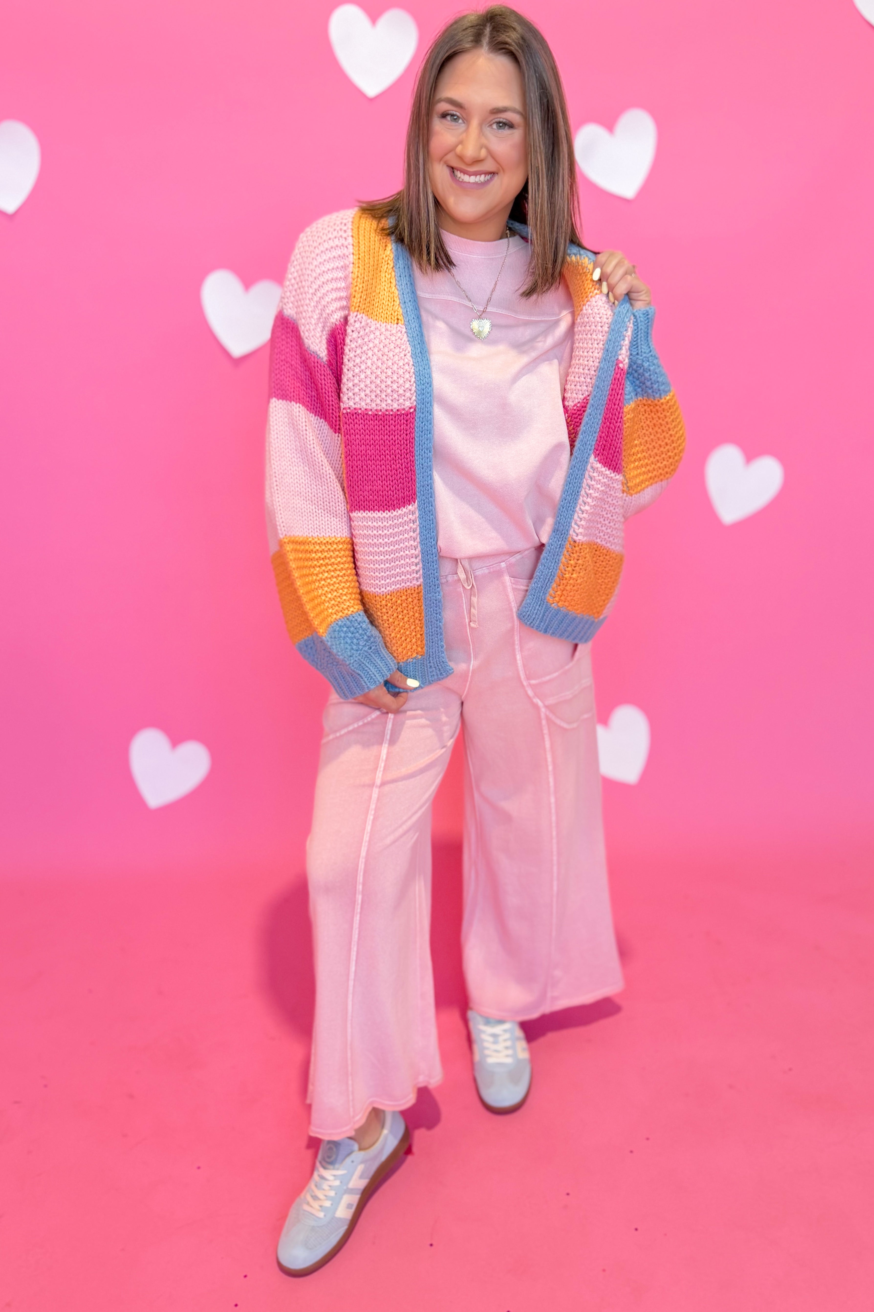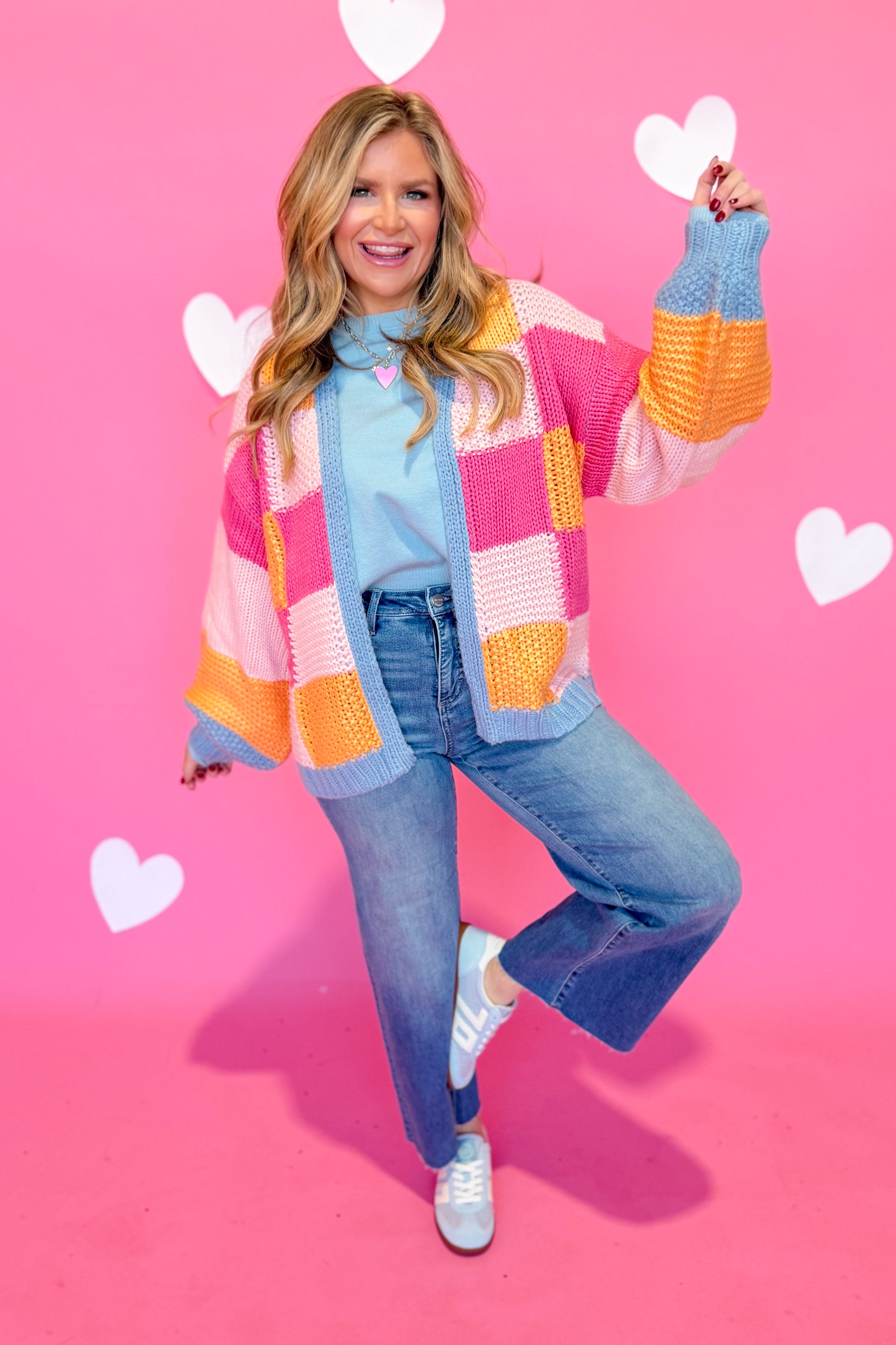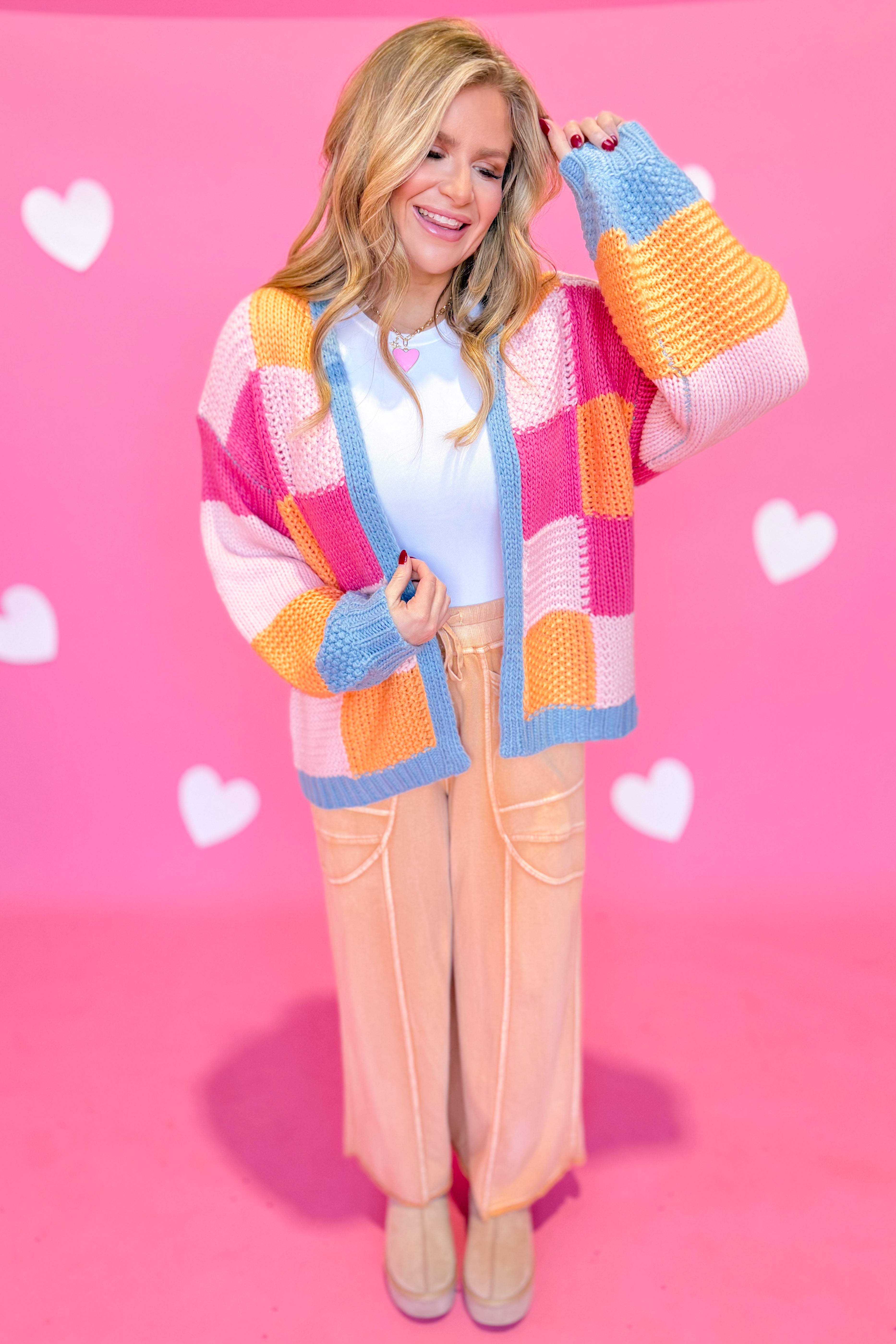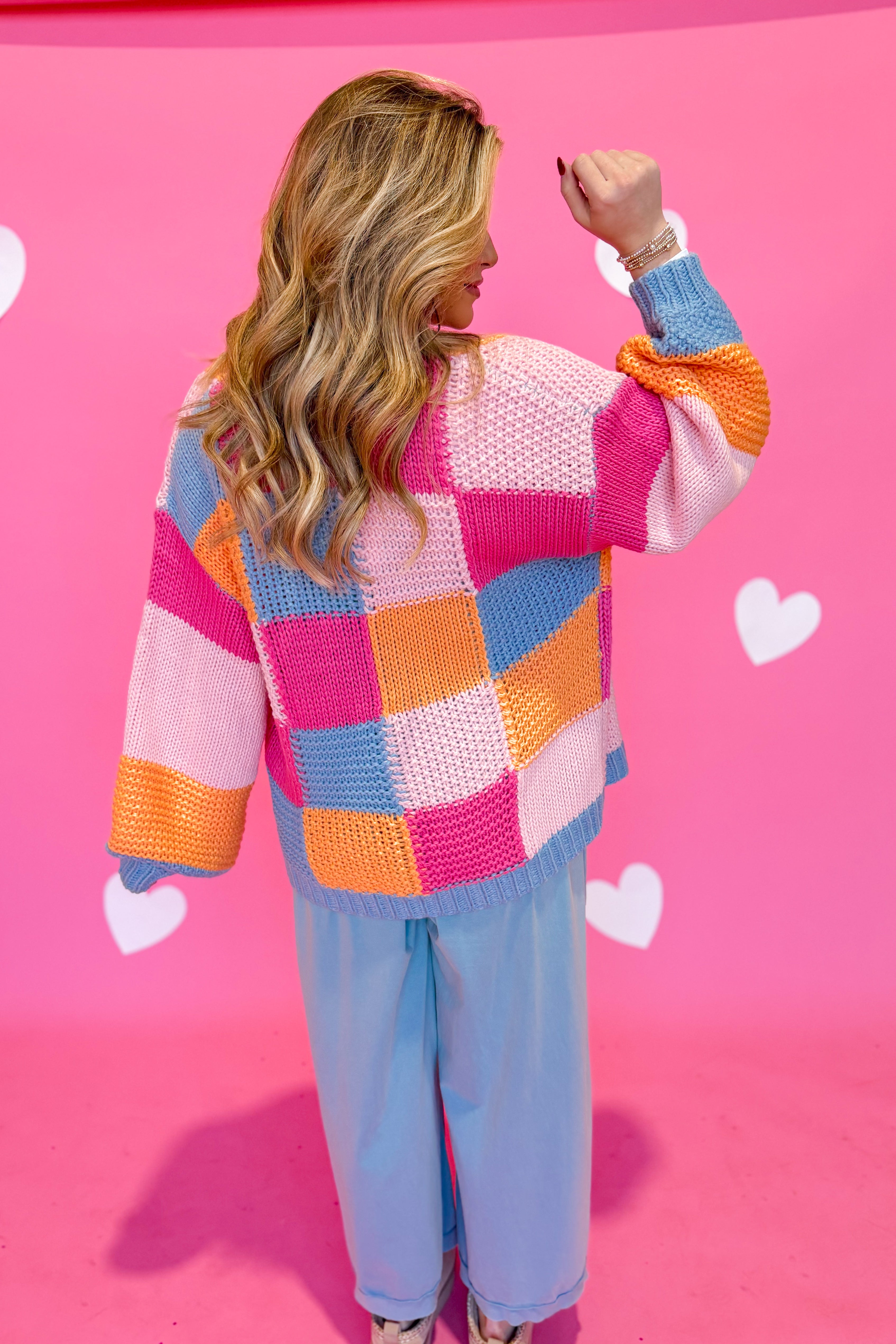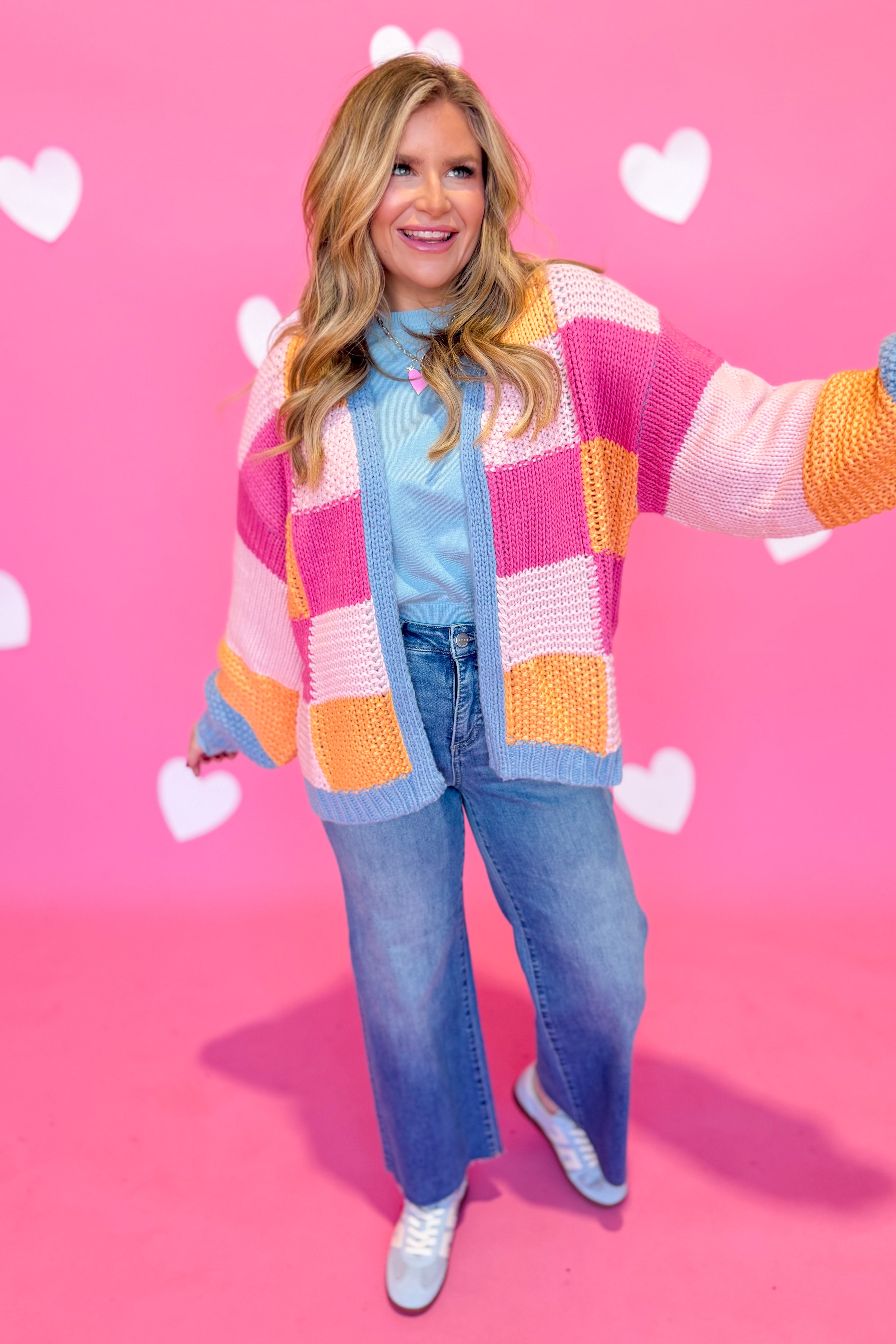 Layer up in cozy style with the Berkley Checkered Sweater Cardigan from Wishlist. This knitted cardigan features a timeless checkered pattern that pairs effortlessly with everything in your closet. The drop shoulder and oversized fit create that perfectly relaxed, effortless vibe—ideal for weekend hangs or casual office days. Long sleeves keep you warm while the roomy silhouette lets you move freely. Whether you're buttoning it up or wearing it open over a tee, this piece is your new go-to for looking put-together without trying too hard.