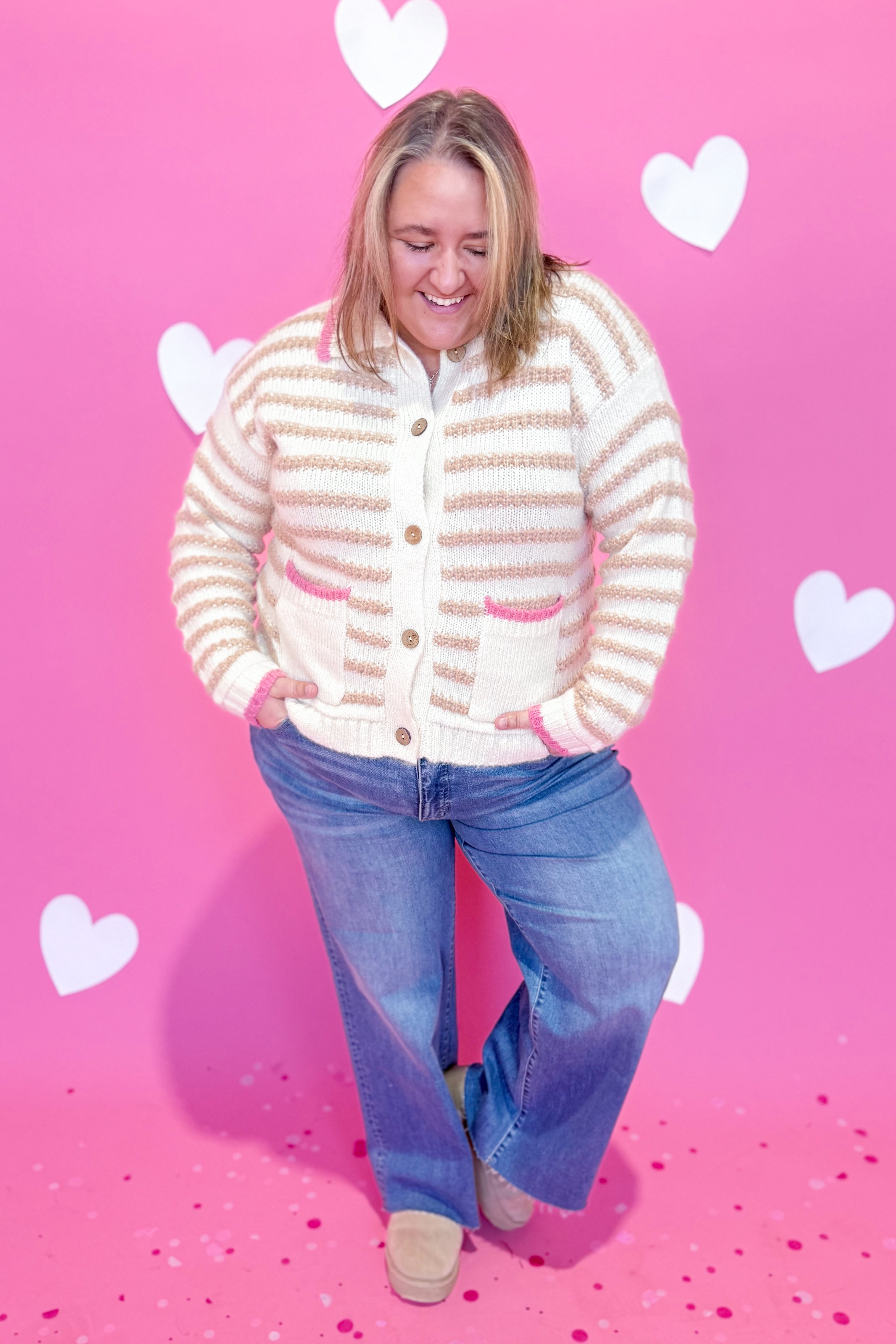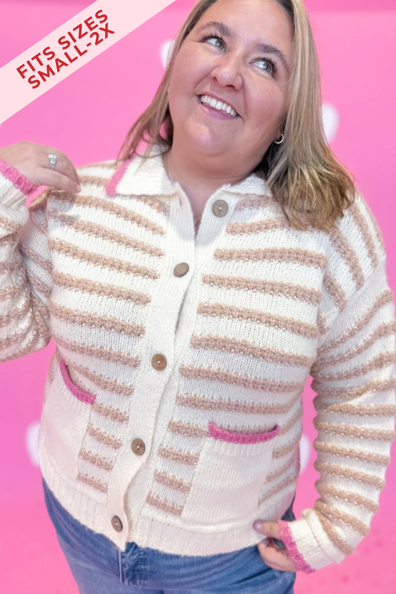 Stay stylish and cozy in the Betsy Striped Collar Button Down Sweater. This playful long-sleeve top features a classic collar, button-down front, and handy pockets for all your little essentials. The bold stripes add a fun twist, making it perfect for layering or wearing solo on any casual day.