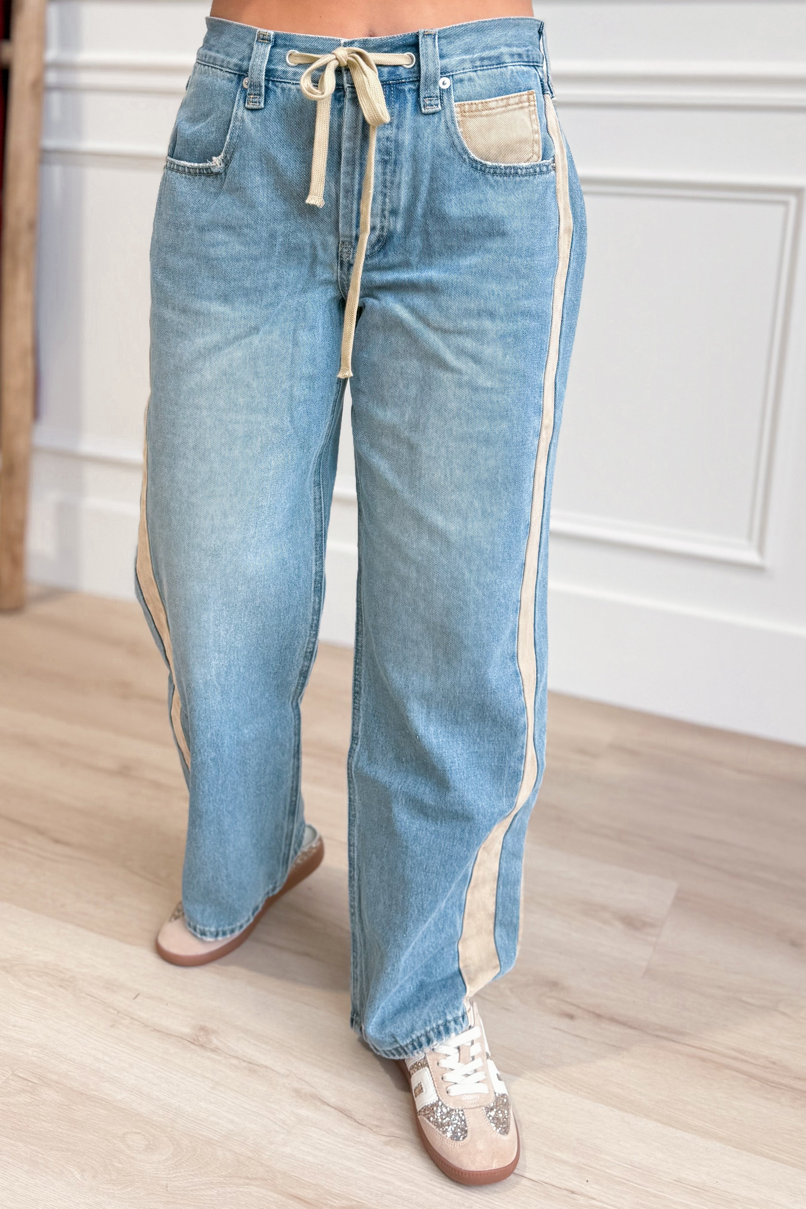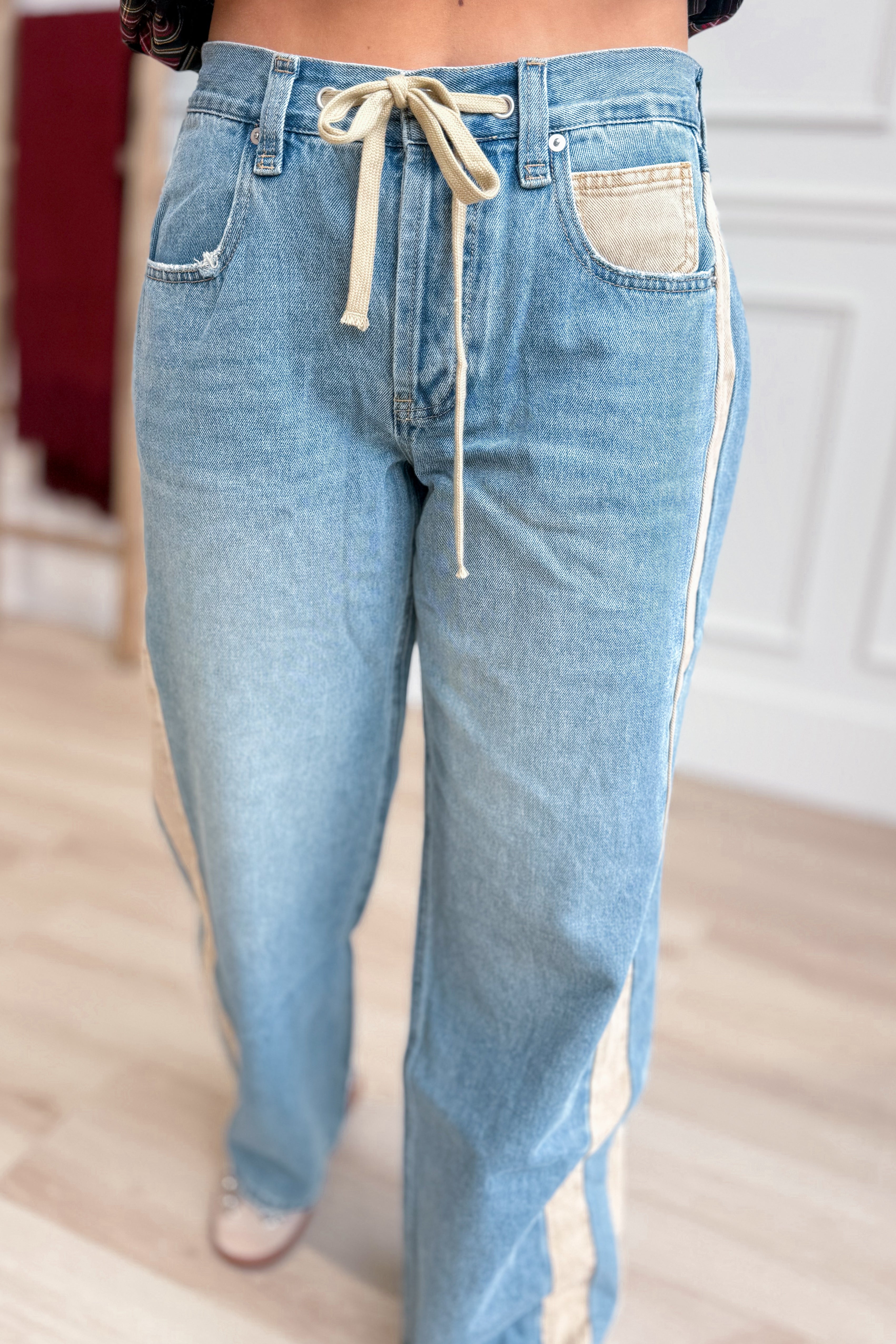 Step into effortless style with the Brandi Drawstring Button Waist Straight Leg Jean by Eesome. Featuring a chic taupe trim and a playful tie waist, these jeans bring a fun twist to your everyday look. With handy pockets and a flattering straight leg cut, they’re perfect for all-day comfort and casual cool vibes.
