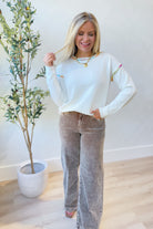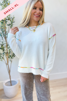 Add a splash of fun to your cozy wardrobe with the Brandi Multi Color Stitched Sweater by staccato. This long-sleeve, crew neck knit features a playful rainbow hem and drop shoulder design for a relaxed, comfy fit. Its stretchy fabric hugs you just right, making it perfect for layering or wearing solo on cooler days. Brighten up your style with this cheerful sweater that's as comfortable as it is colorful!