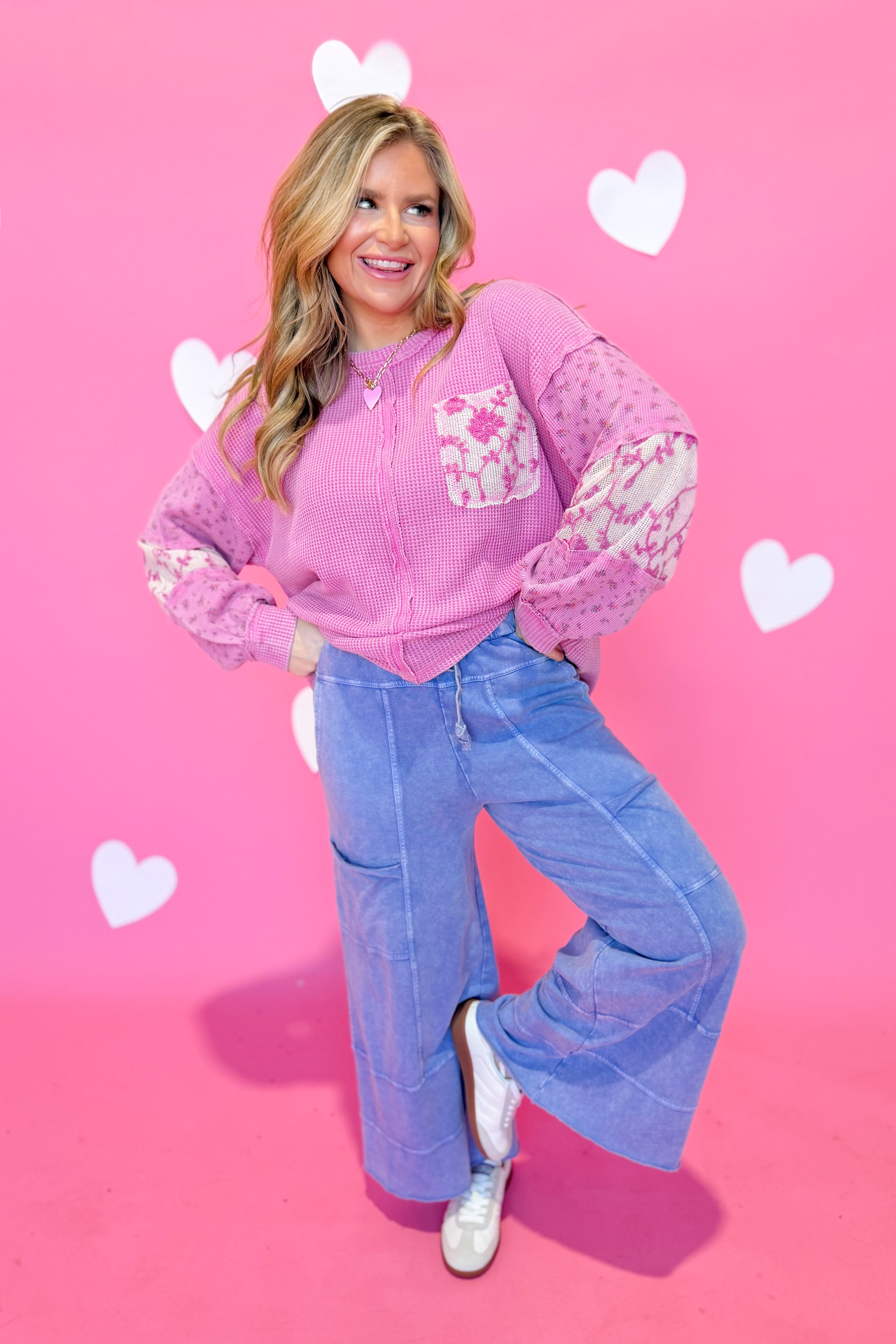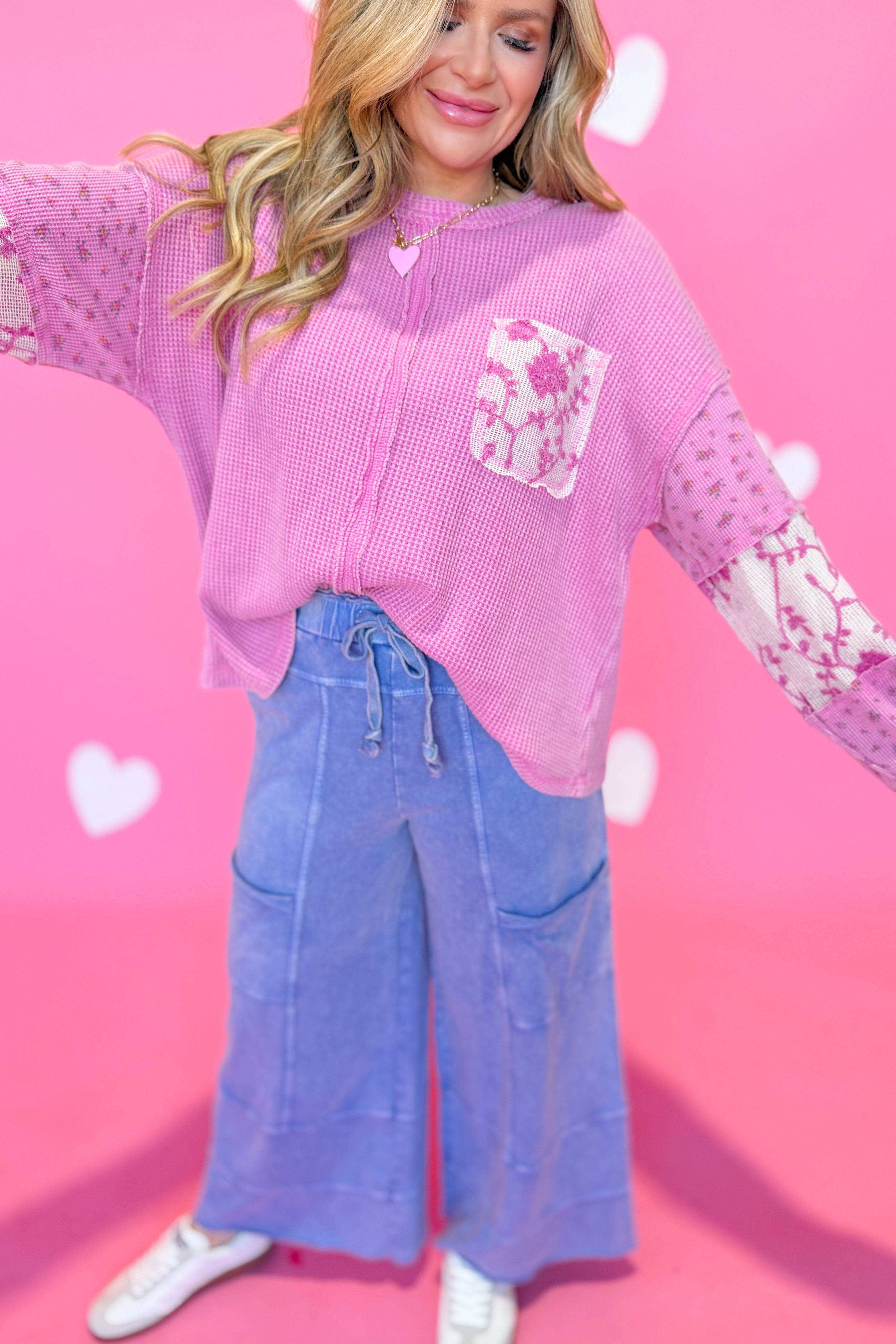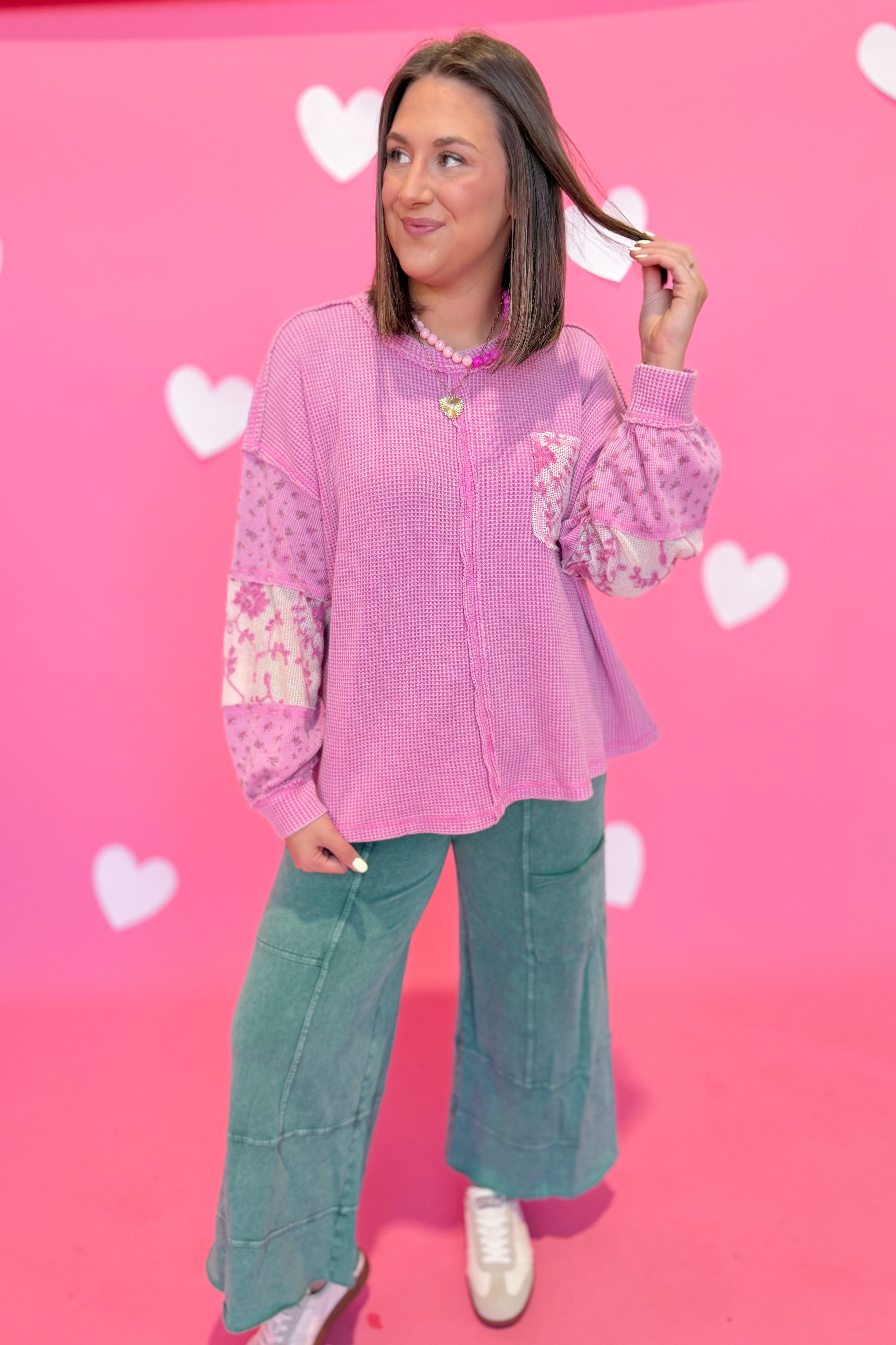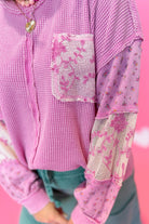 Elevate your everyday style with this charming Easel waffle knit top! Featuring a playful mixed pattern and relaxed drop shoulder silhouette, it's the perfect blend of comfort and character. The round neckline and long sleeves keep you cozy, while the convenient front pocket adds practical flair. Whether you're running errands or meeting friends, this versatile piece brings effortless style to any outfit.