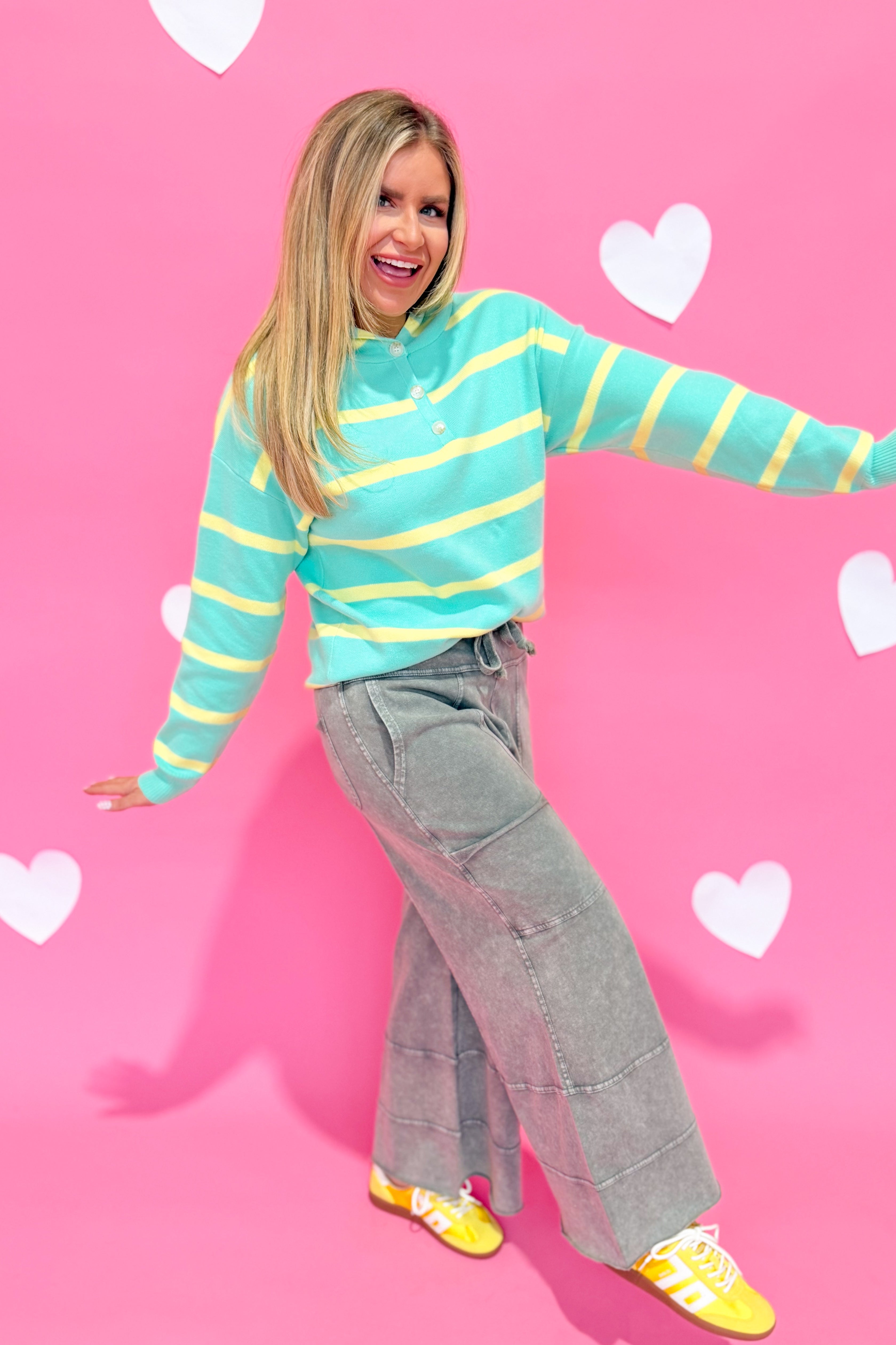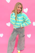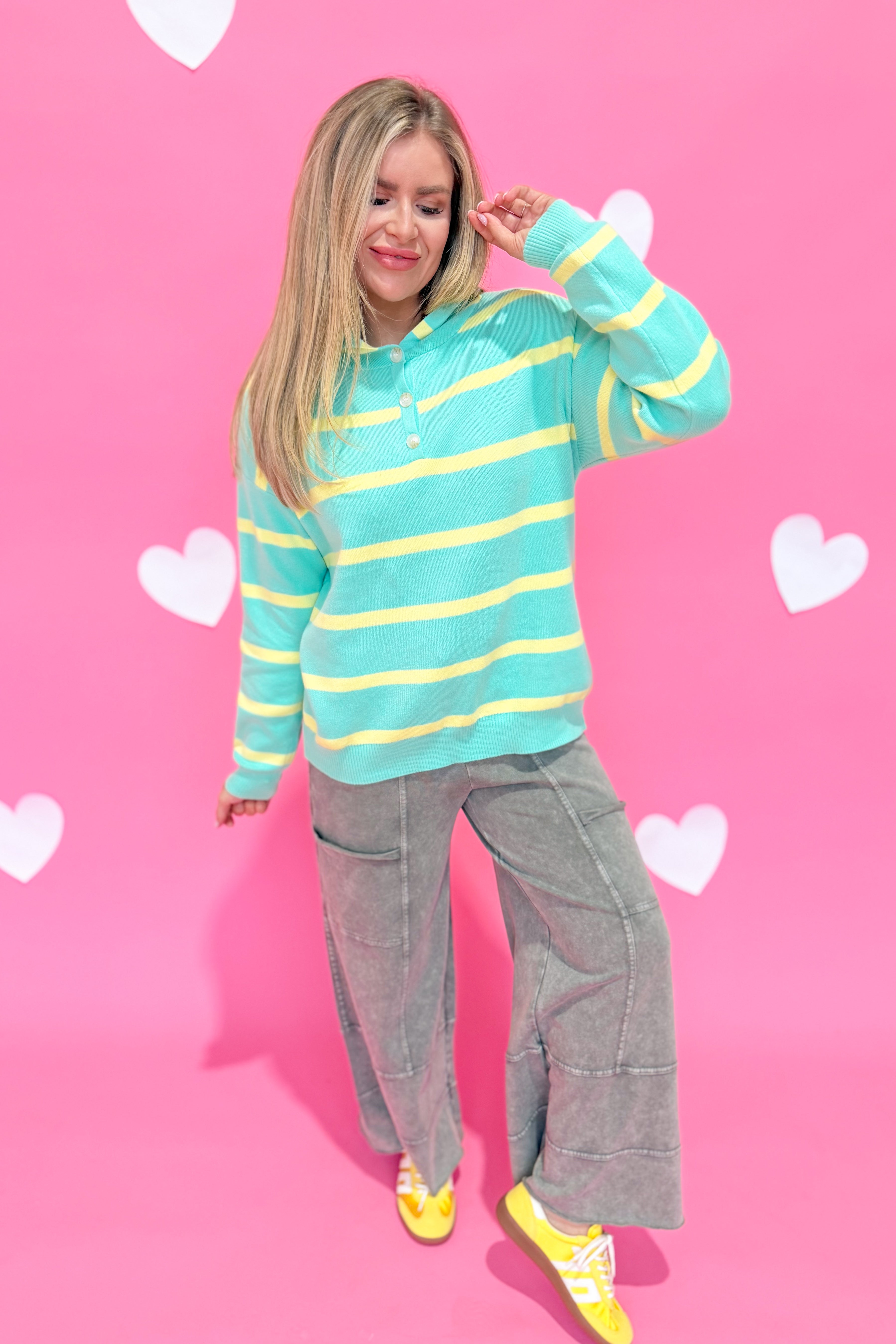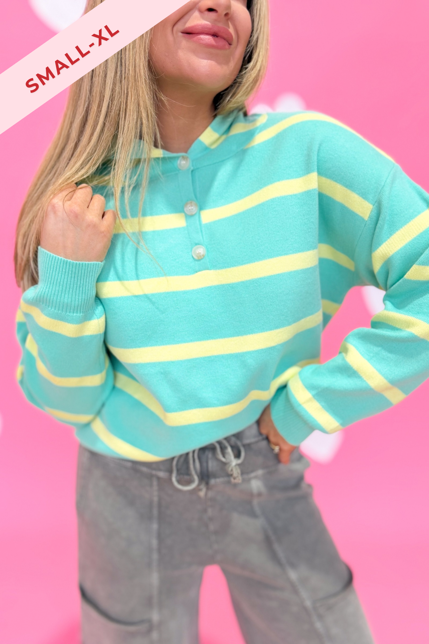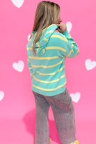 Stay cozy in style with the Gina Striped Half Button Pullover by Staccato. This playful long-sleeve hoodie features eye-catching stripes and a snap button collar that adds an effortless touch of cool. Perfect for layering or wearing solo, it's your go-to piece for casual comfort that doesn't compromise on personality. Snag yours and elevate your everyday wardrobe.
