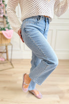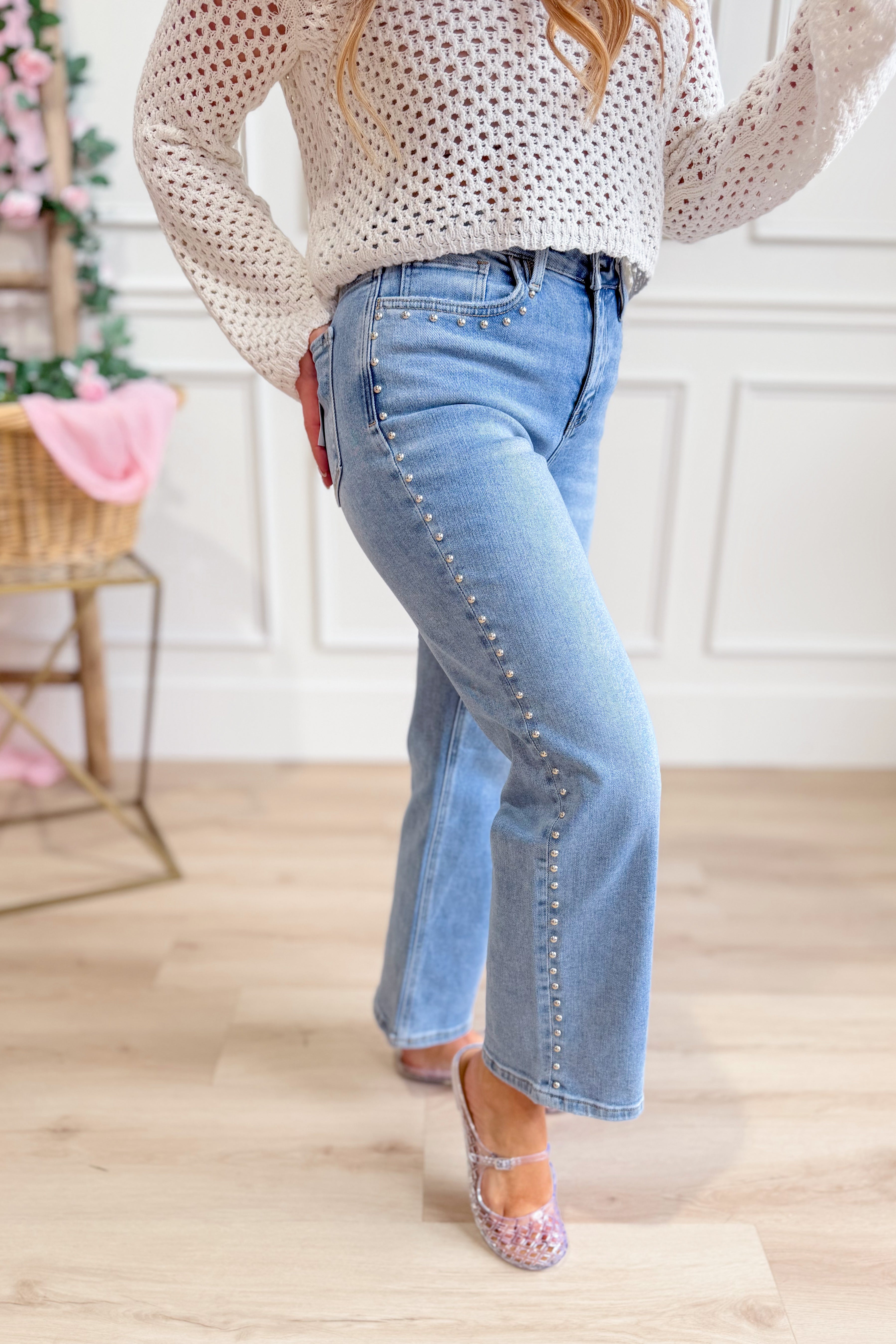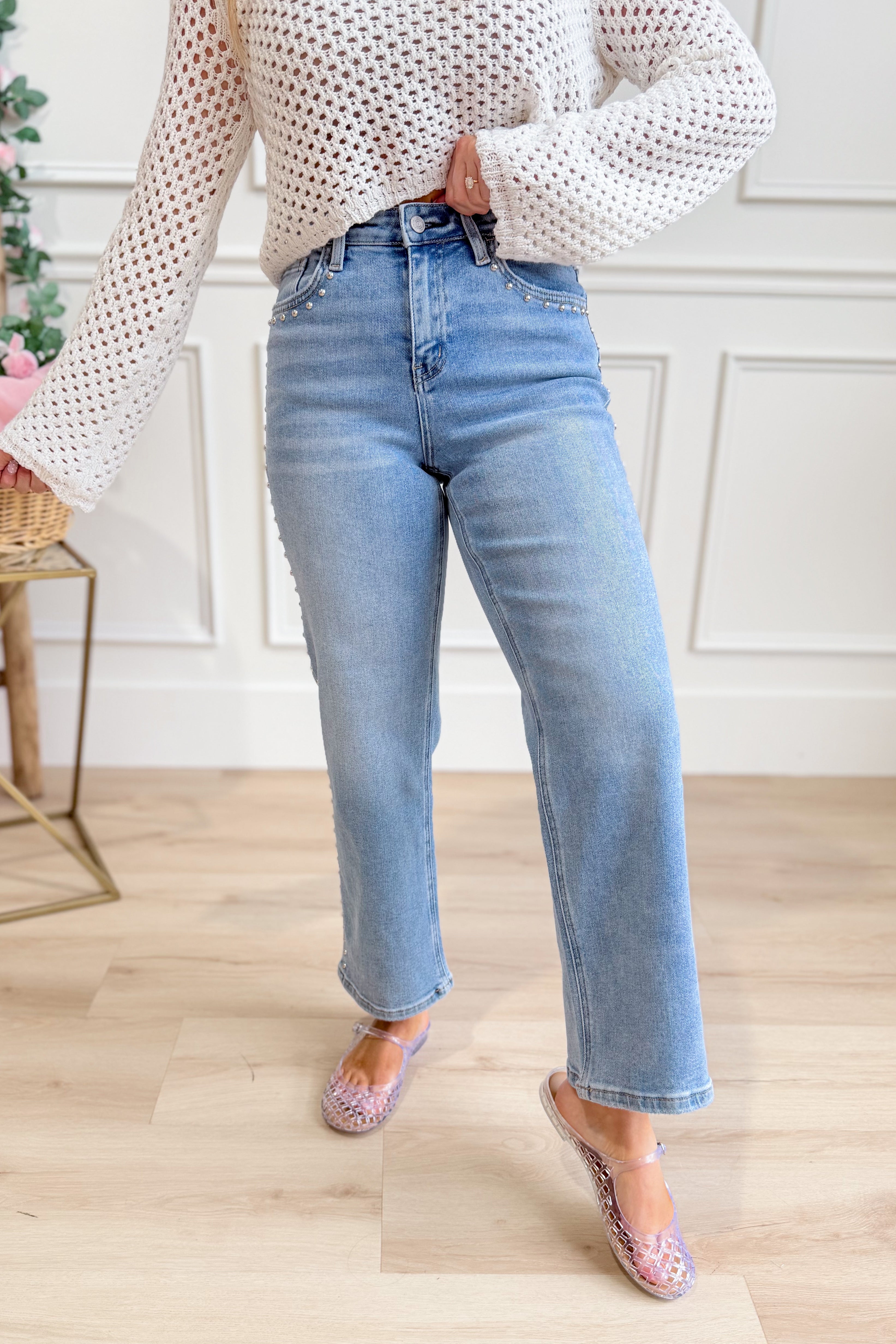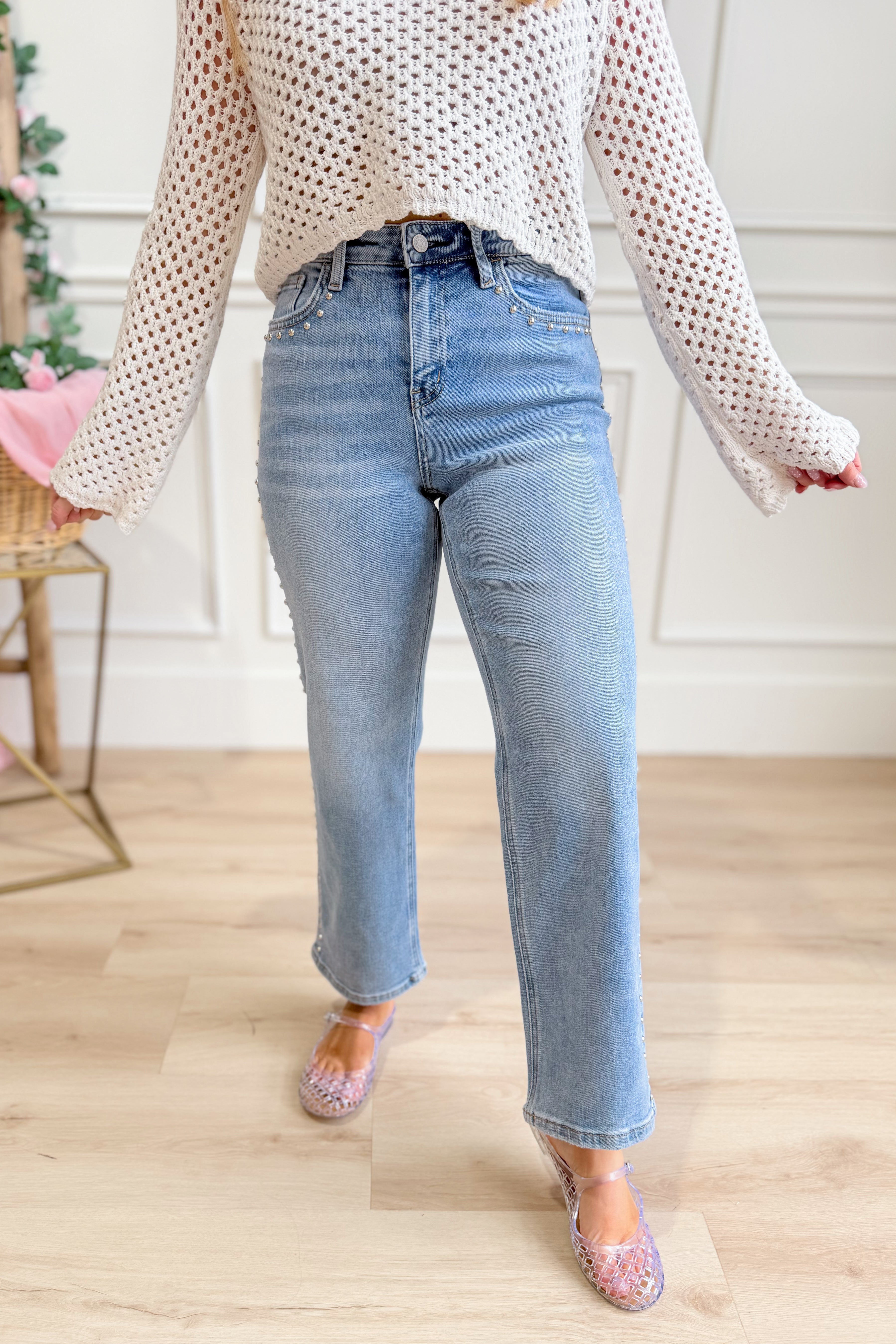 Rock a look that's equal parts edgy and elegant with these Honorable High Rise Ankle Slim jeans from Vervet. Crafted in a crisp light wash, they feature eye-catching stud details that add serious personality to your everyday rotation. The high rise silhouette flatters your figure while the slim ankle cut keeps things sleek and modern. Perfect for dressing up or down, these statement jeans are ready to become your new favorite pair.