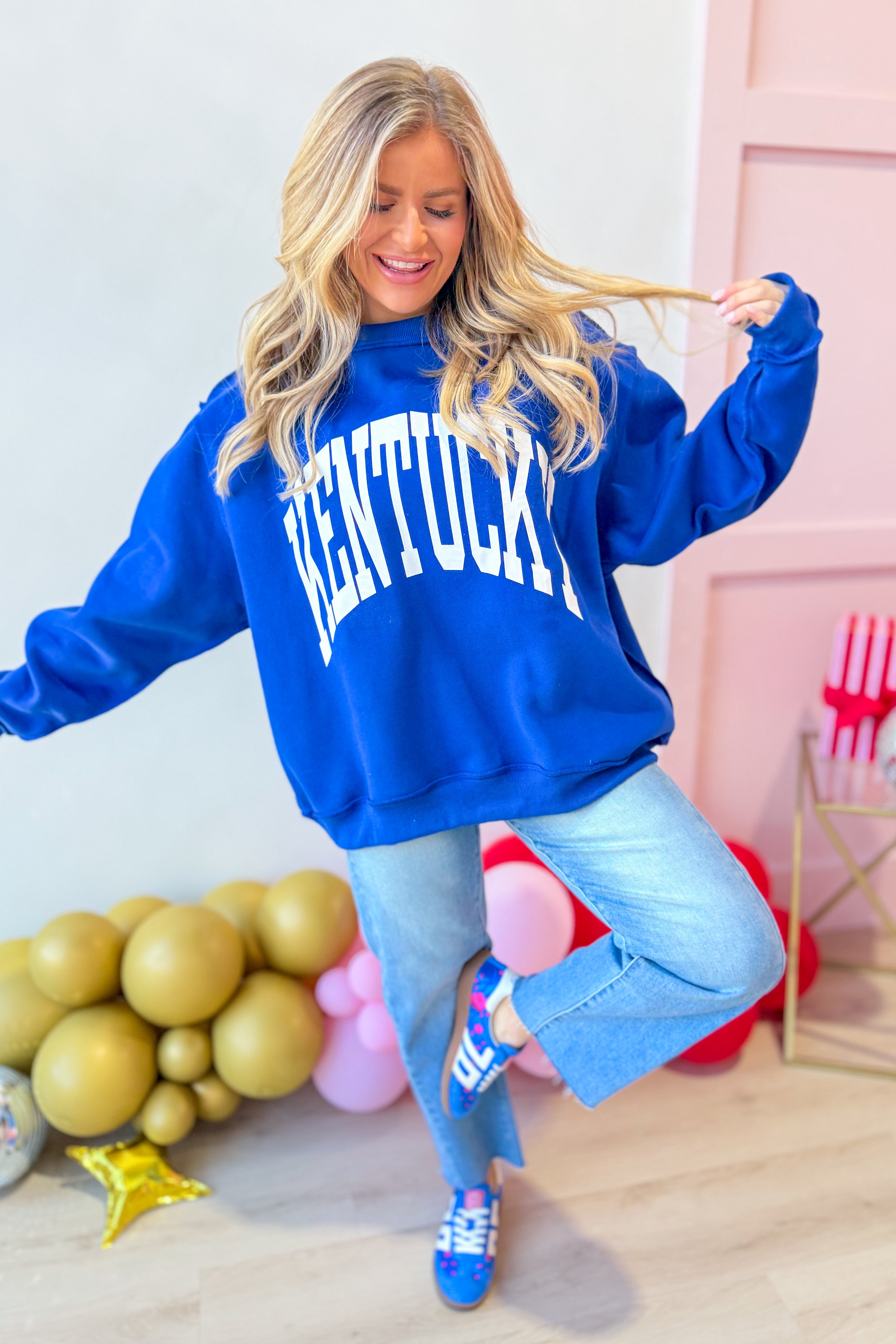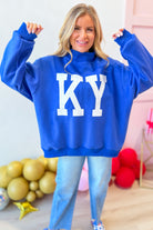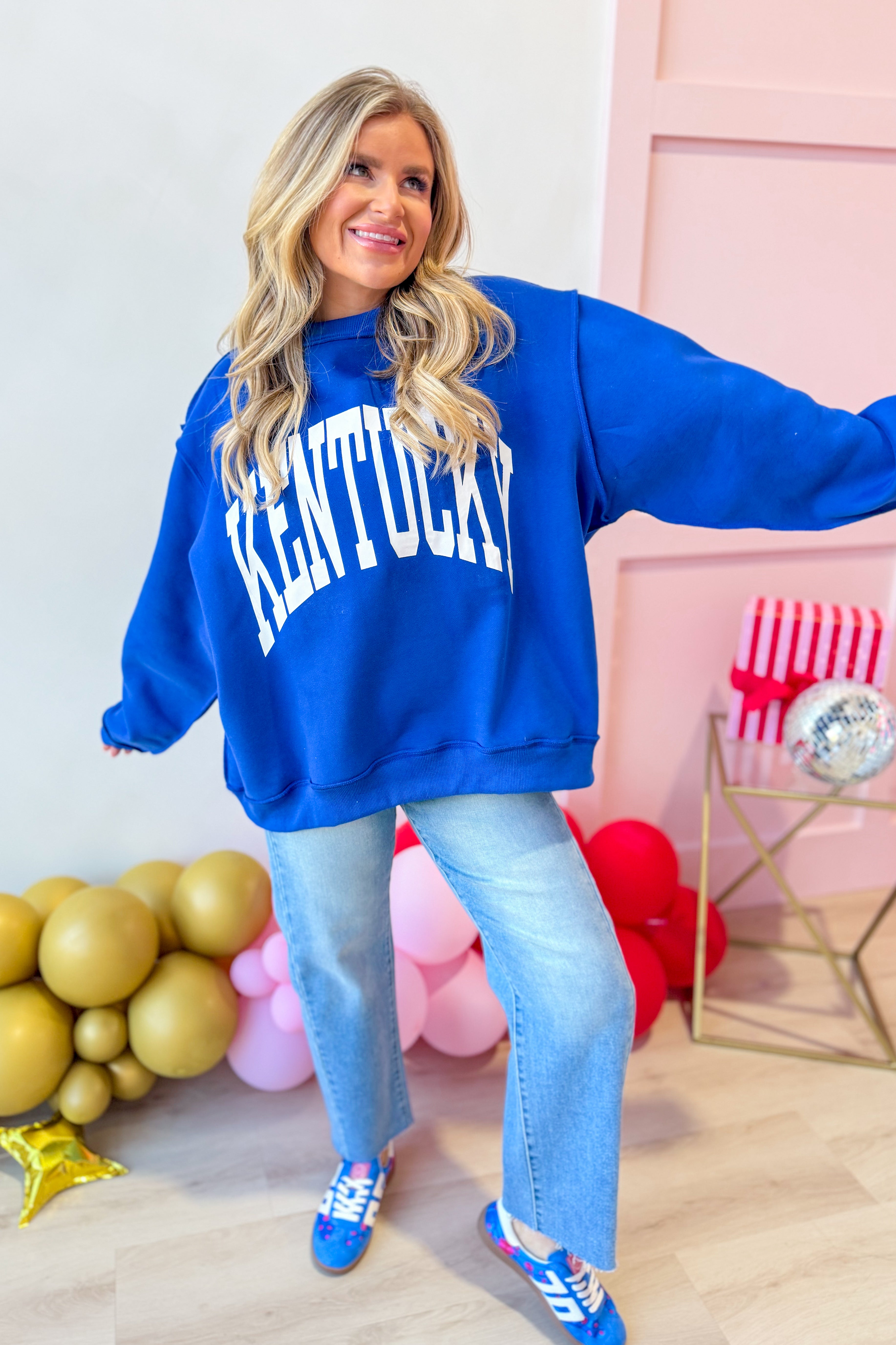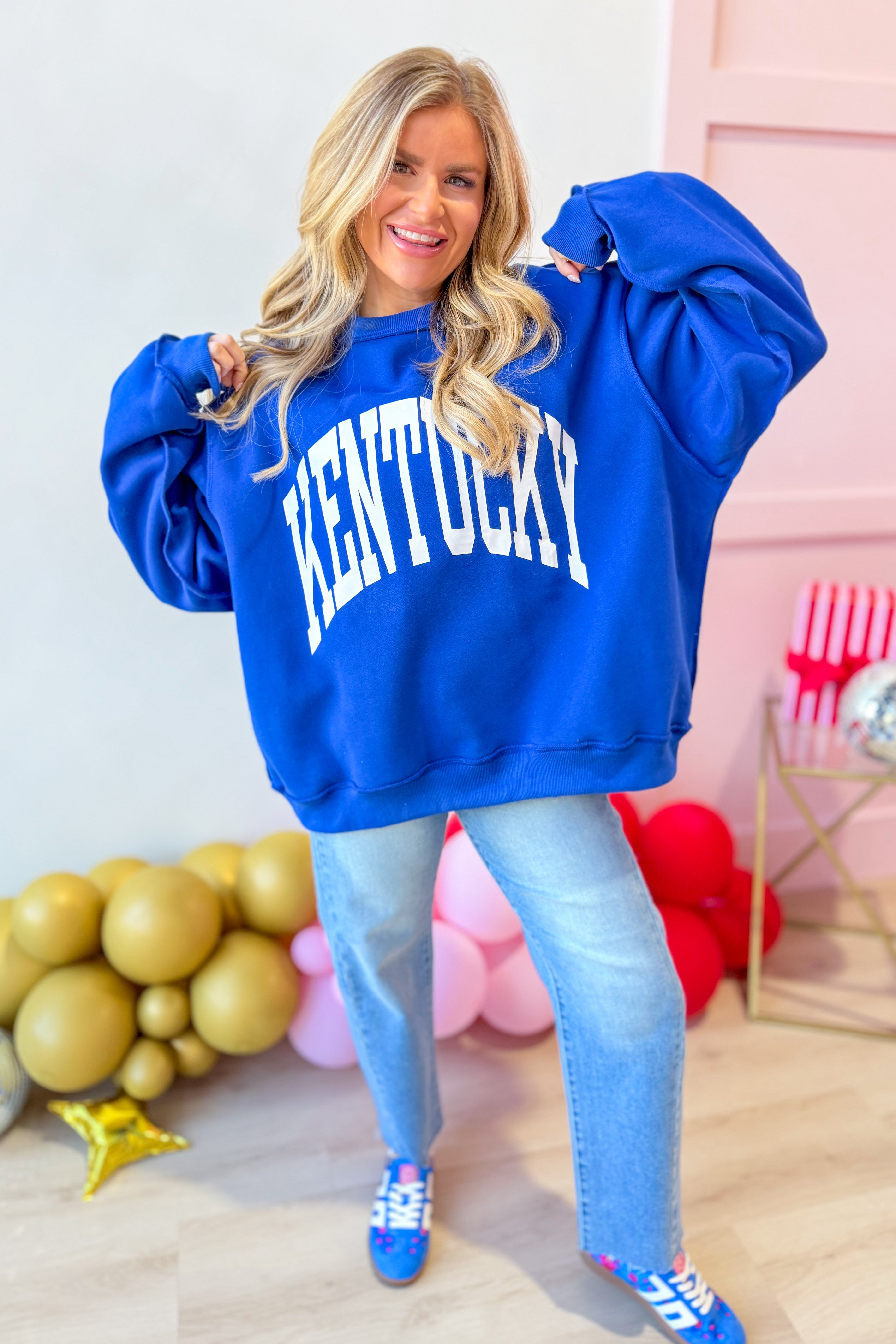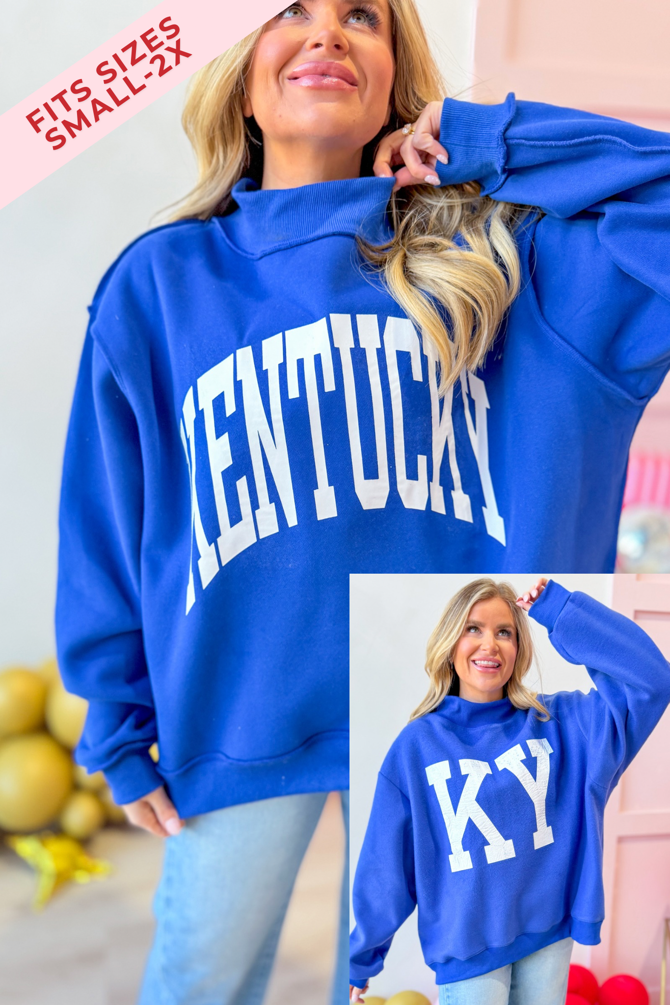 Rock two looks in one cozy piece! This oversized reversible sweatshirt features a mock neck and flips between a bold Kentucky graphic. Perfect for switching up your vibe without changing clothes. Whether you're repping your home state or embracing your softer side, this playful essential has you covered—literally.