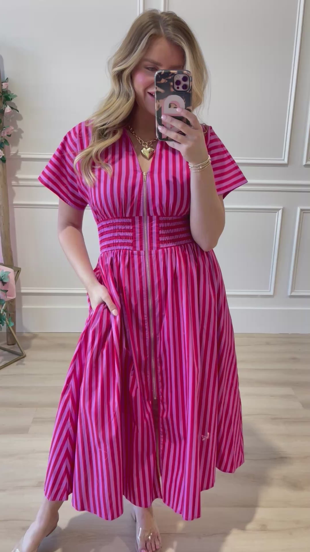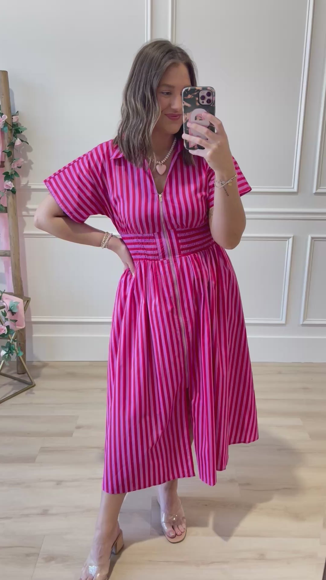 Elevate your dress game with this chic Entro striped number that's equal parts fun and fabulous. The collared neckline and split neck detail add a flirty twist, while the zip-down front gives you easy on-and-off convenience. Short sleeves keep things breezy, and the playful stripes bring instant personality to your wardrobe. Perfect for dressing up any occasion without taking yourself too seriously.