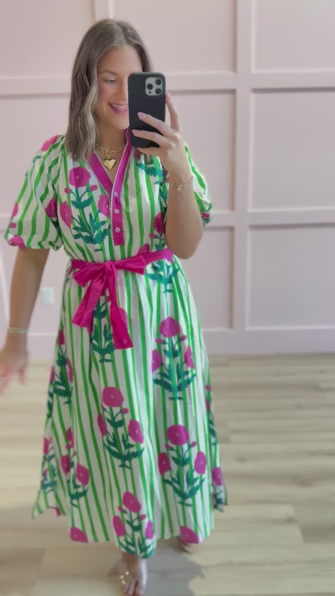 Meet your new go-to dress! This Umgee midi features adorable puff sleeves and a flattering split neckline that's totally on-trend. The playful mix of stripes and florals keeps things fun and fresh, while solid trim details add polish. Tie the waist to create the perfect silhouette and show off your style. Whether you're heading to brunch, a garden party, or a casual night out, this dress delivers effortless charm and comfort all day long.