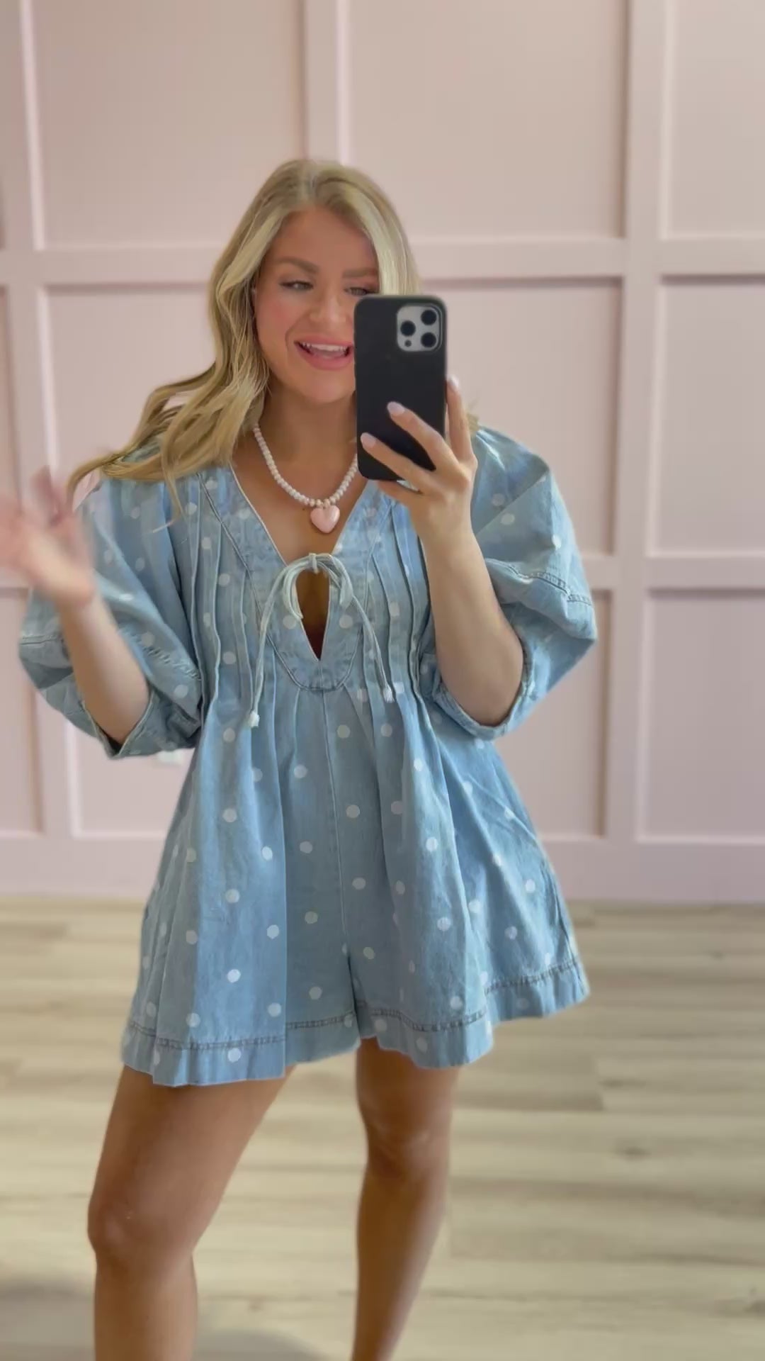 Twirl into fun with the Loran Pleated Polka Dot Romper by Peach Love! This playful one-piece features charming polka dots, romantic puff sleeves, and a flirty tie-front detail that cinches your silhouette. The pleated design adds movement and dimension, while the half-sleeve cut keeps things breezy and effortless. Perfect for weekend adventures or casual hangouts, this romper brings vintage-inspired charm with a modern twist.