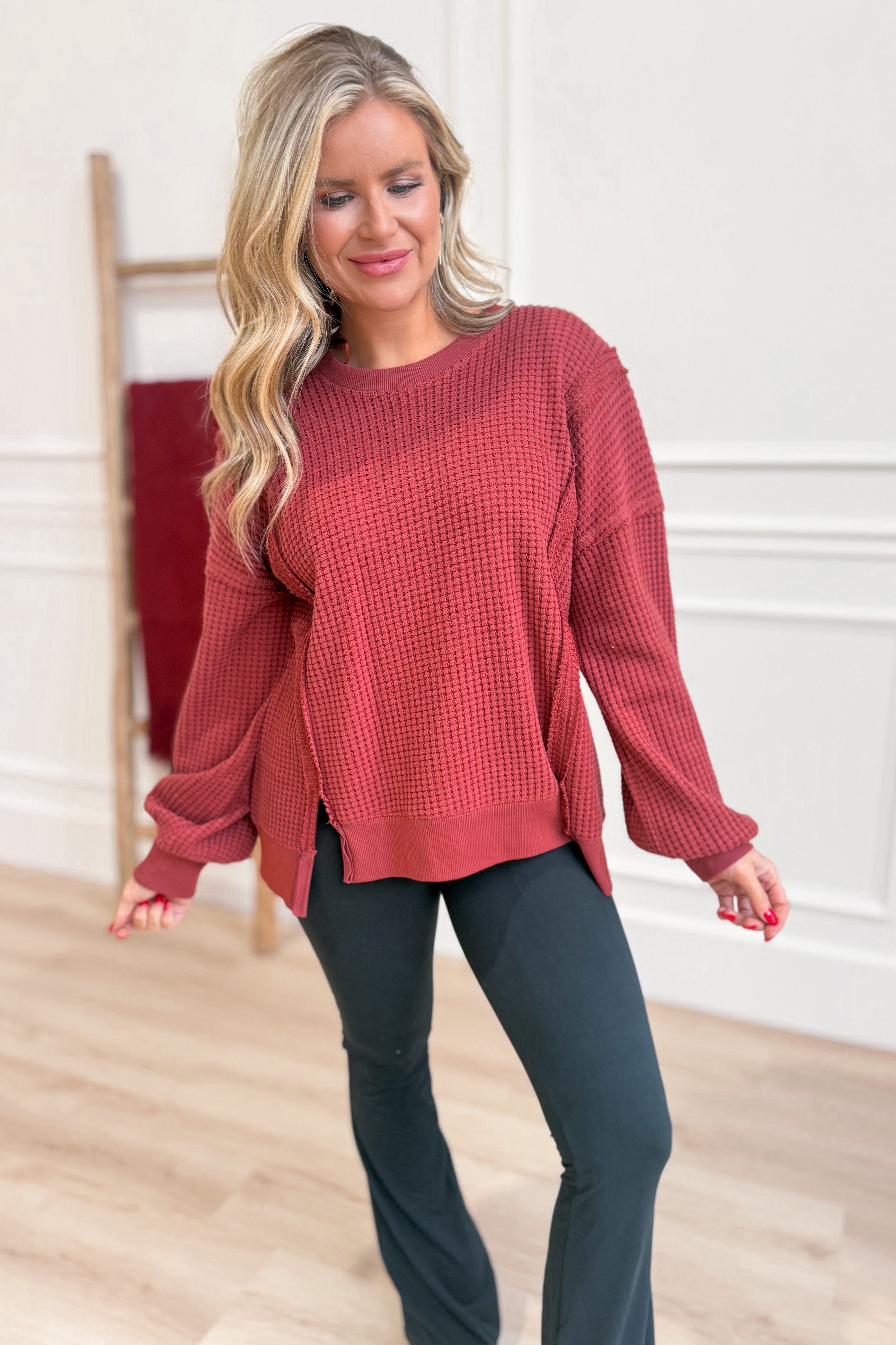 Cozy up in the Natalia Oversized Waffle Knit Pullover, designed for a relaxed fit with a playful drop shoulder and flattering scoop neck. The soft waffle knit fabric and side slits add extra comfort and movement, while long sleeves keep you warm and stylish all day long. Perfect for lounging or layering with a fun, carefree vibe!