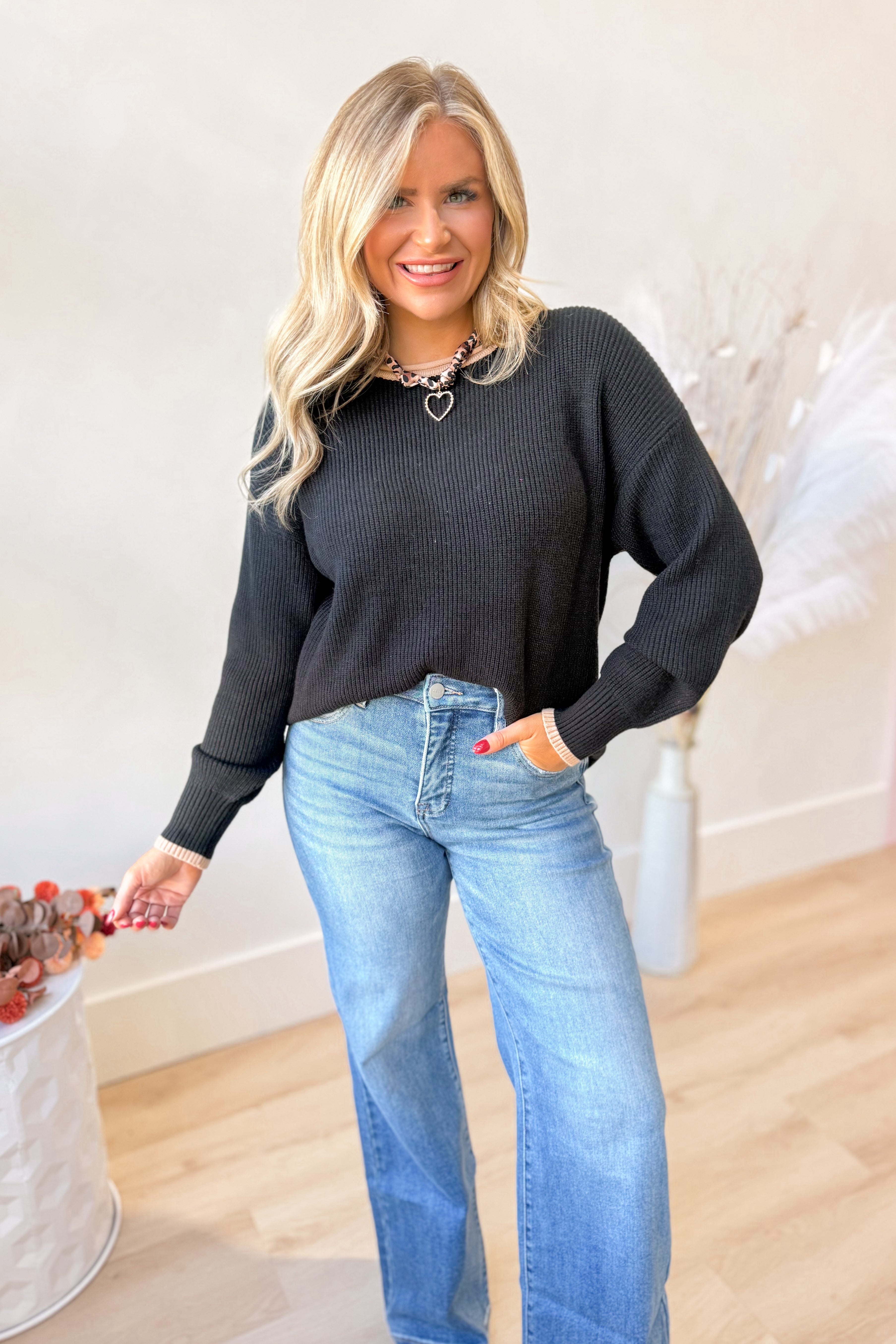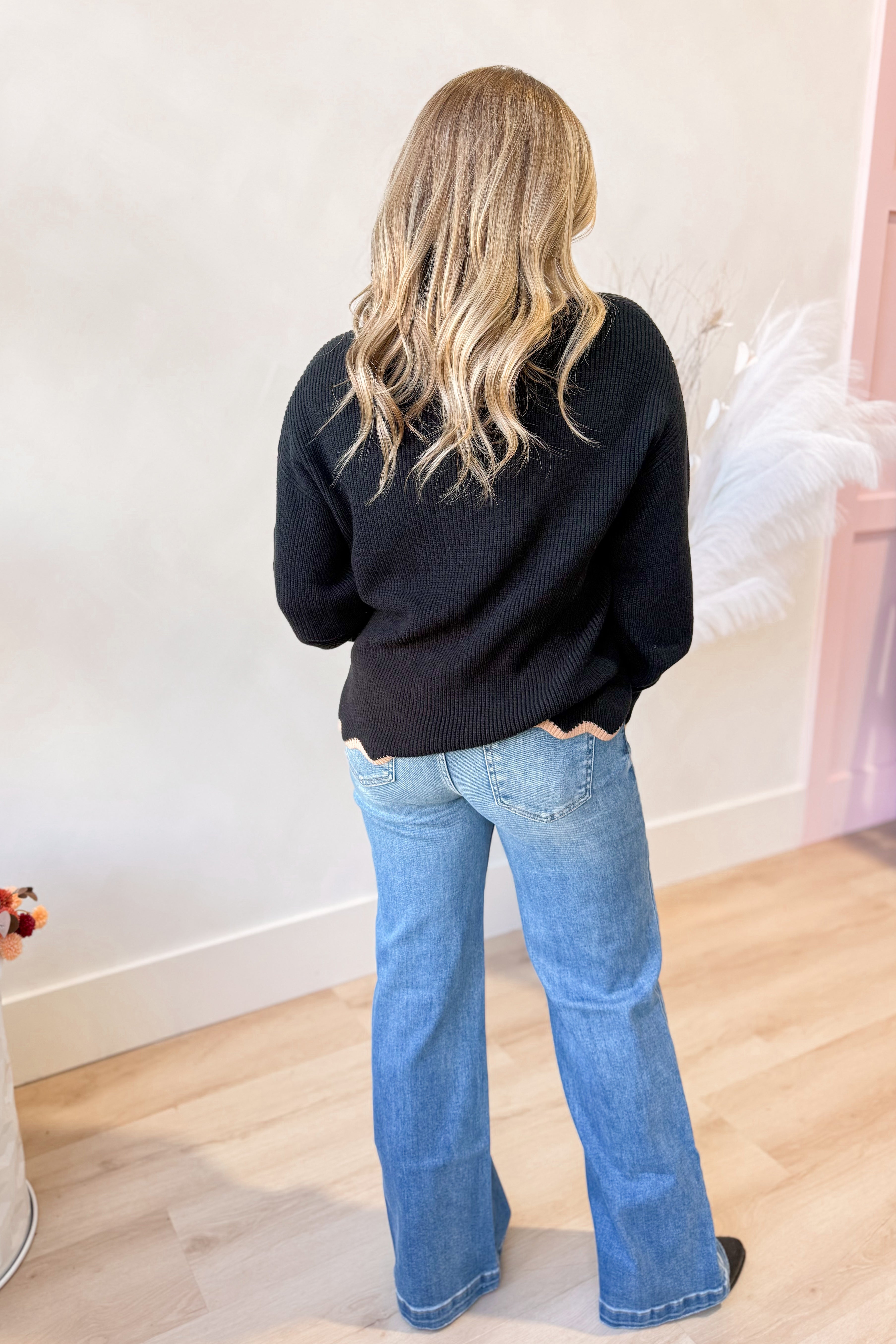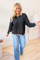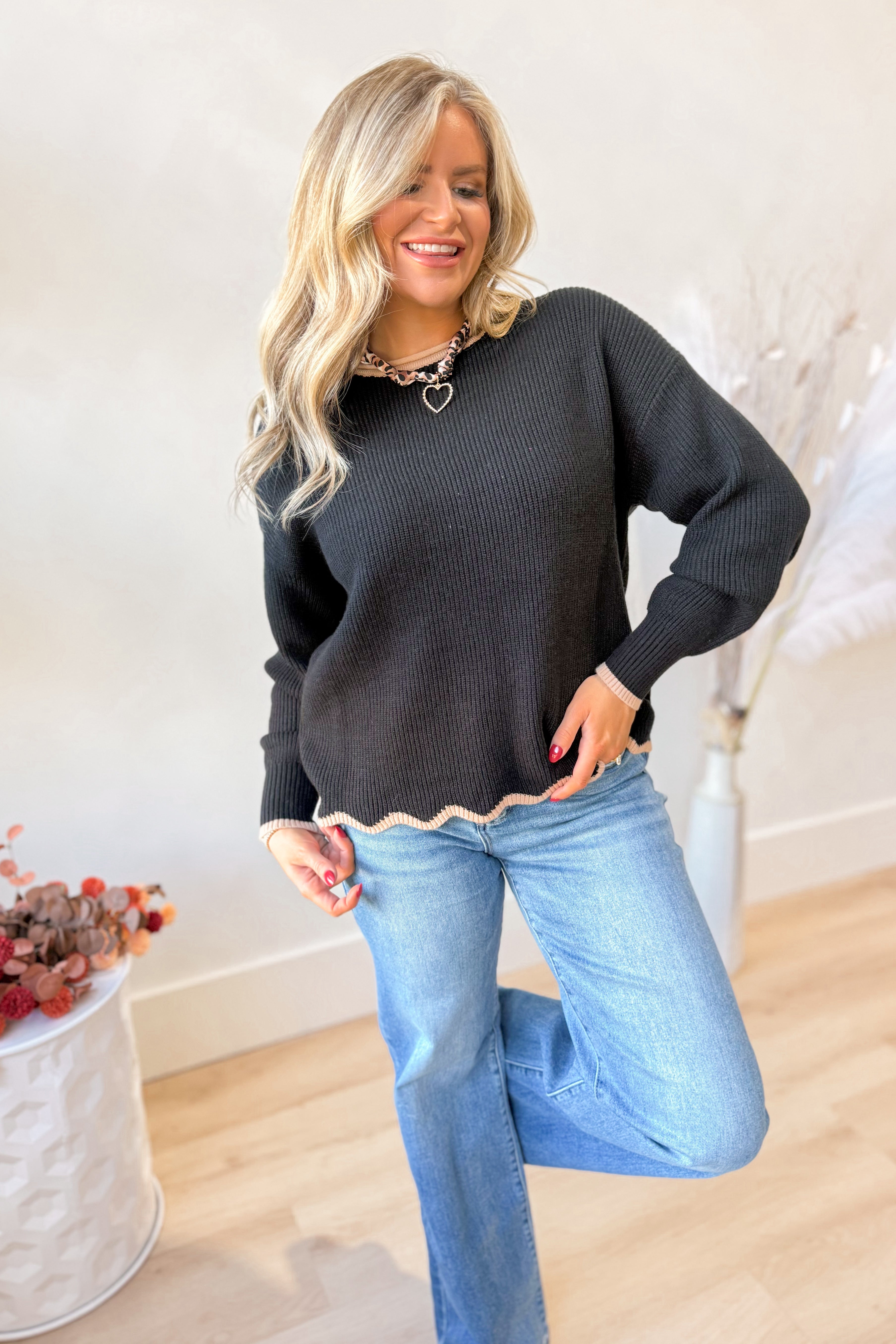 Stay cozy and stylish in the Olivia Contrast Scallop Pullover Sweater. This knitted long-sleeve features a charming scallop trim and a contrasting detail around the round neckline, adding a fun twist to a classic solid design. Perfect for layering, it brings warmth with a playful edge to your everyday wardrobe.