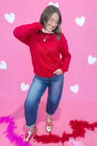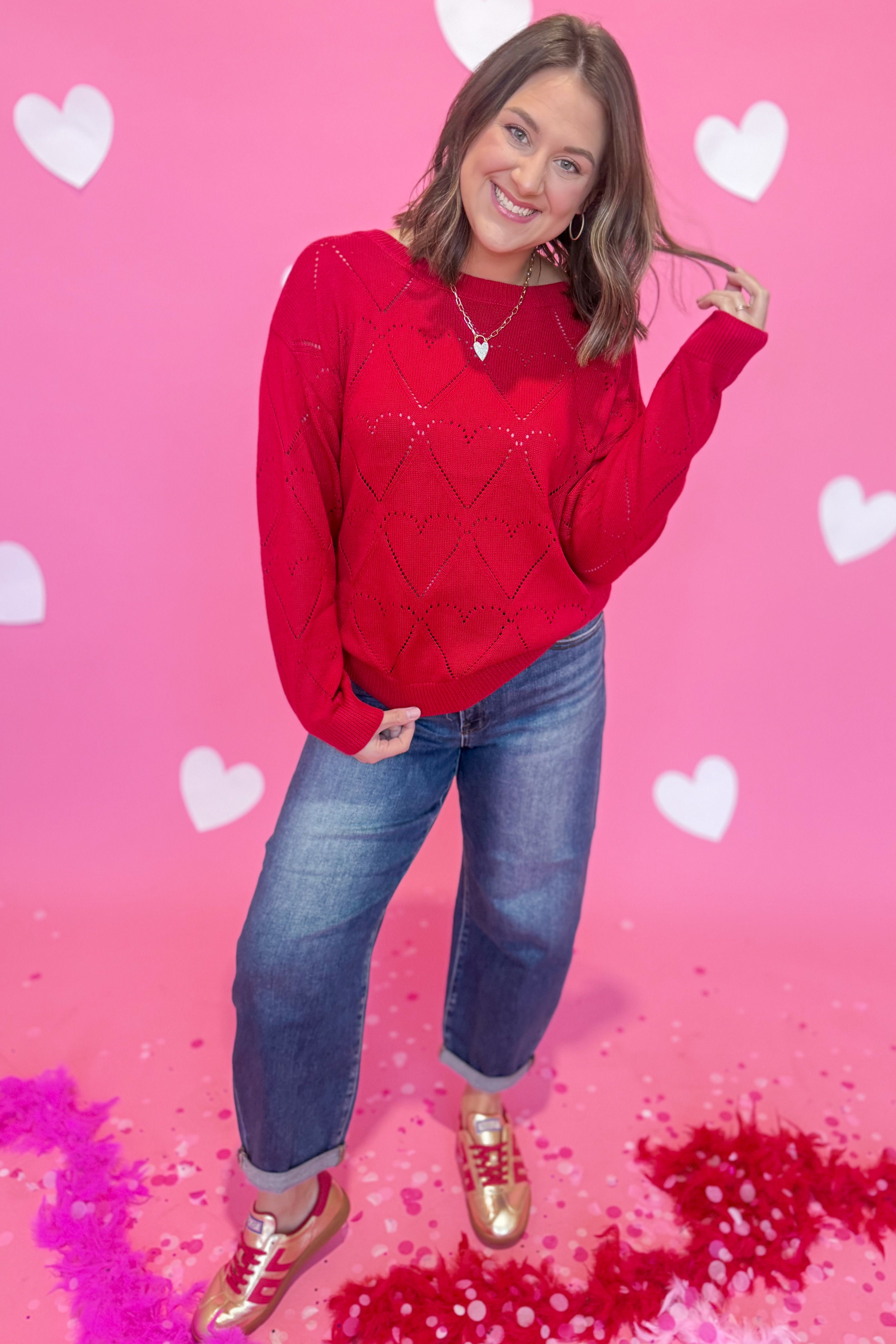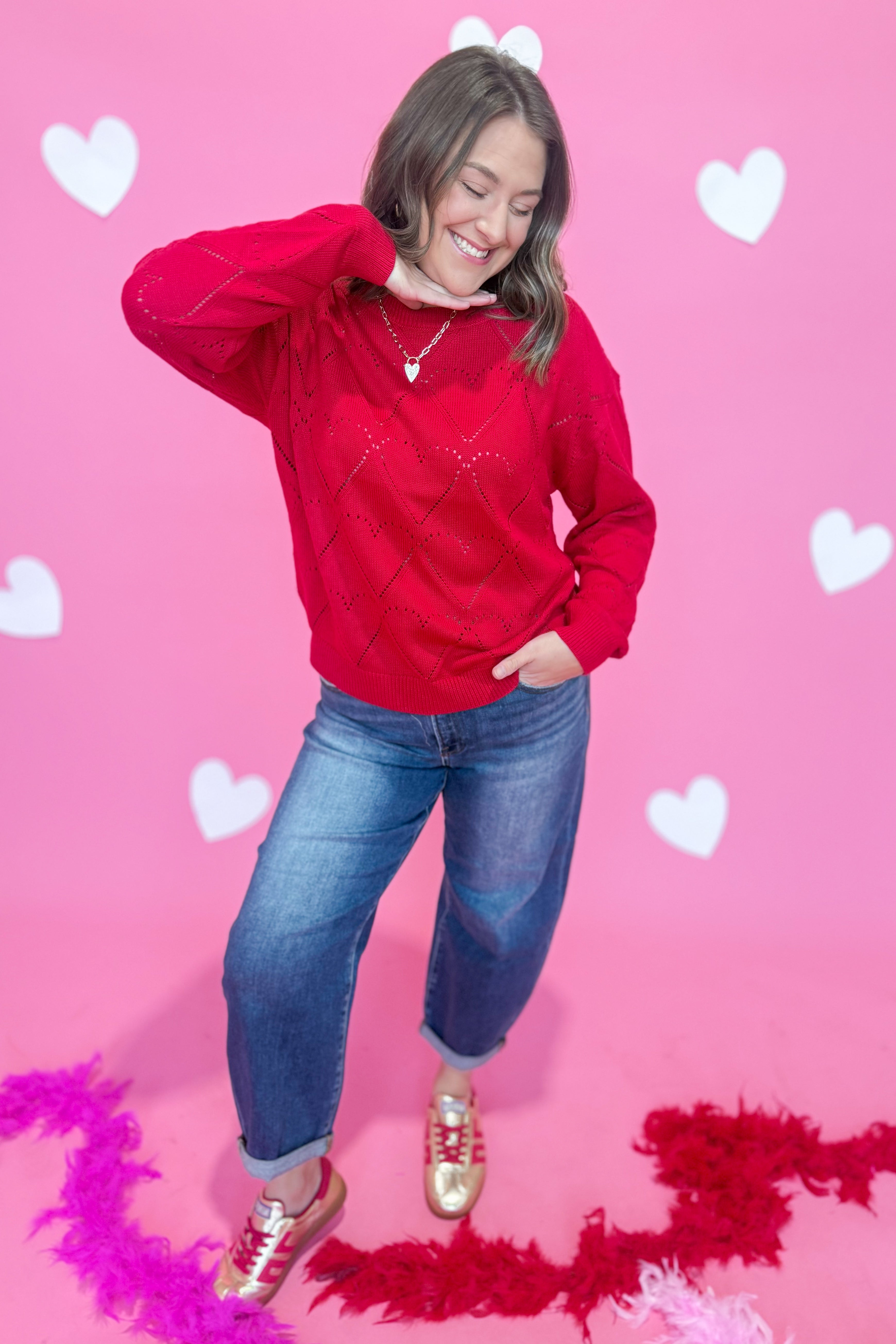 Cozy up in the Rosie Heart Shaped Texture Sweater by Sunday Edition—a charming knit that's equal parts sweet and stylish. Featuring an adorable heart texture throughout, this sweater brings a touch of whimsy to your everyday wardrobe. The relaxed boat neckline and long sleeves create an effortlessly chic silhouette that works for casual hangouts or laid-back dates. Soft, huggable sweater knit keeps you warm and comfortable all season long. Perfect for anyone who believes fashion should be fun!