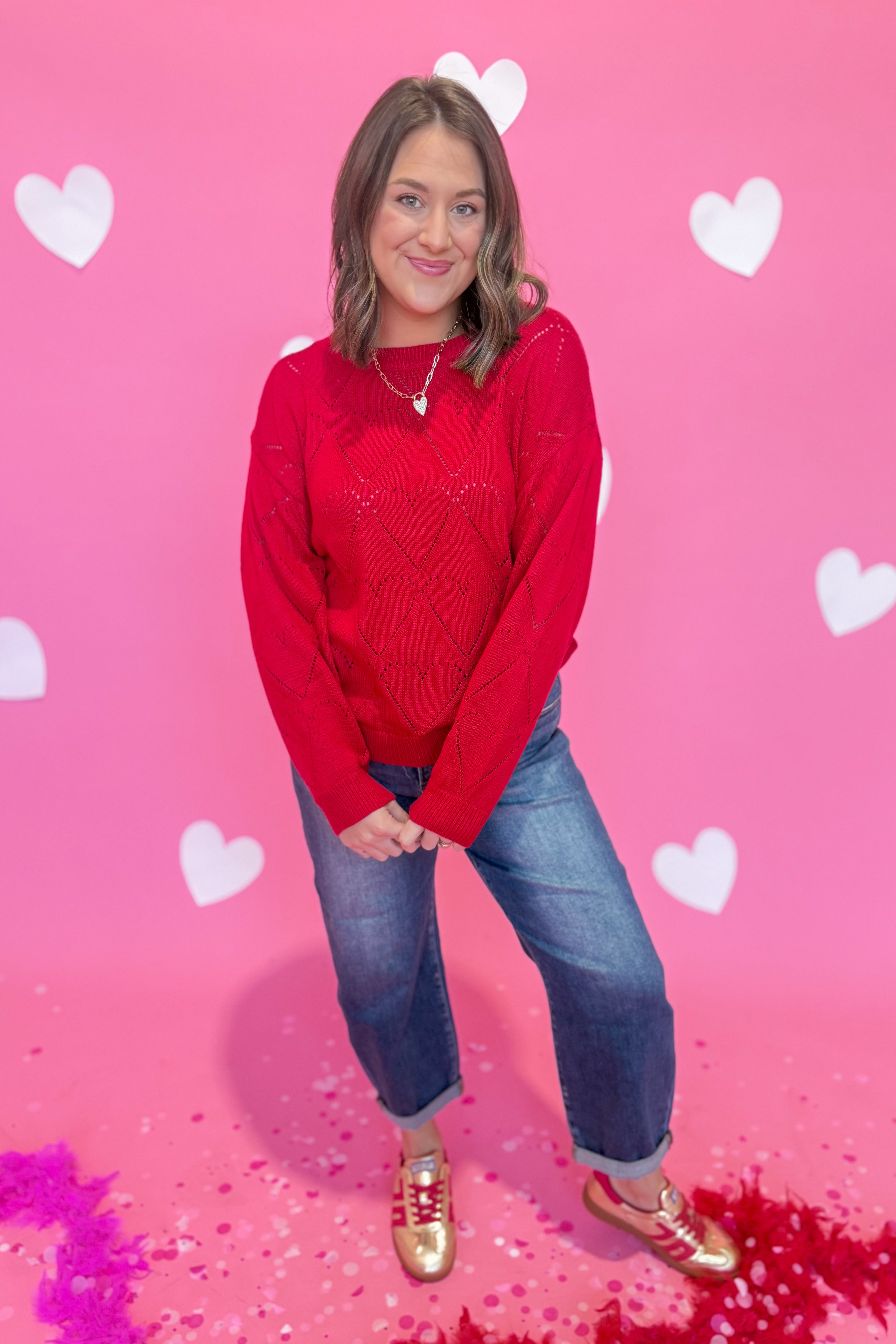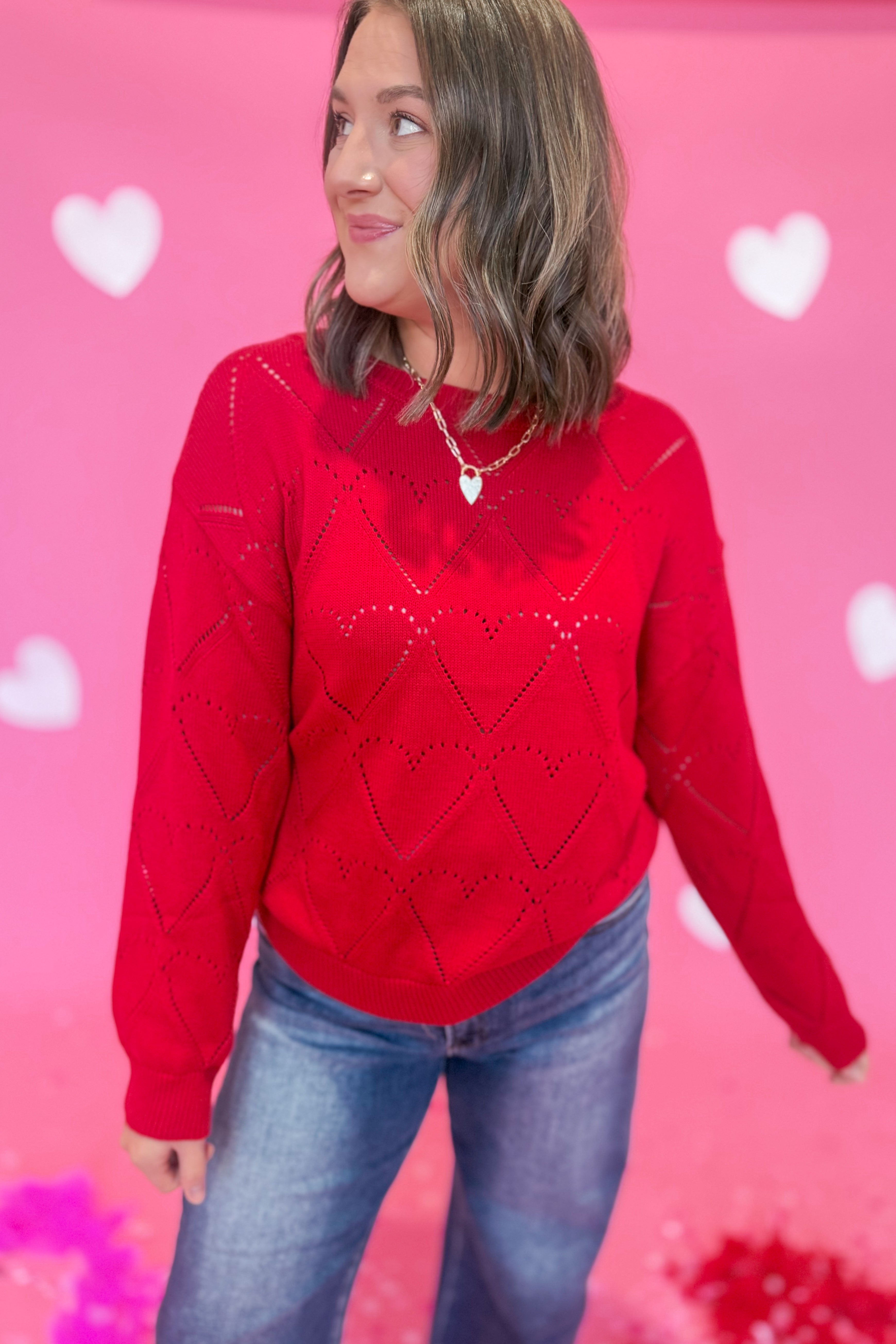 Cozy up in the Rosie Heart Shaped Texture Sweater by Sunday Edition—a charming knit that's equal parts sweet and stylish. Featuring an adorable heart texture throughout, this sweater brings a touch of whimsy to your everyday wardrobe. The relaxed boat neckline and long sleeves create an effortlessly chic silhouette that works for casual hangouts or laid-back dates. Soft, huggable sweater knit keeps you warm and comfortable all season long. Perfect for anyone who believes fashion should be fun!