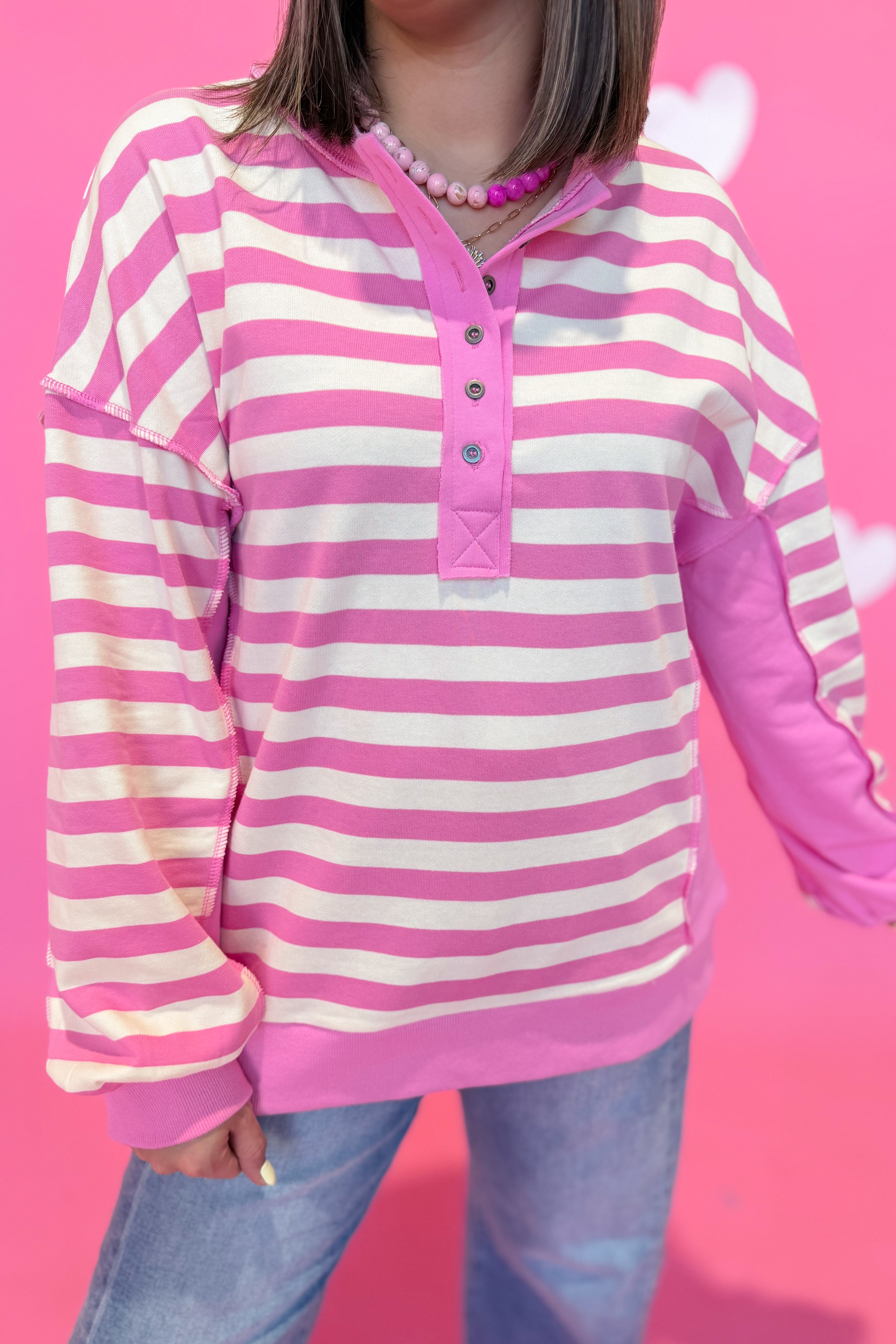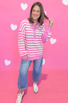 Effortlessly cool meets cozy comfort with the Selina Striped Half Button Pullover by Very J. This relaxed-fit essential features classic stripes, a charming half-button front, and a laid-back drop shoulder silhouette that's perfect for casual days. The round neckline and long sleeves make it ideal for layering or wearing solo. Whether you're running errands or hanging with friends, this versatile pullover is your new go-to for that perfectly put-together, no-fuss vibe.