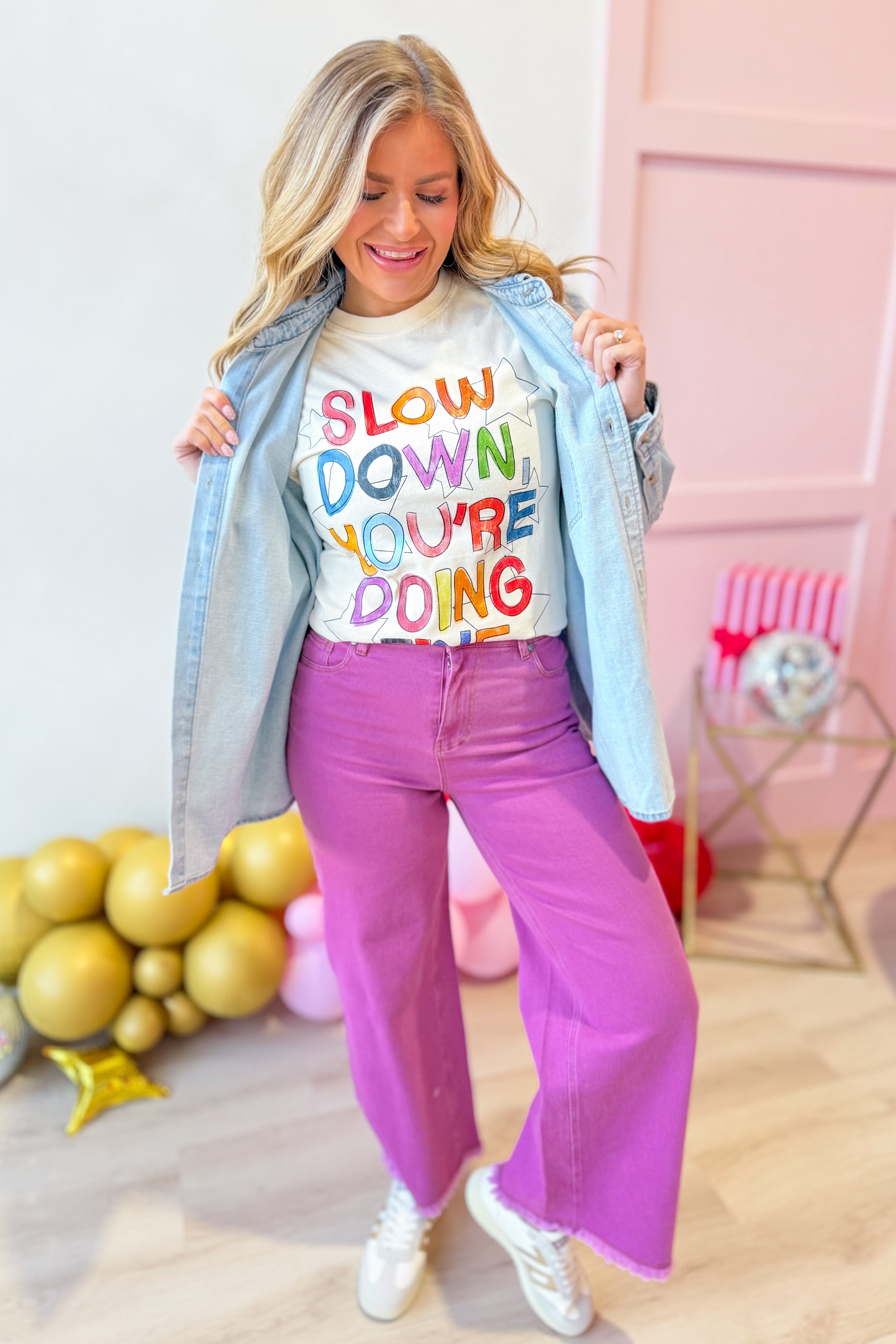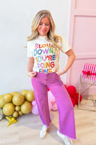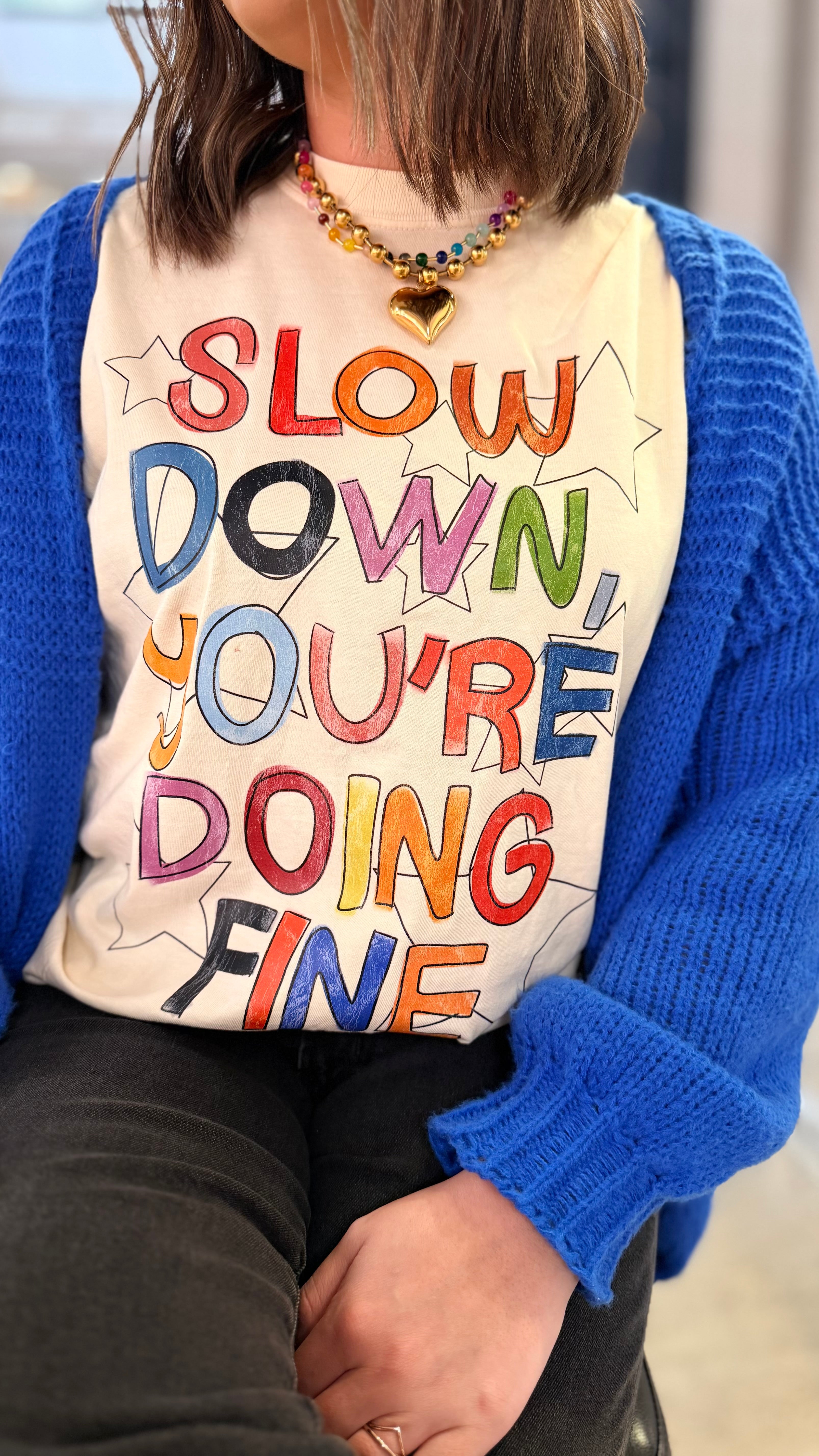 Embrace your chill vibes with this ETTA + EAST graphic tee that's all about keeping it real. Featuring bold bubble letters spelling out "Slow Down, Doing Fine" in vibrant multi-color hues, this short-sleeve crewneck is topped with a fun star detail that adds extra personality. Perfect for anyone who knows how to balance hustle with rest, this tee is your wearable reminder to take it easy and celebrate the good moments. Comfort meets attitude in every wear.