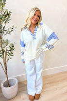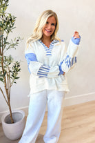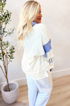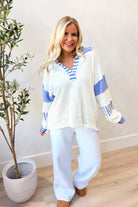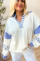 Stay cozy and stylish in the Steffanie French Terry Color Block Pullover by Bucketlist. This oversized sweatshirt features a playful striped color block design and a flattering V-neck, perfect for adding a fun twist to your casual wardrobe. Soft French terry fabric keeps you comfy all day long, whether you're lounging or out and about.