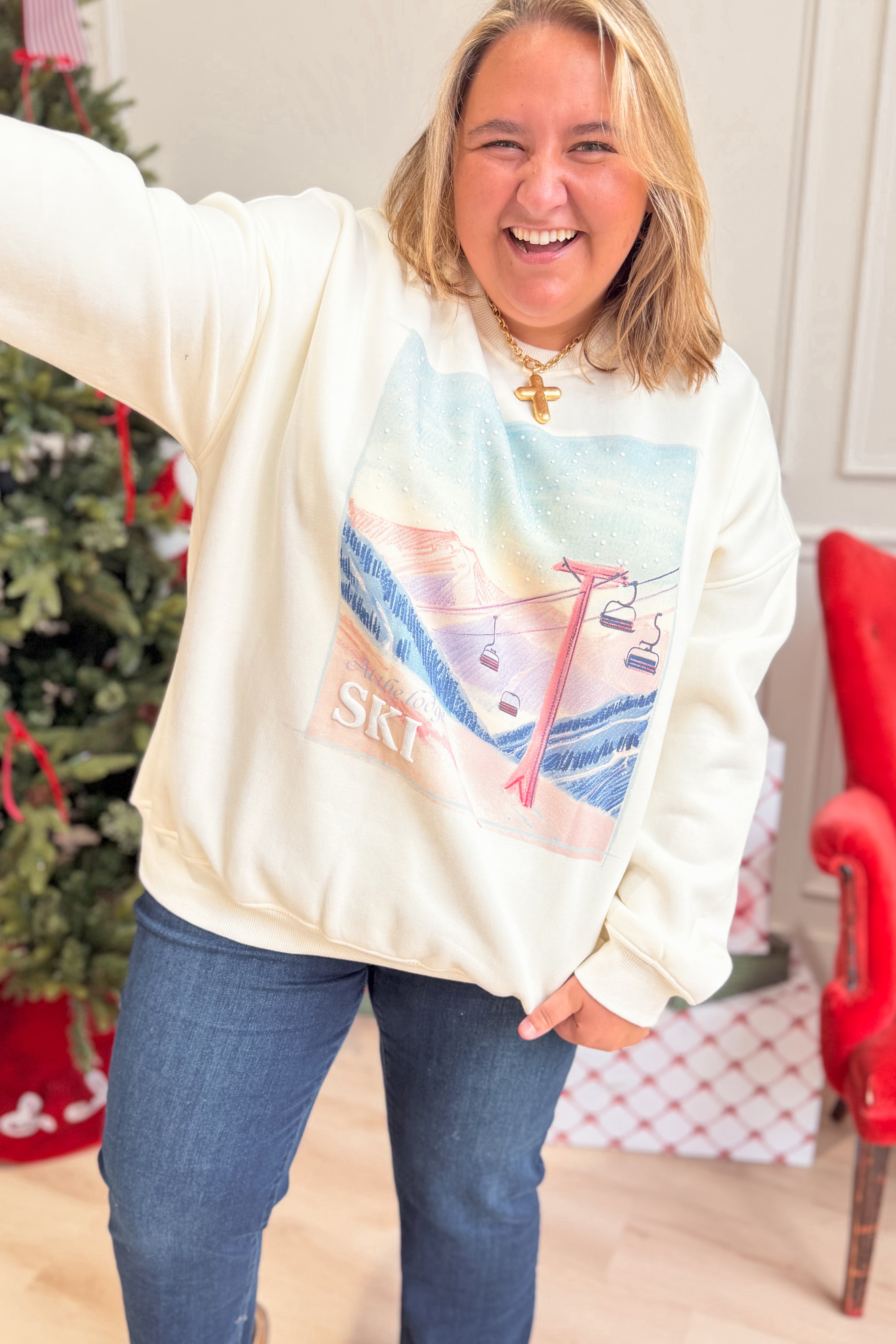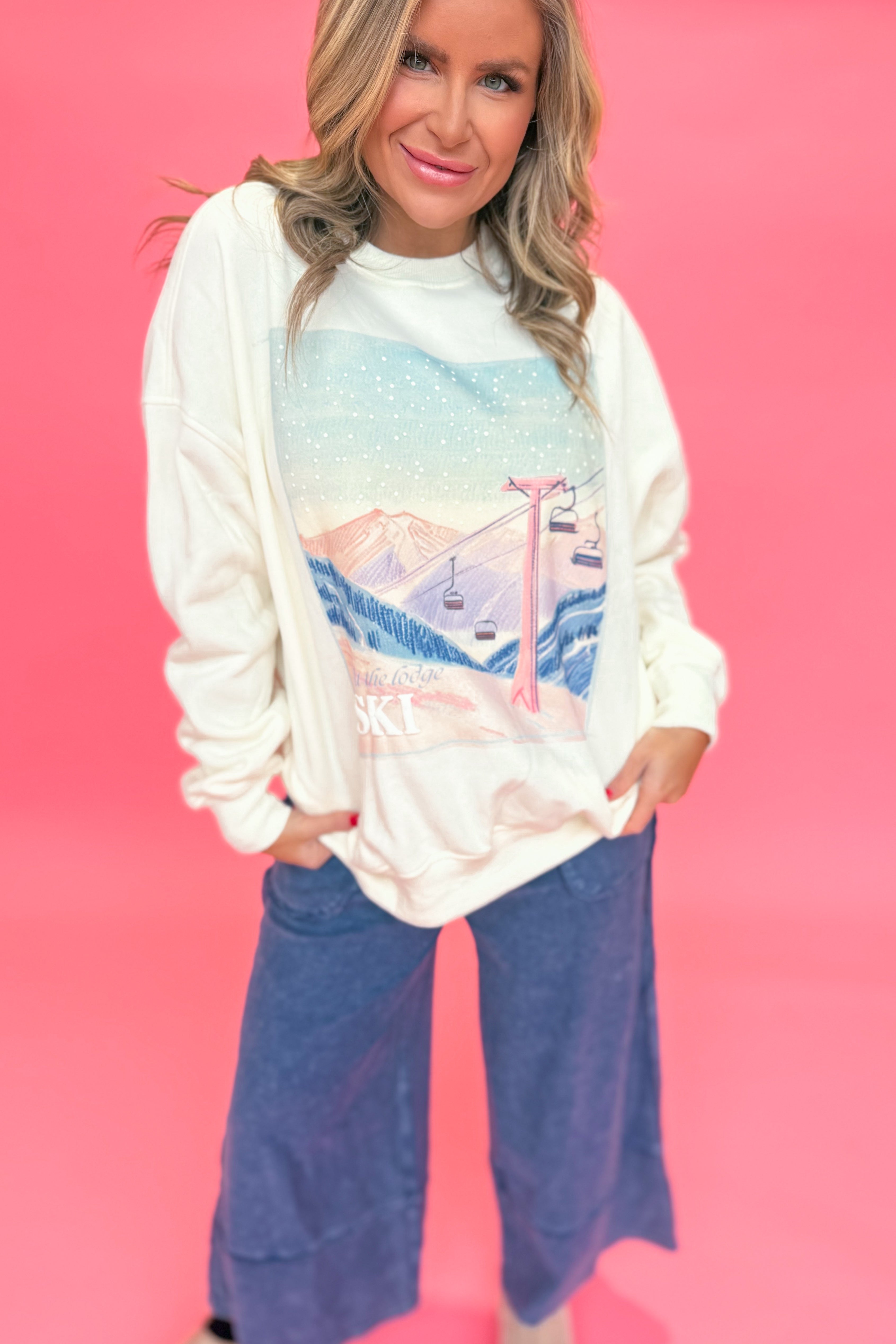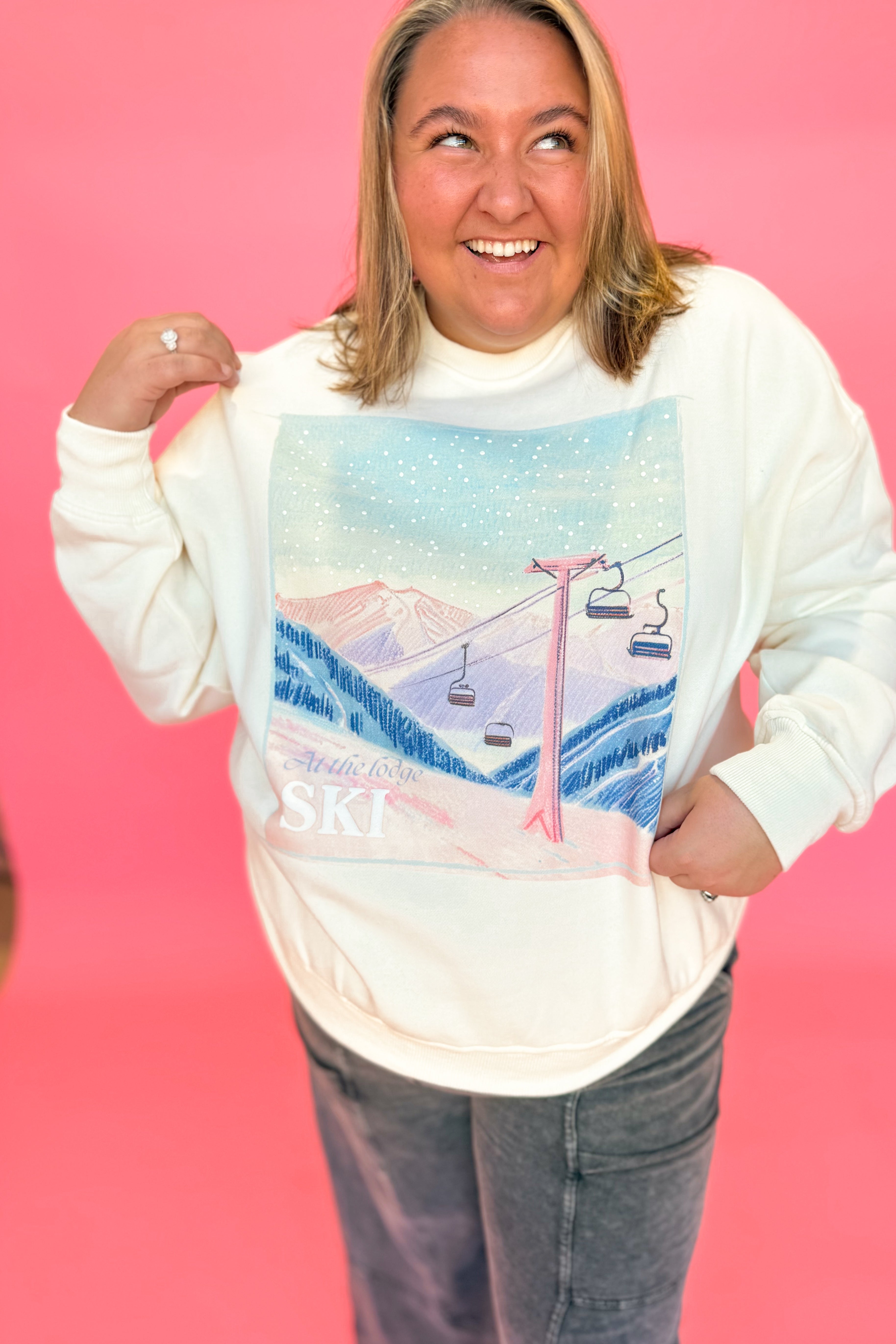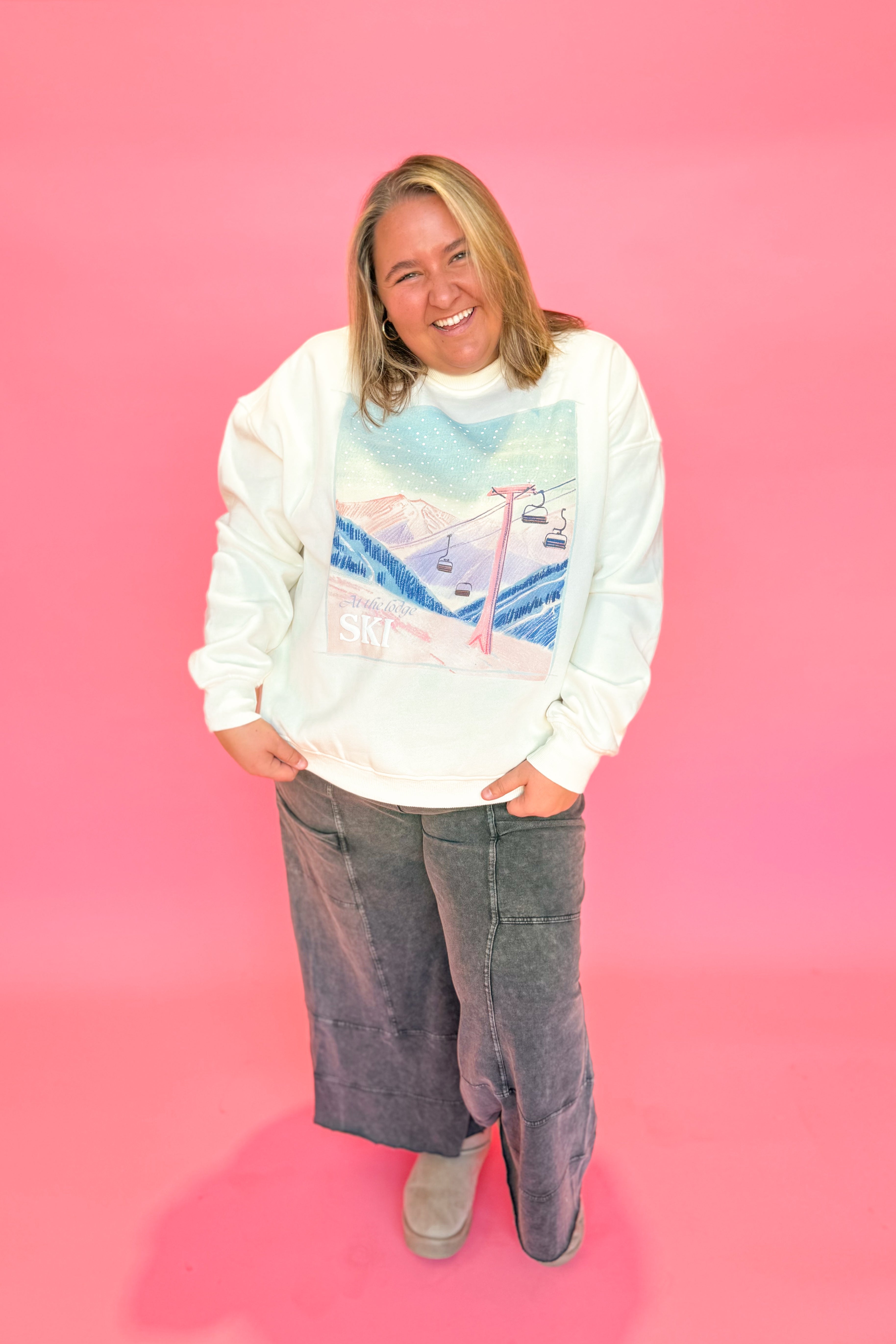 Celebrate the season in cozy style with this plush crewneck sweatshirt featuring charming embroidered ski lodge. Its solid color and long sleeves make it perfect for chilly days, while the soft fabric keeps you comfy all day long.