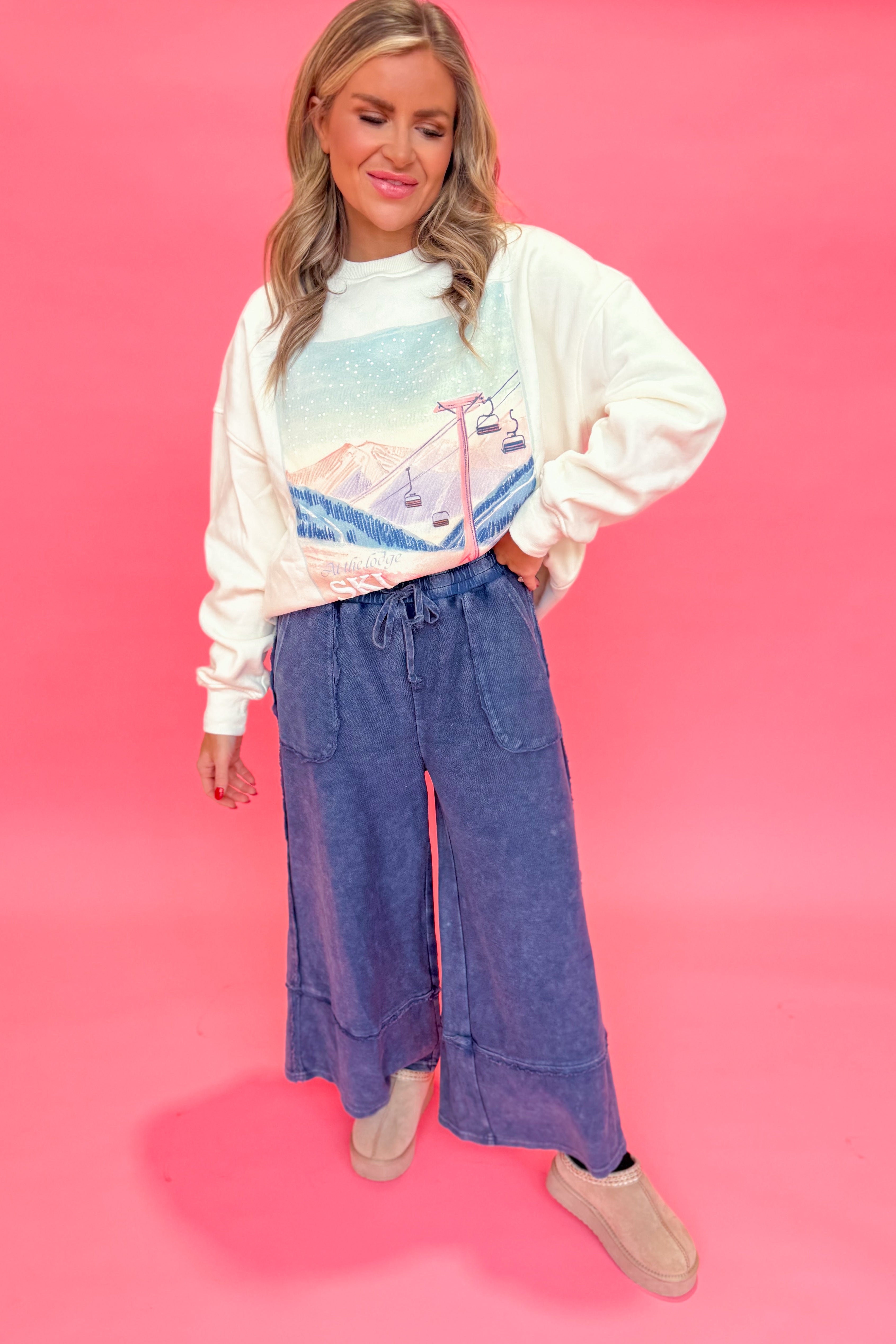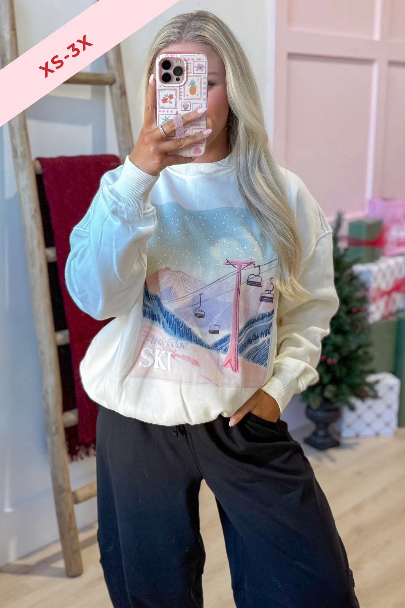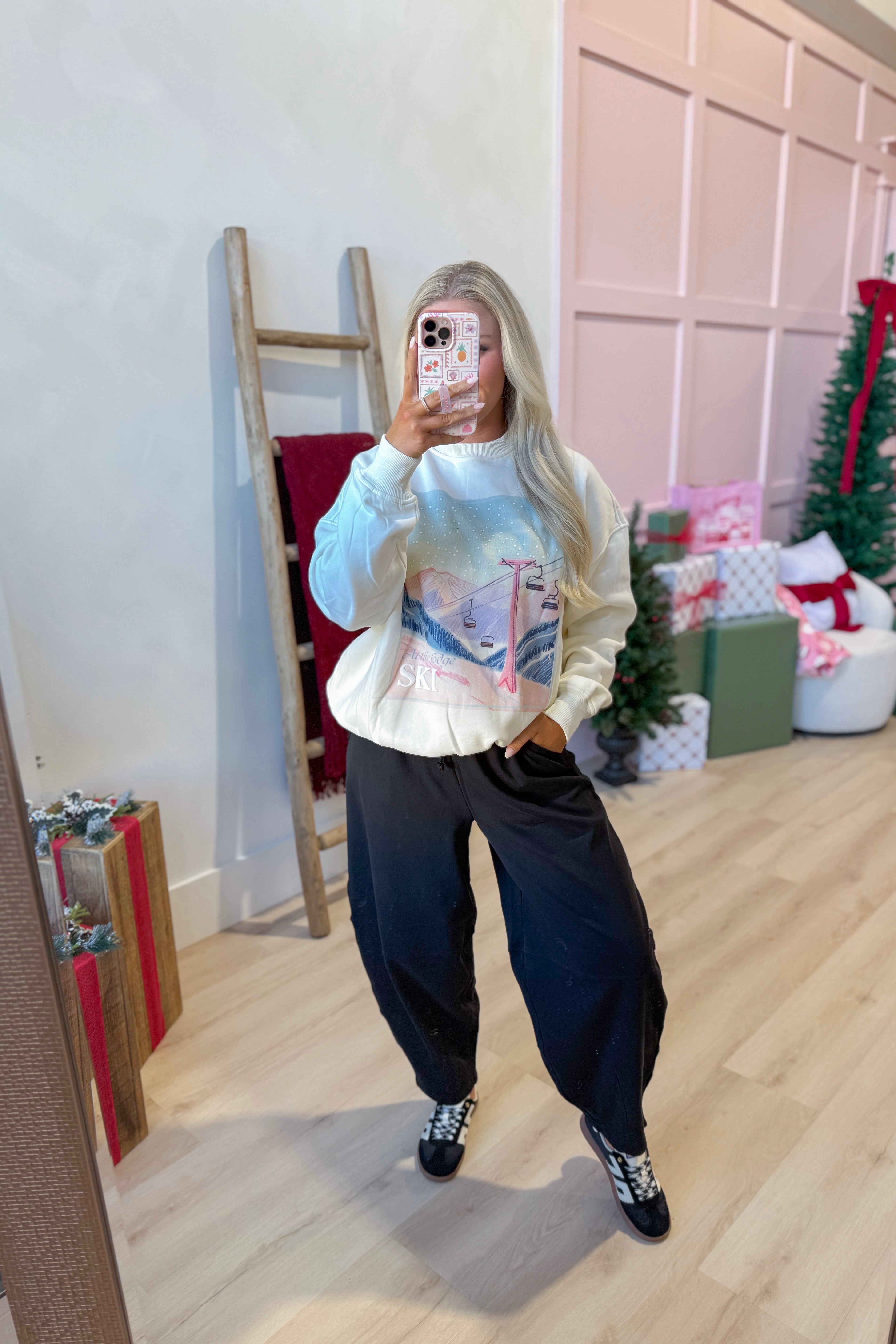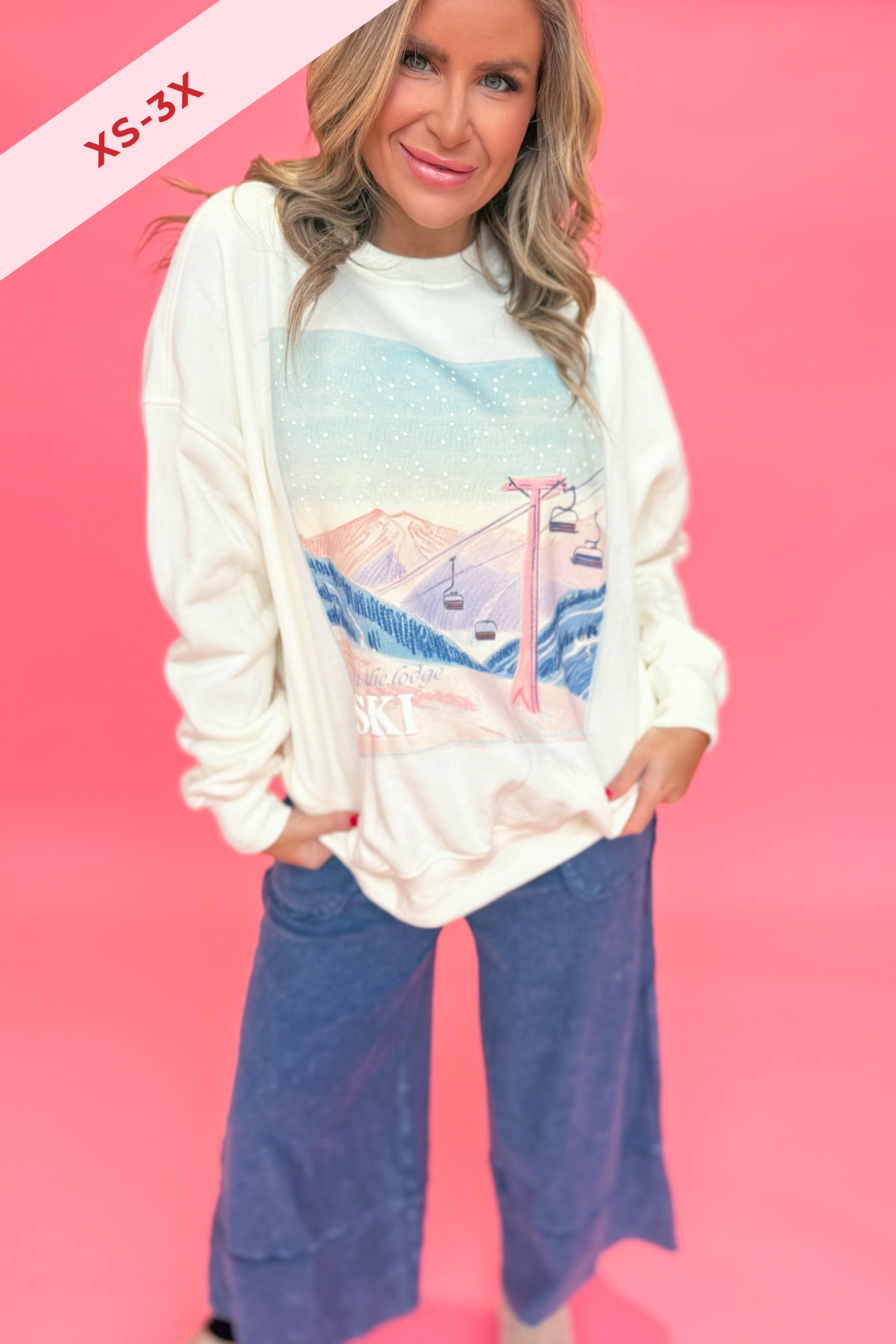 Celebrate the season in cozy style with this plush crewneck sweatshirt featuring charming embroidered ski lodge. Its solid color and long sleeves make it perfect for chilly days, while the soft fabric keeps you comfy all day long.