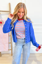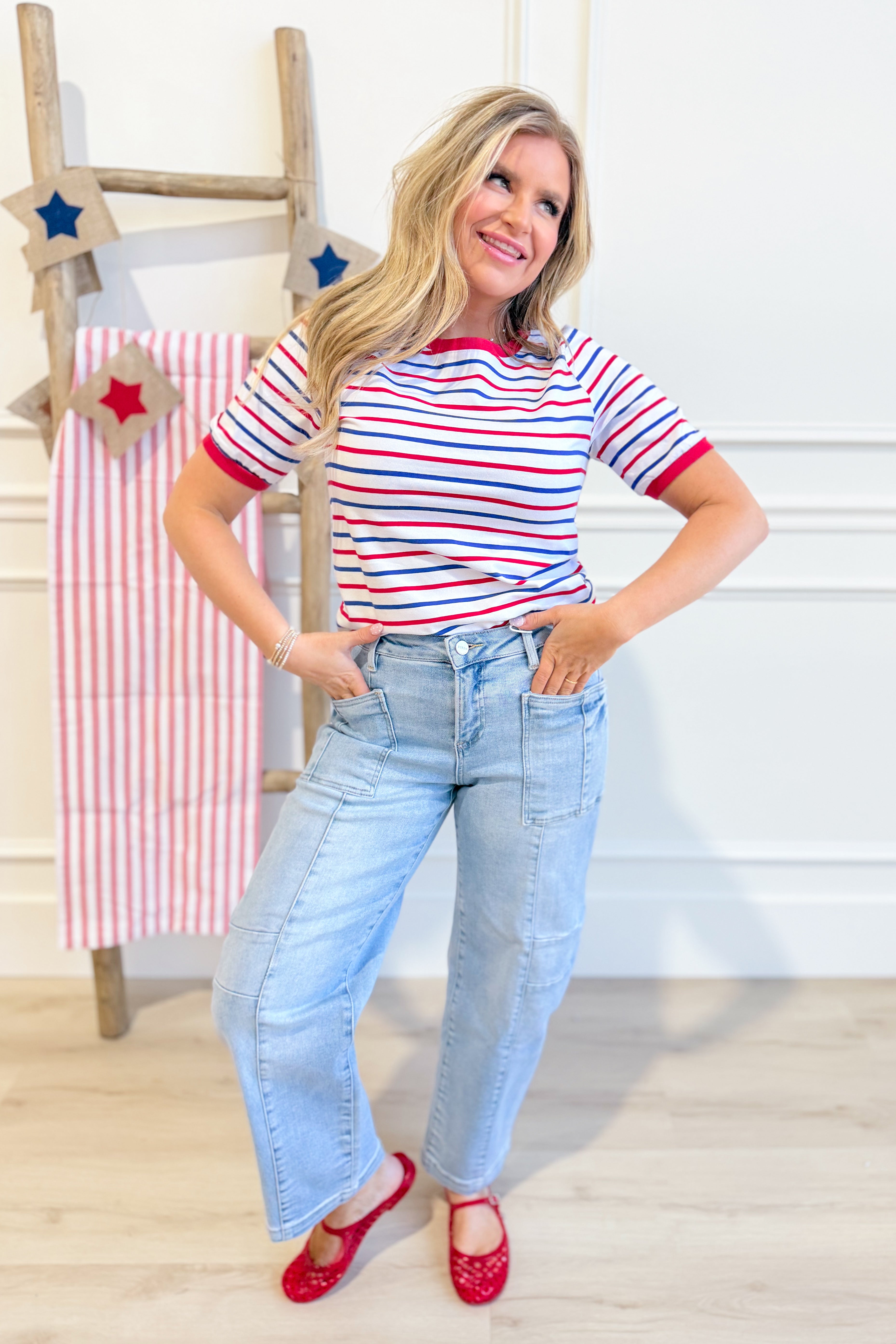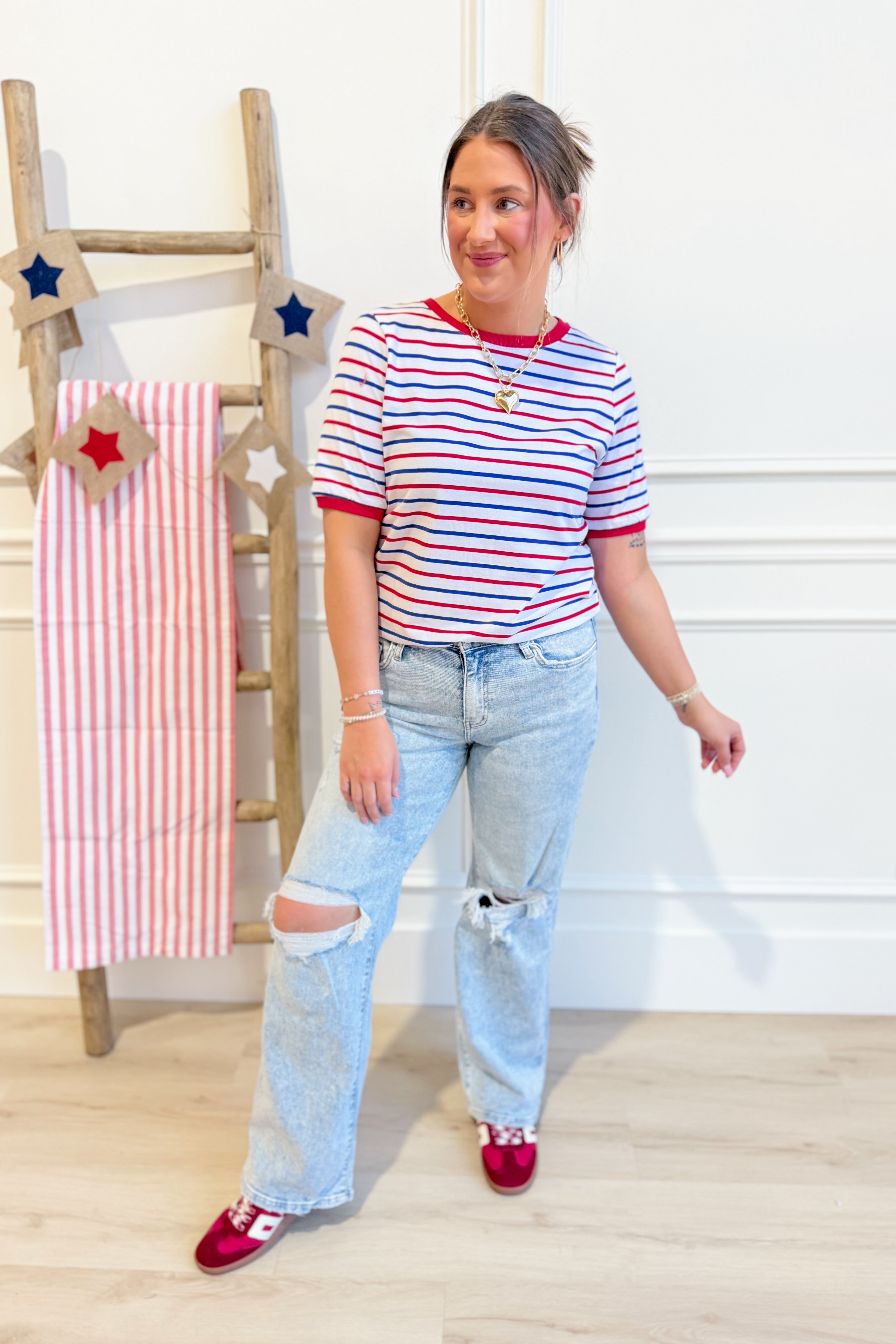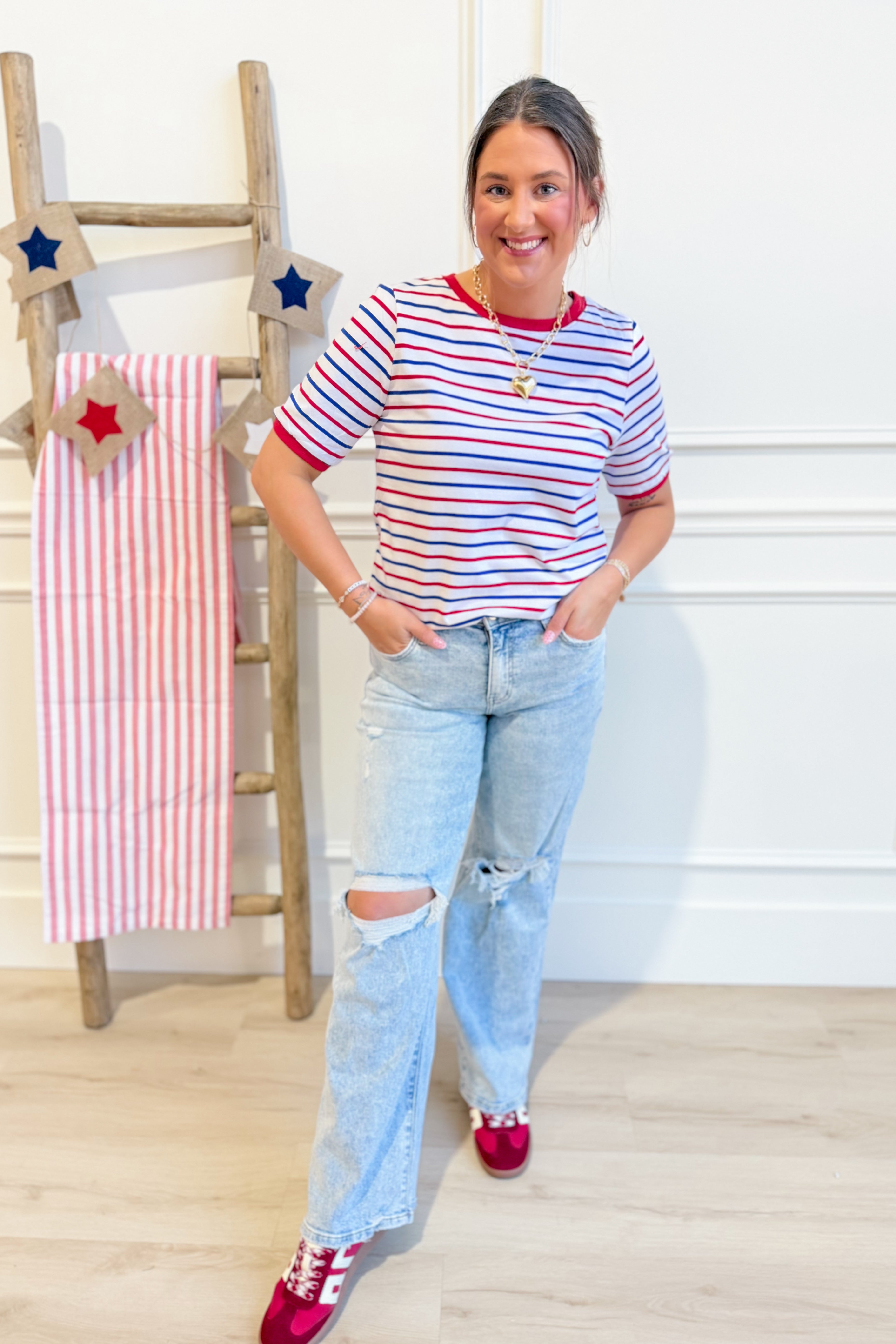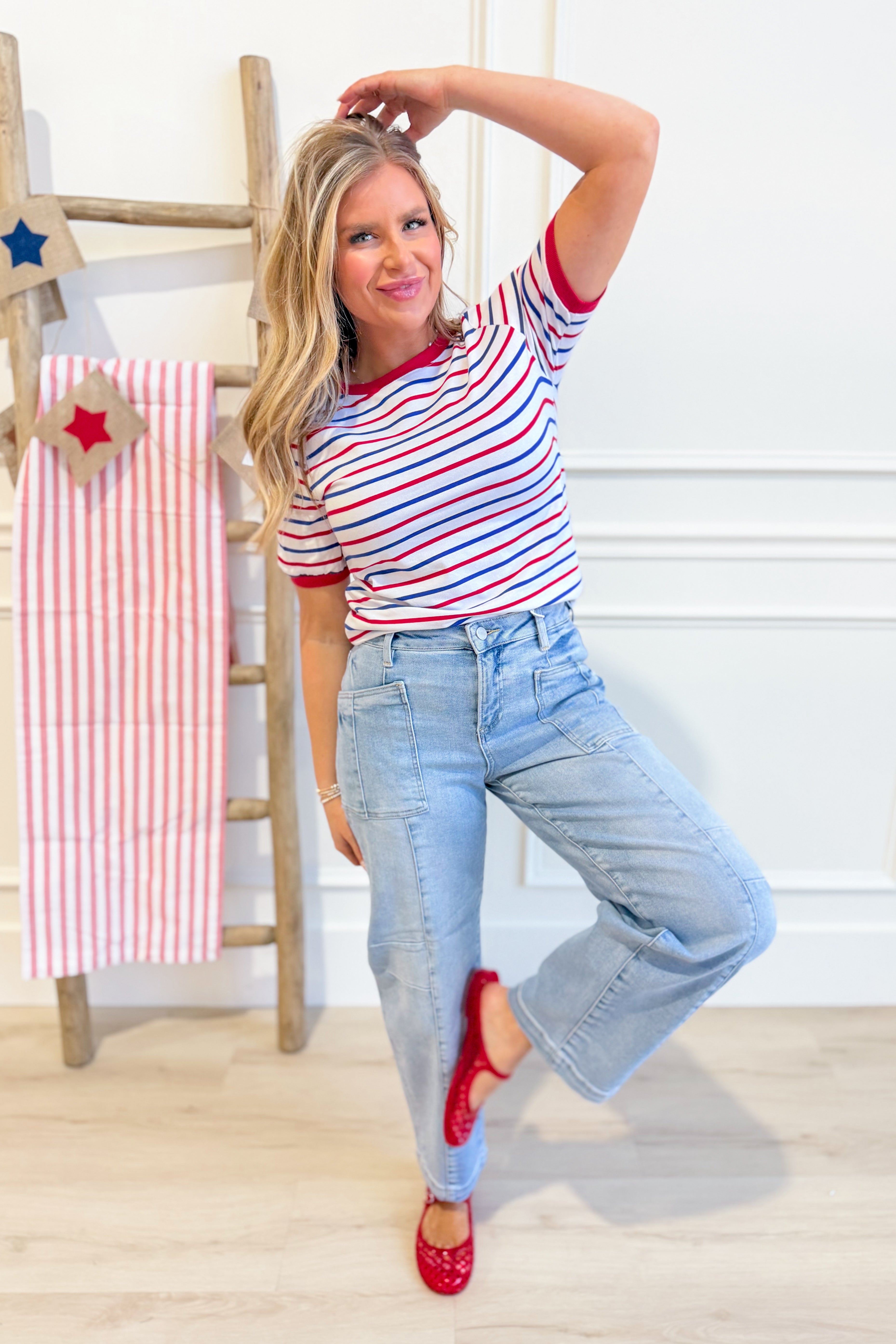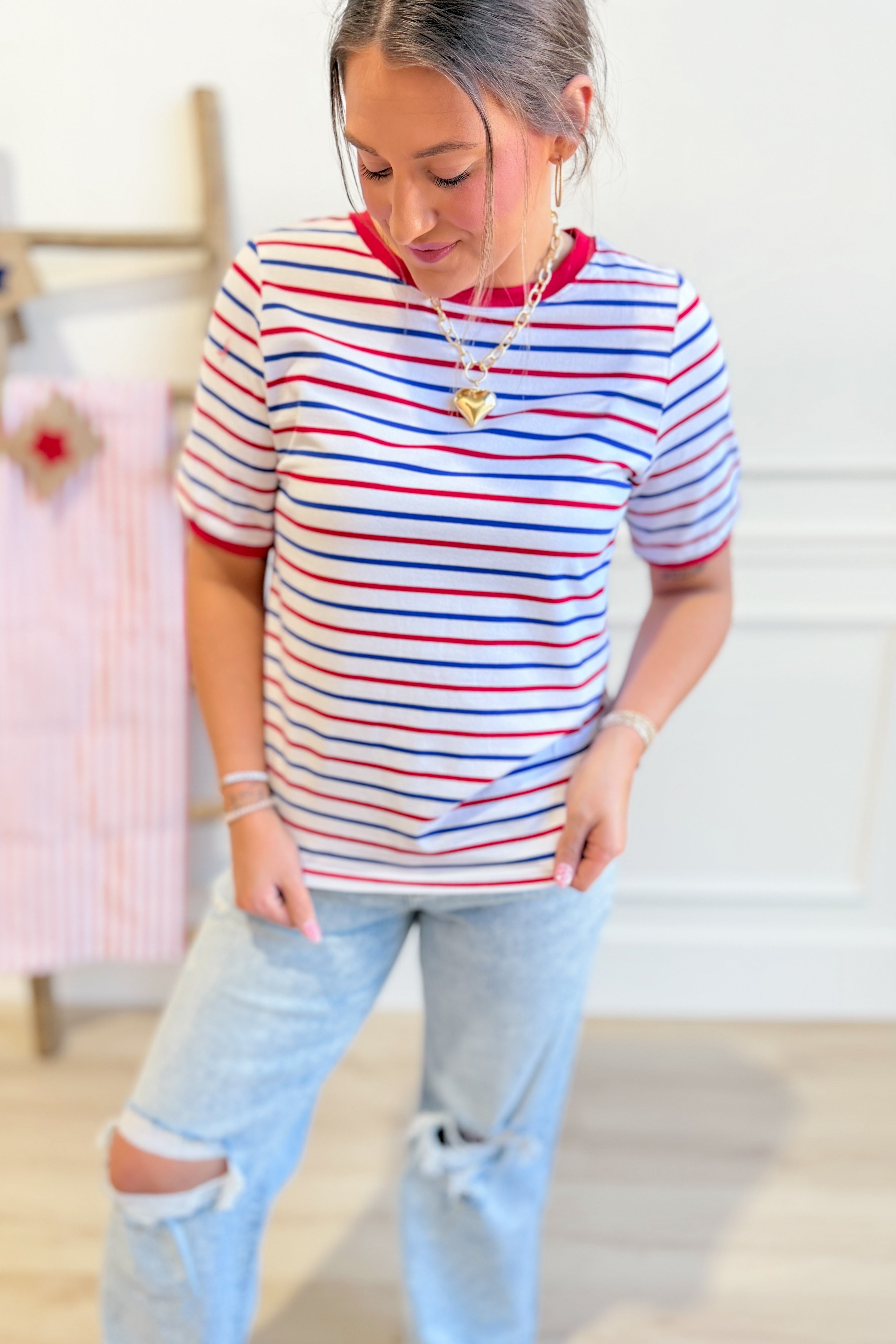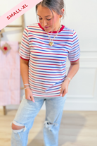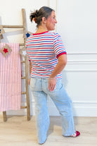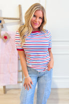 The Theo Striped Crewneck is your go-to for effortless style. This Staccato classic features bold stripes with crisp solid trim and a comfortable crew neckline—perfect for mixing and matching with your everyday wardrobe. Short sleeves keep things breezy, whether you're heading to brunch or running errands. Simple, versatile, and always in rotation.