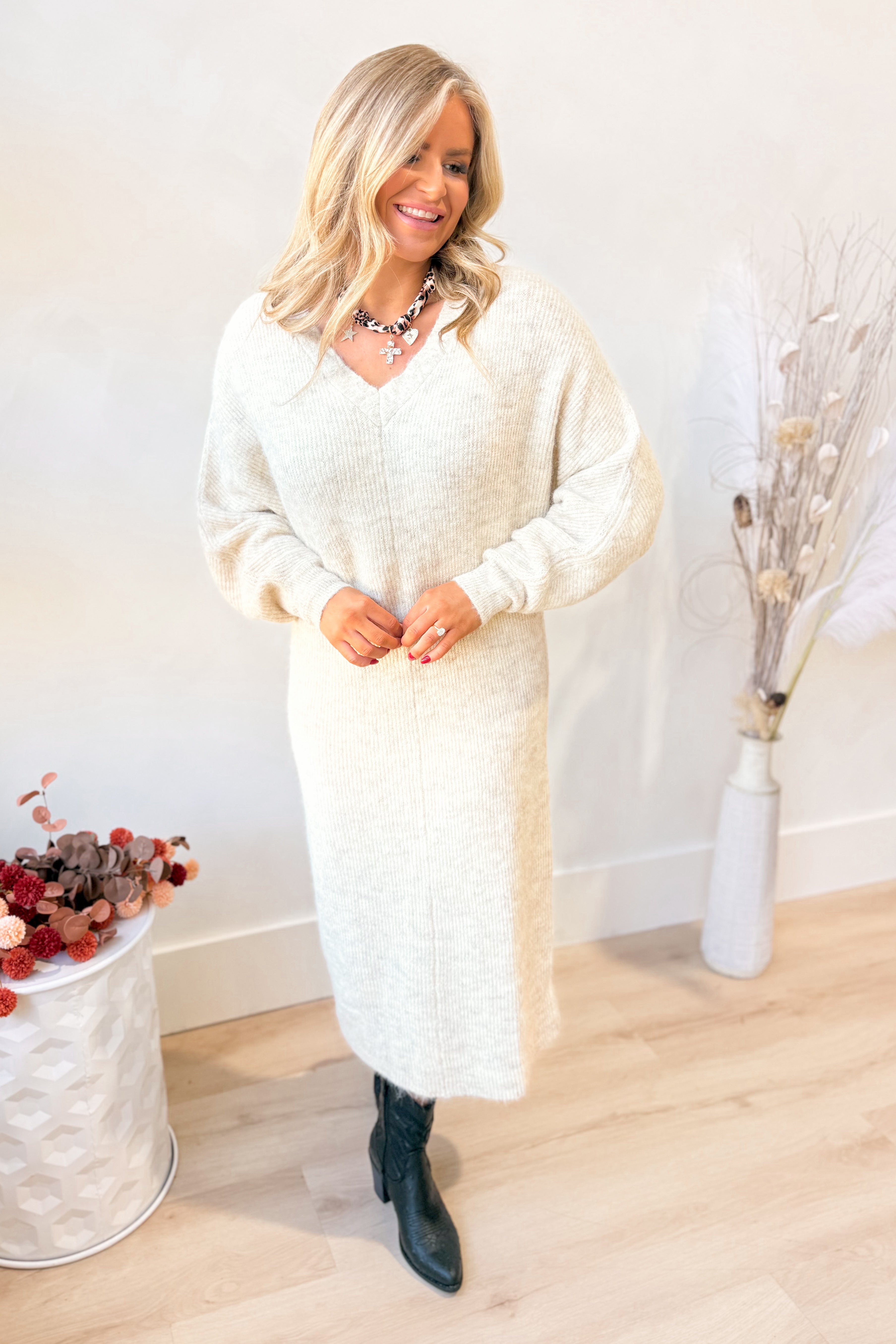 Step into cozy style with the Vinny Sweater Knit Maxi Dress. Featuring a flattering V-neck and long sleeves, this solid, stretchy dress hugs you just right while keeping things effortlessly chic. Perfect for lounging or dressing up, it combines comfort with playful elegance from head to toe.